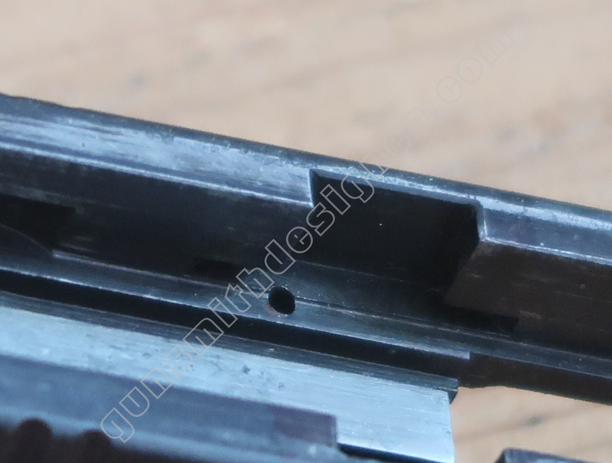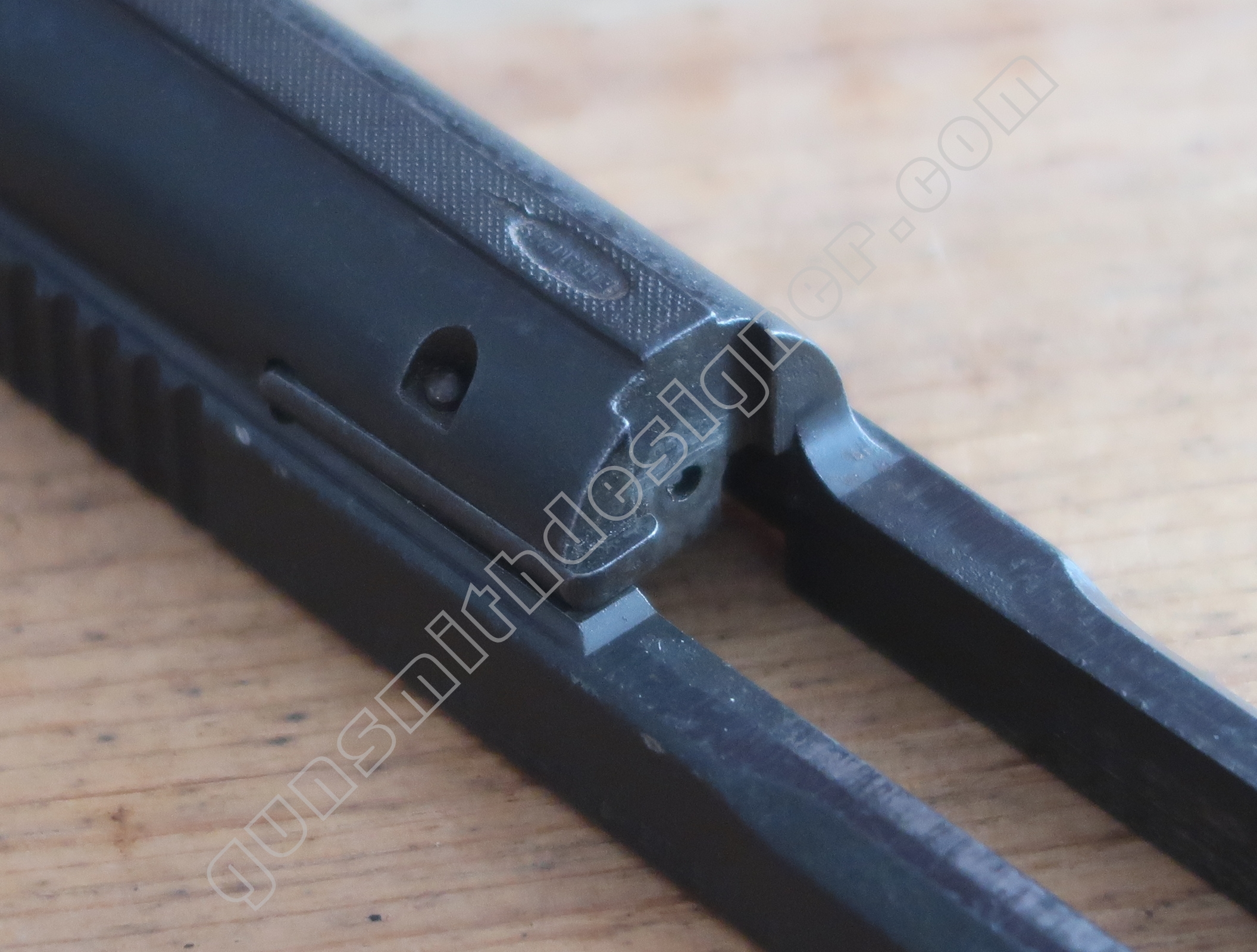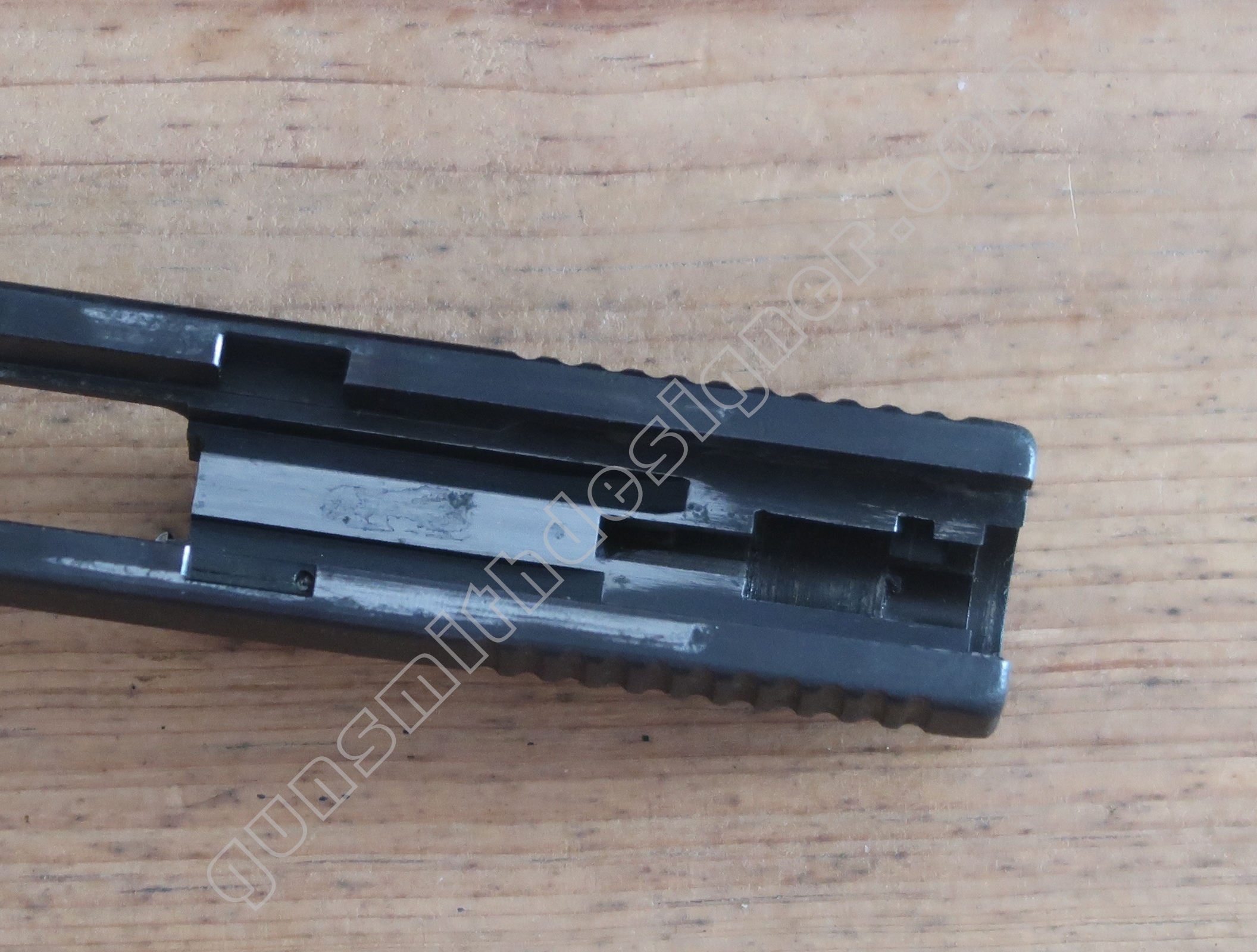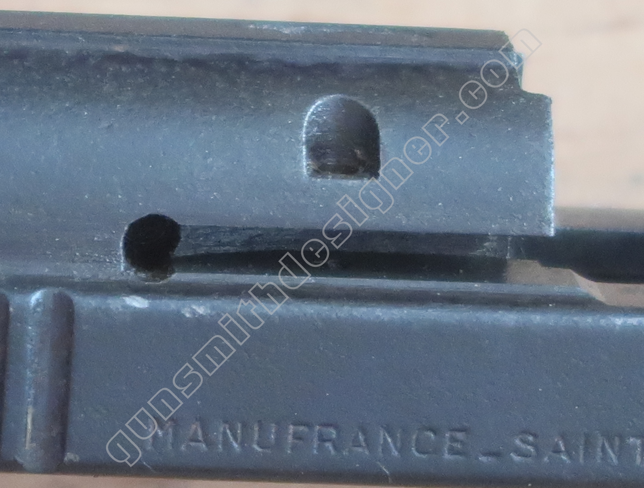 On retrouve en dessous de la culasse les rails de guidage de la culasse. Les encoches de bras relais de ressort récupérateur.