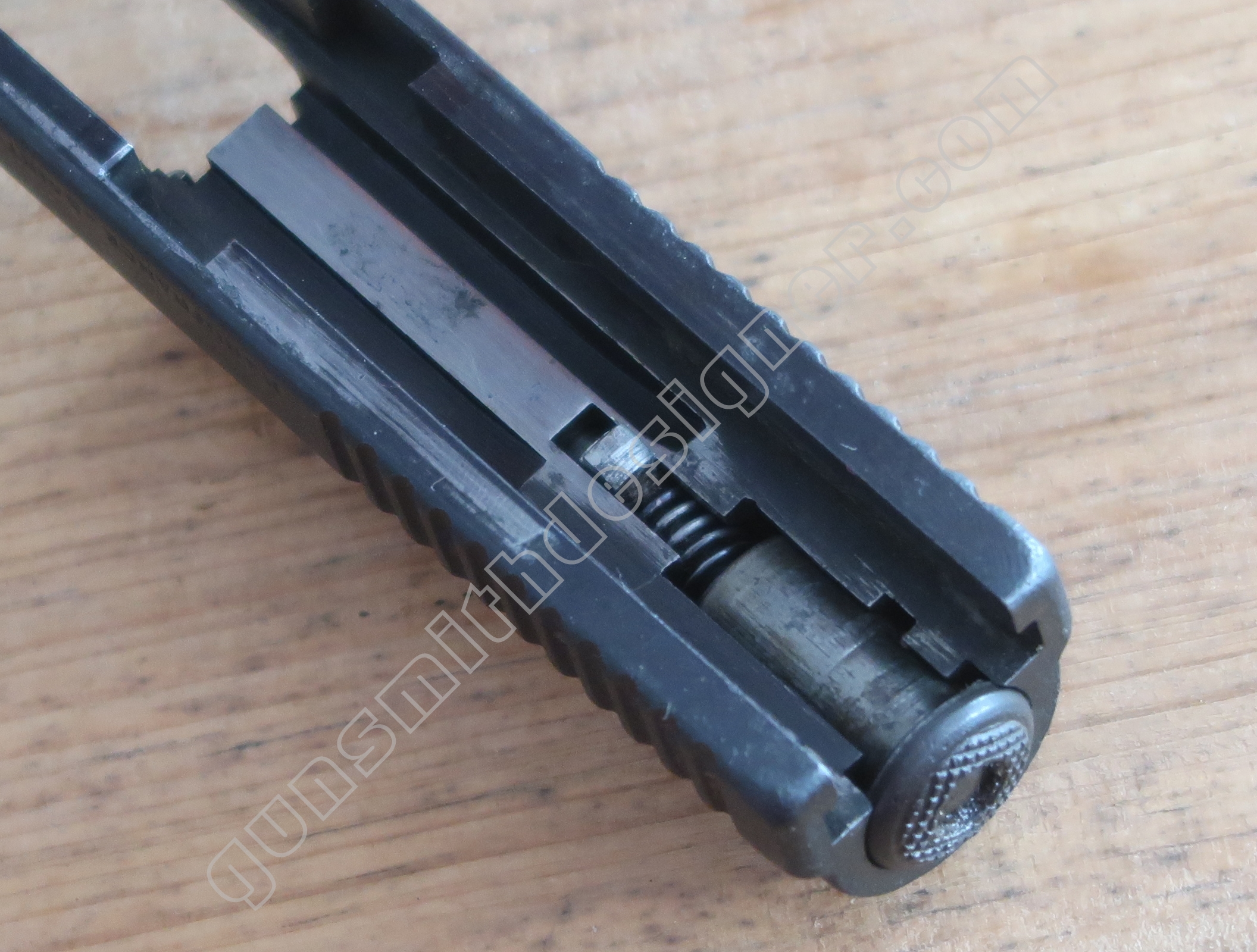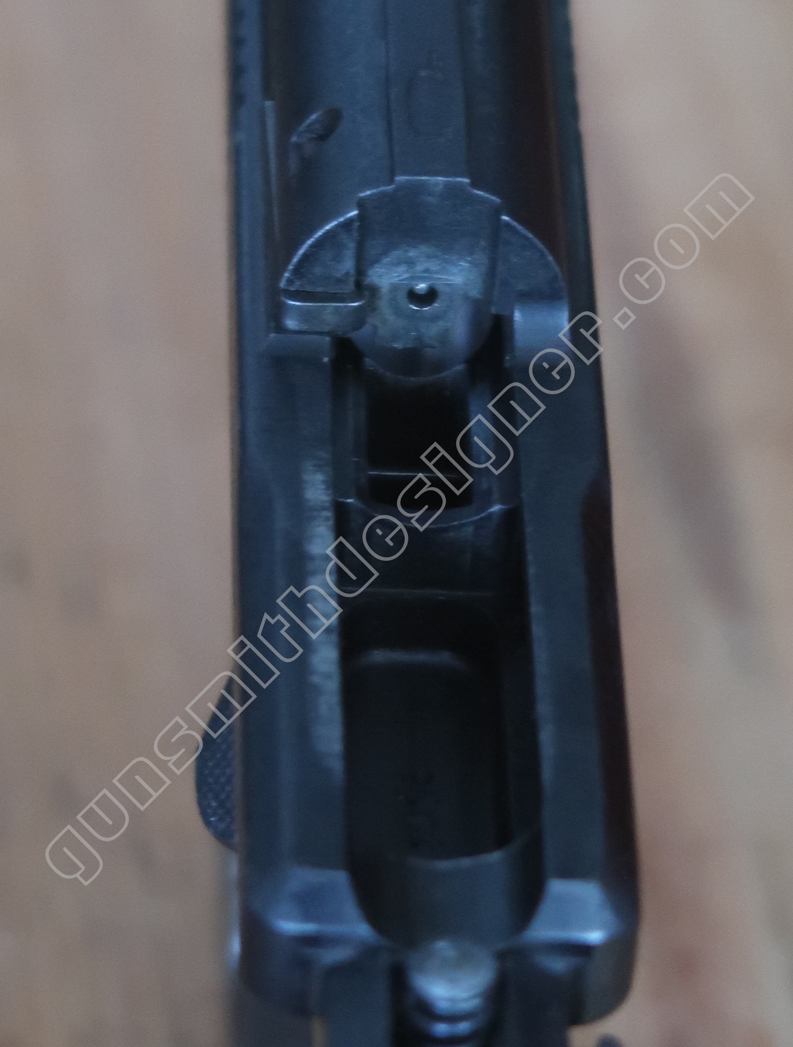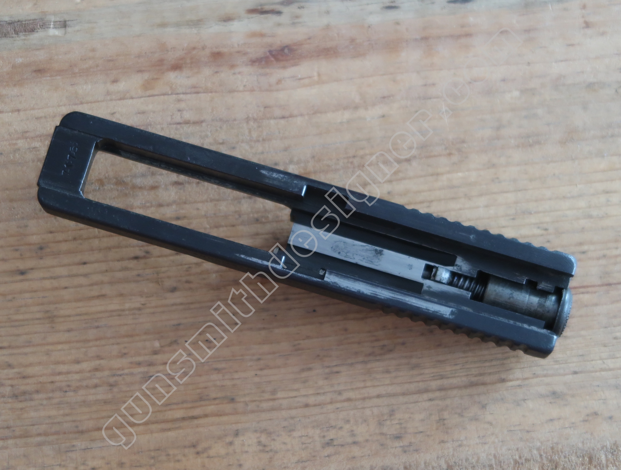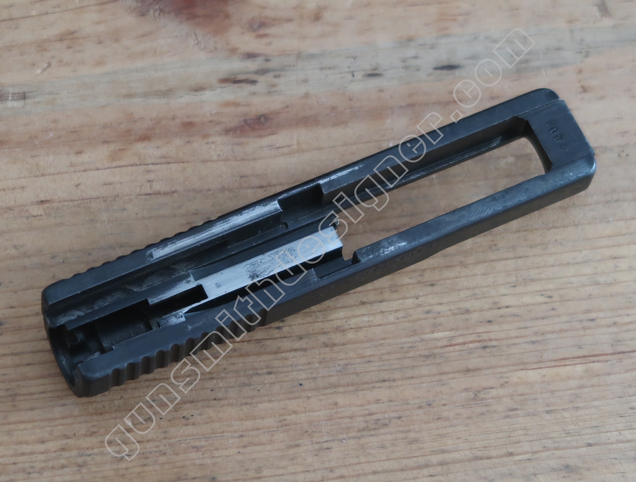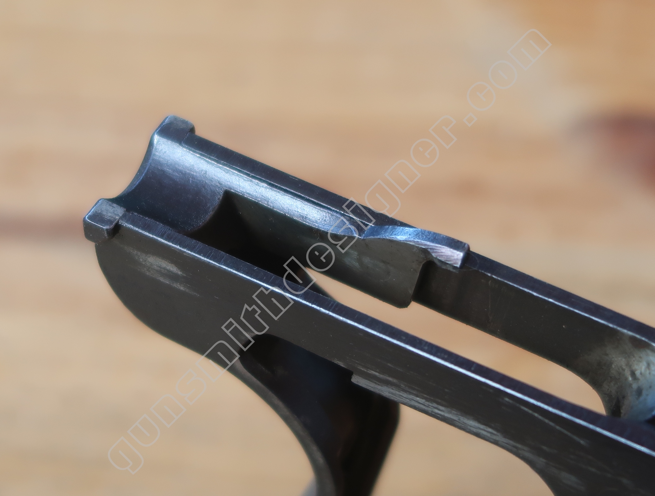 On retrouve en dessous de la culasse les rails de guidage de la culasse. Les encoches de bras relais de ressort récupérateur.