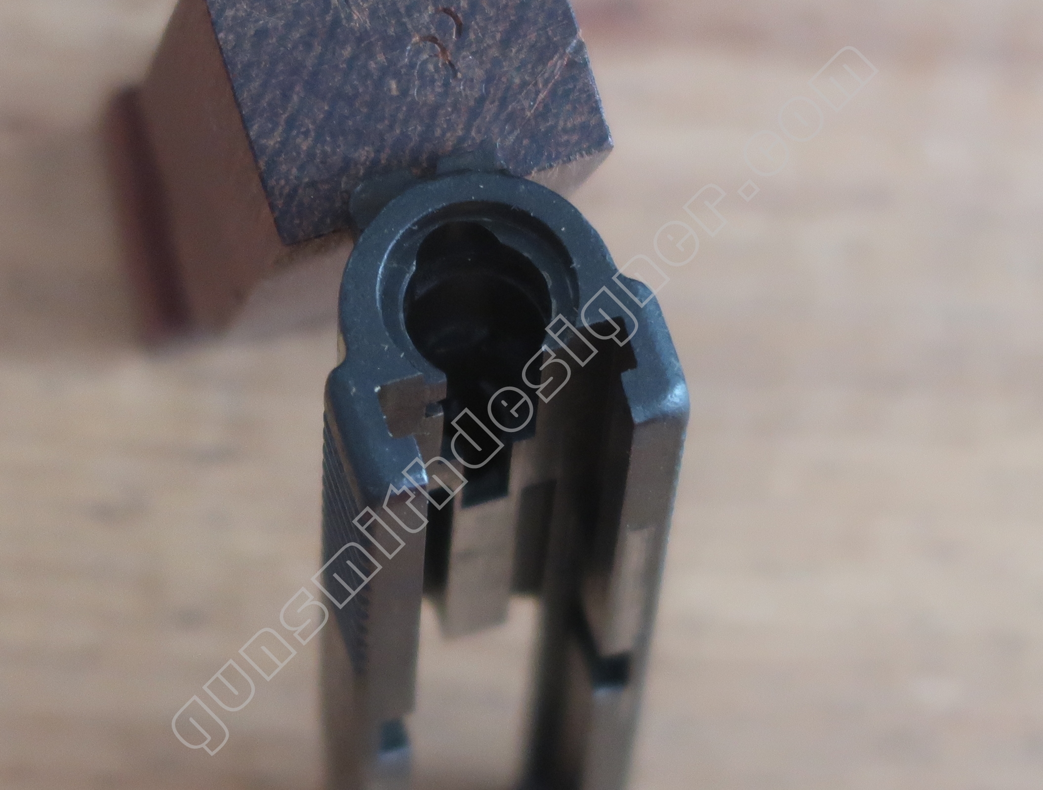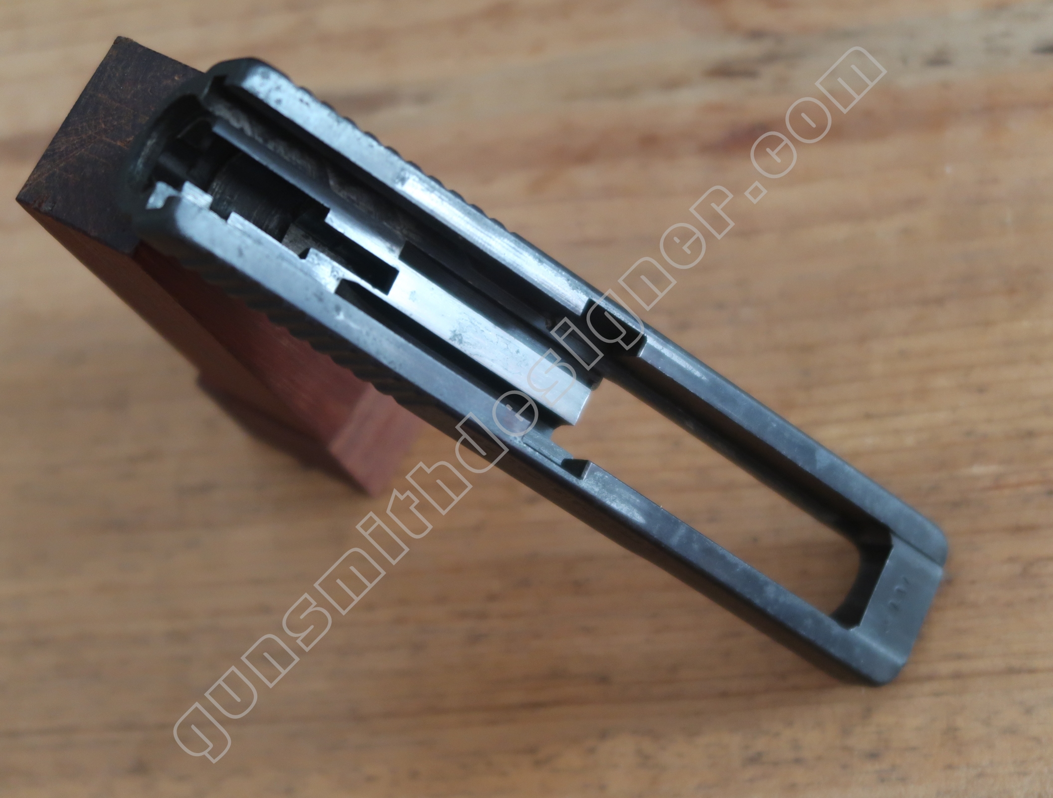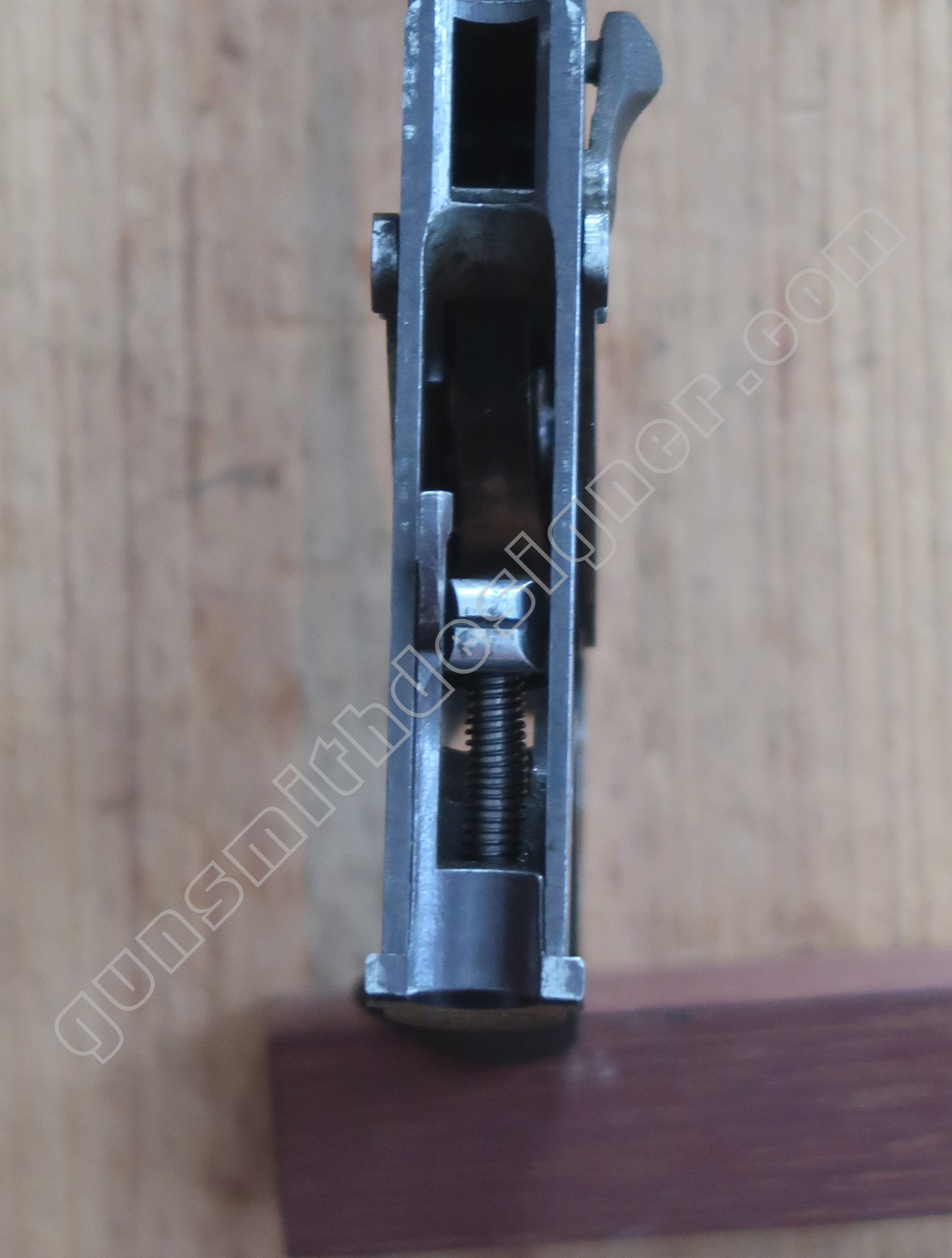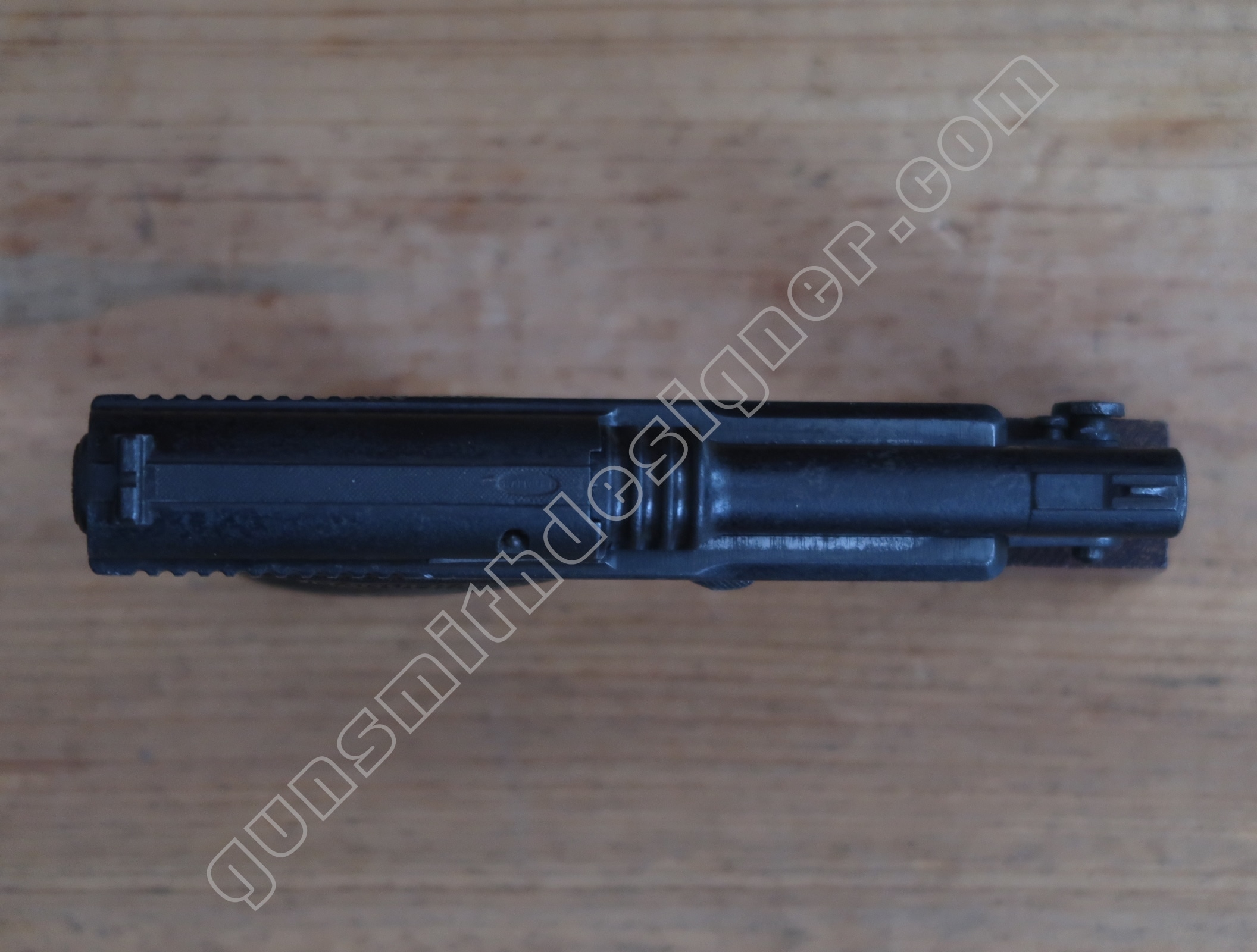 On retrouve en dessous de la culasse les rails de guidage de la culasse. Les encoches de bras relais de ressort récupérateur.