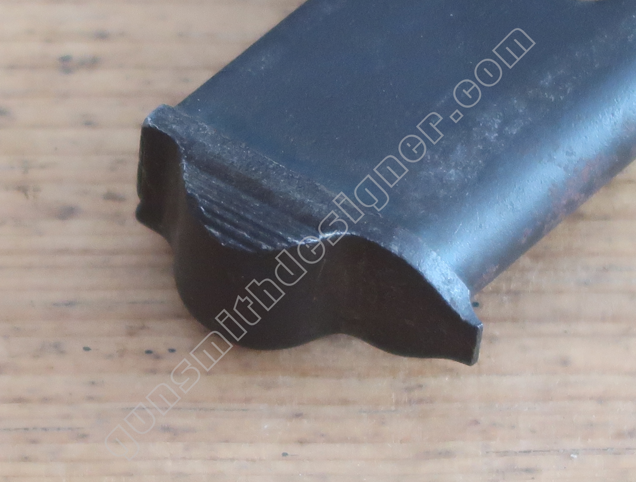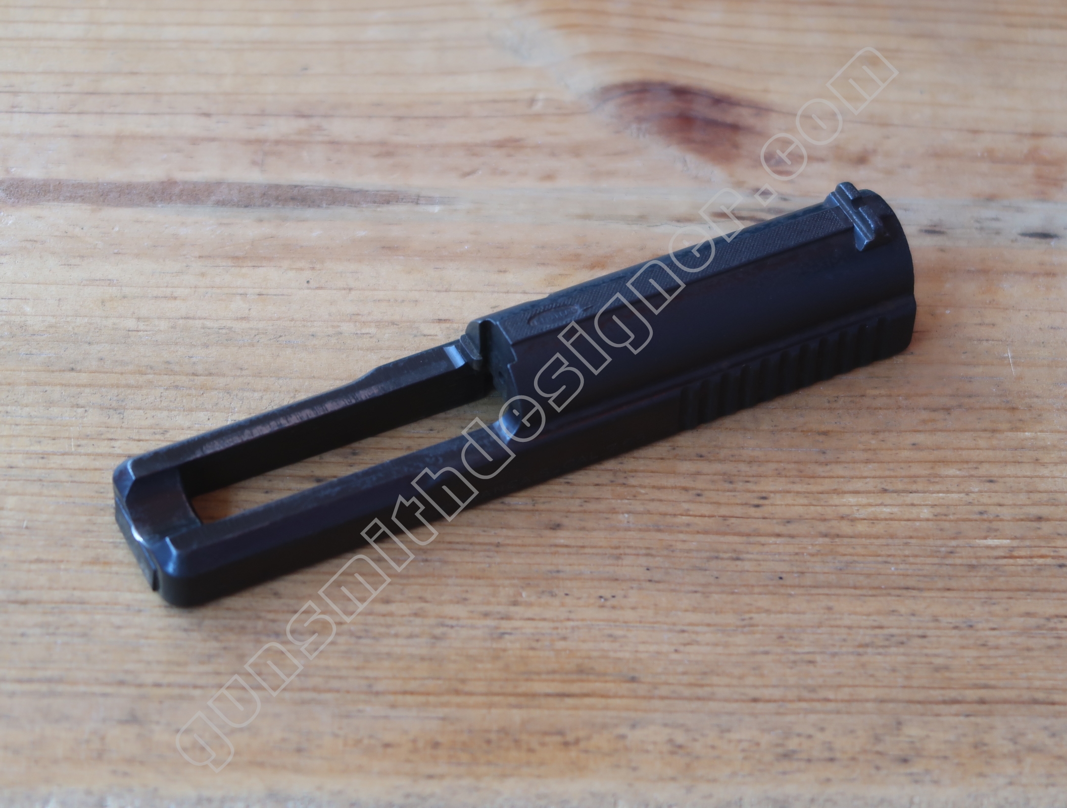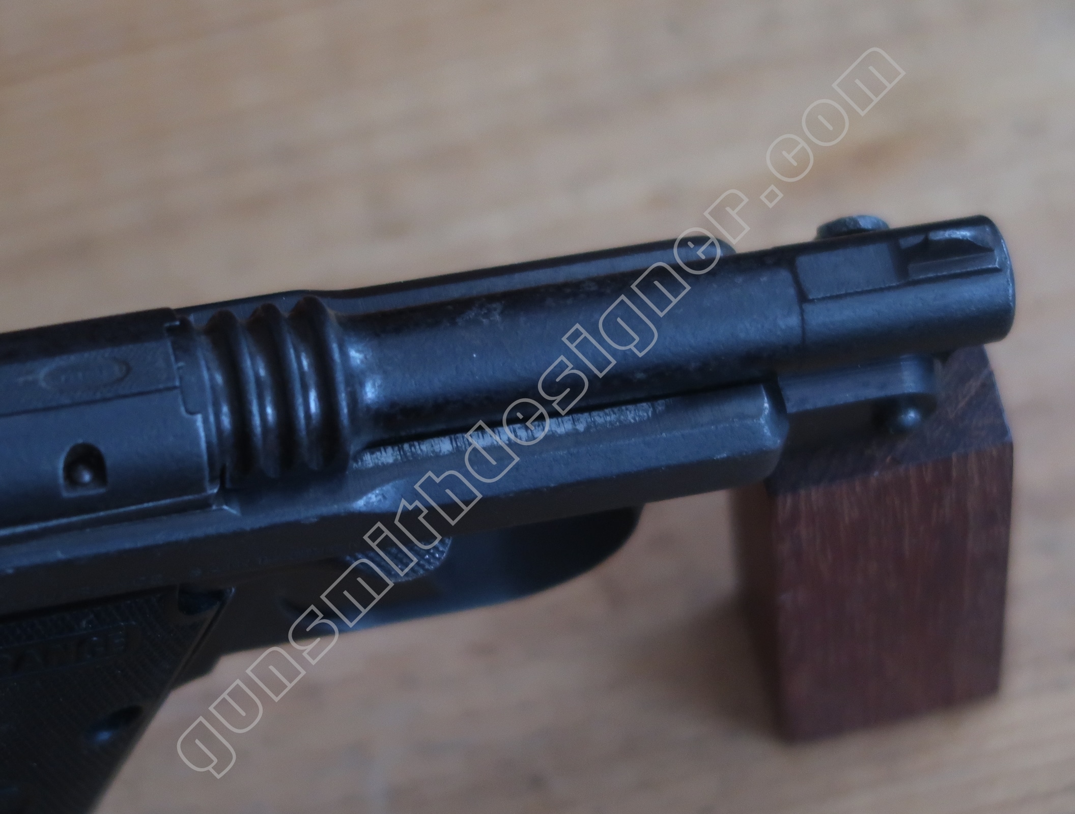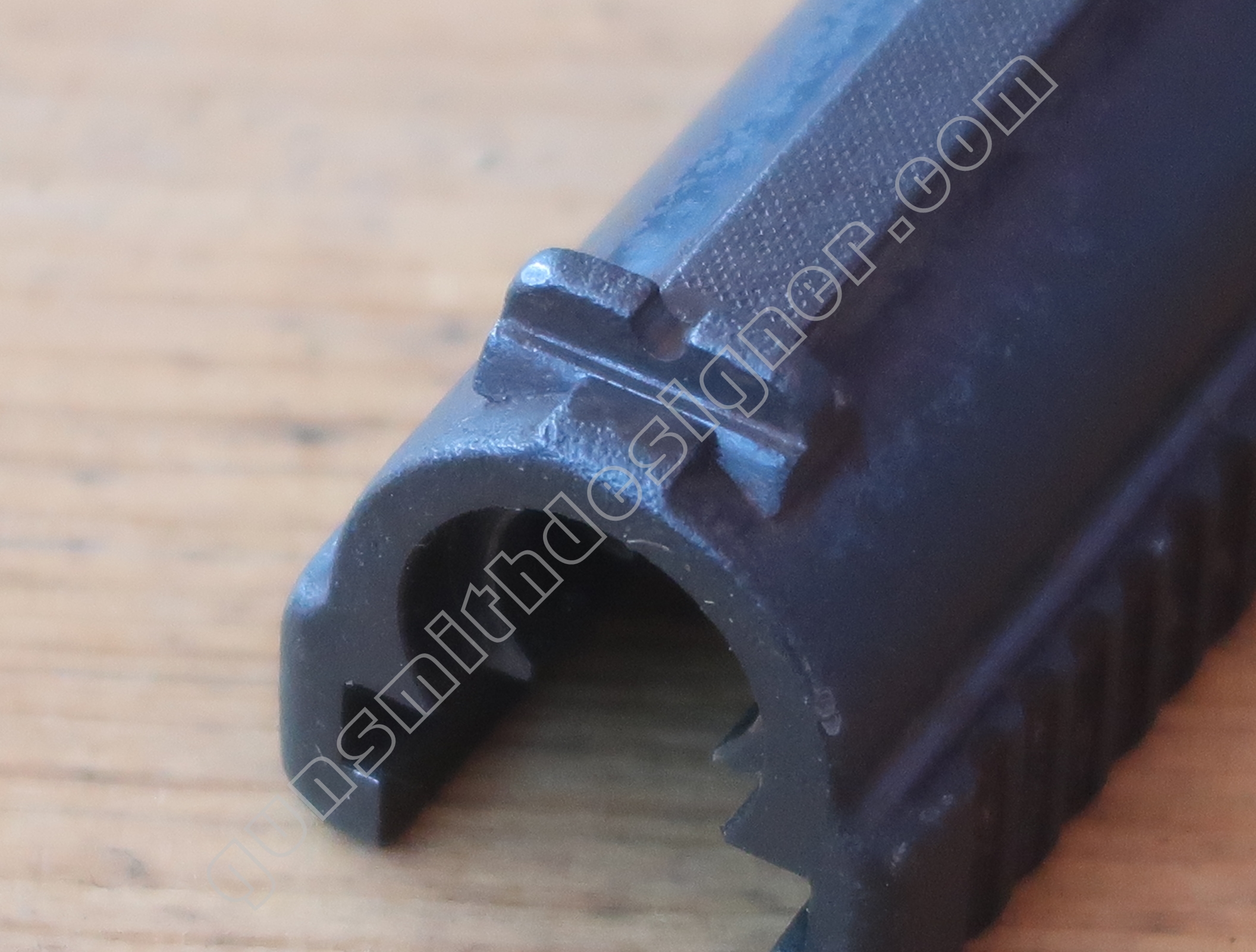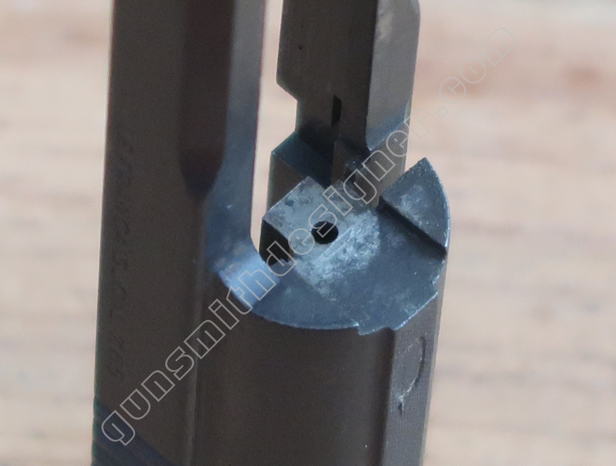 On retrouve en dessous de la culasse les rails de guidage de la culasse. Les encoches de bras relais de ressort récupérateur.