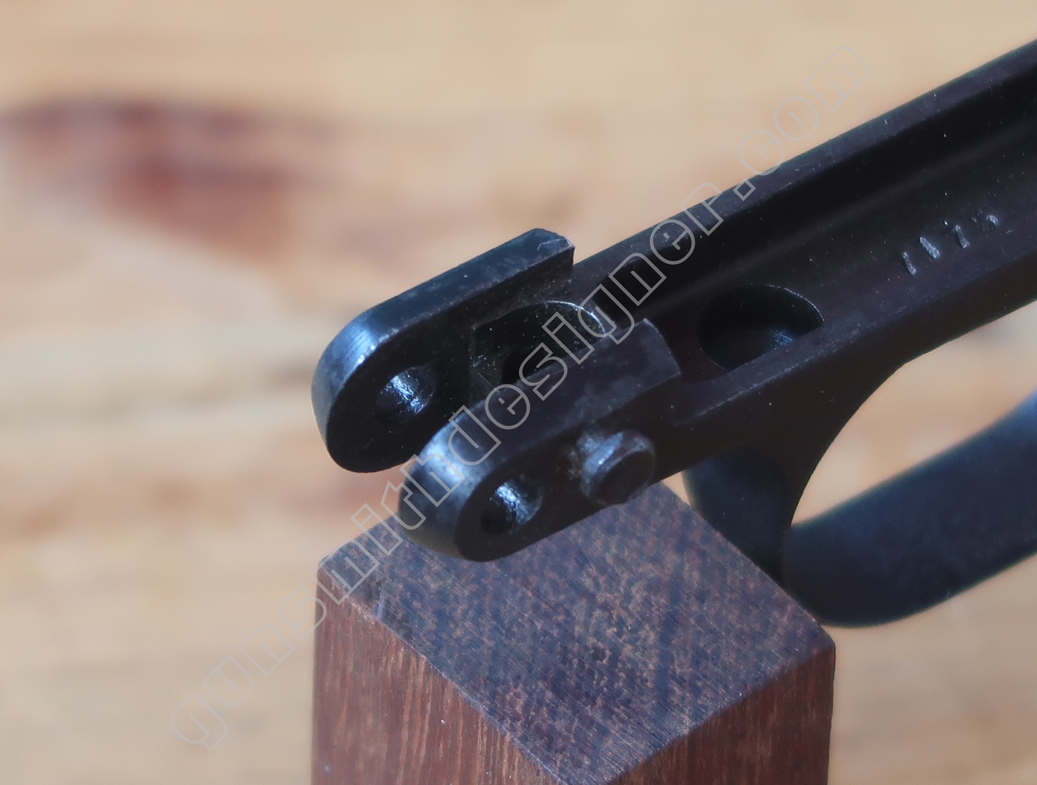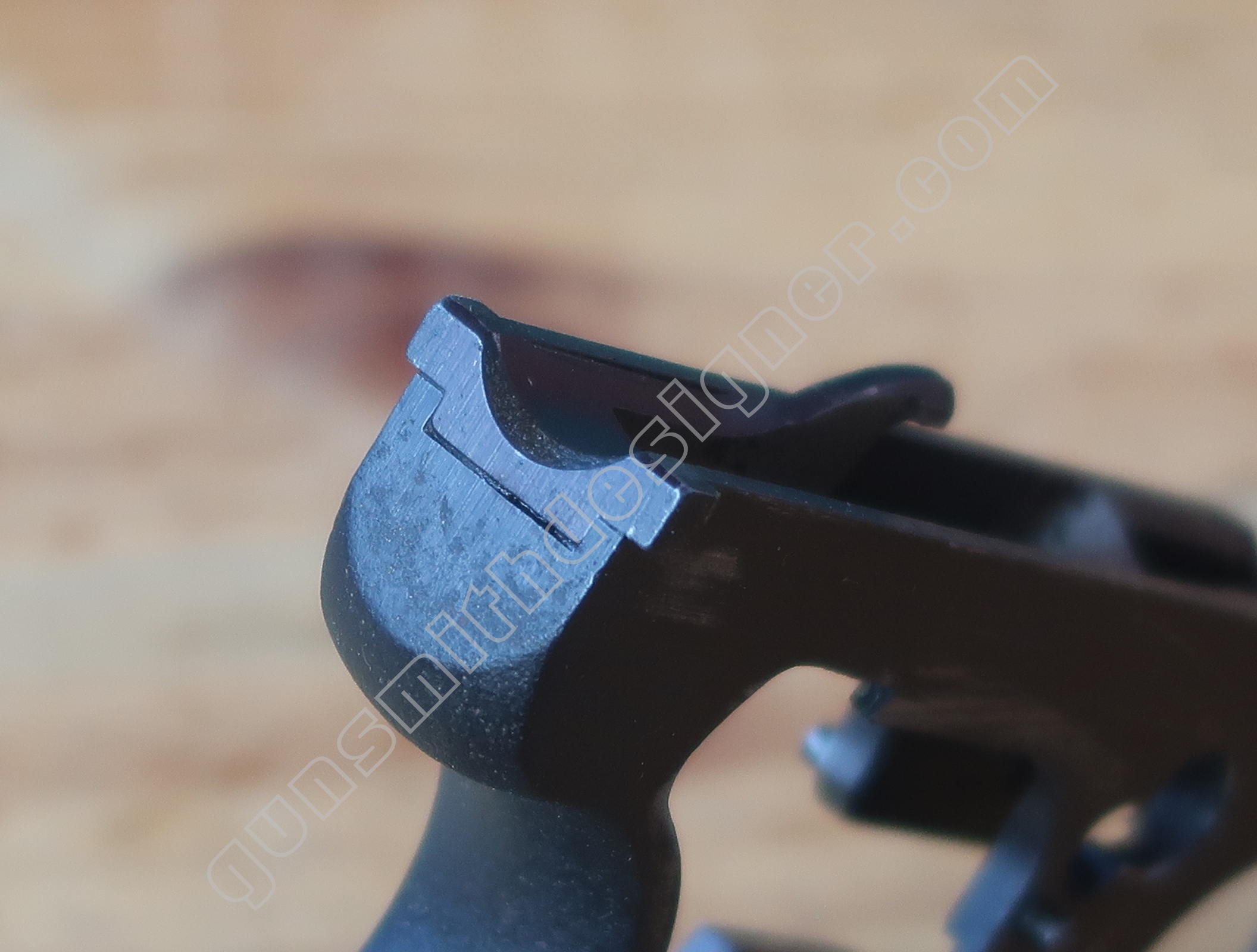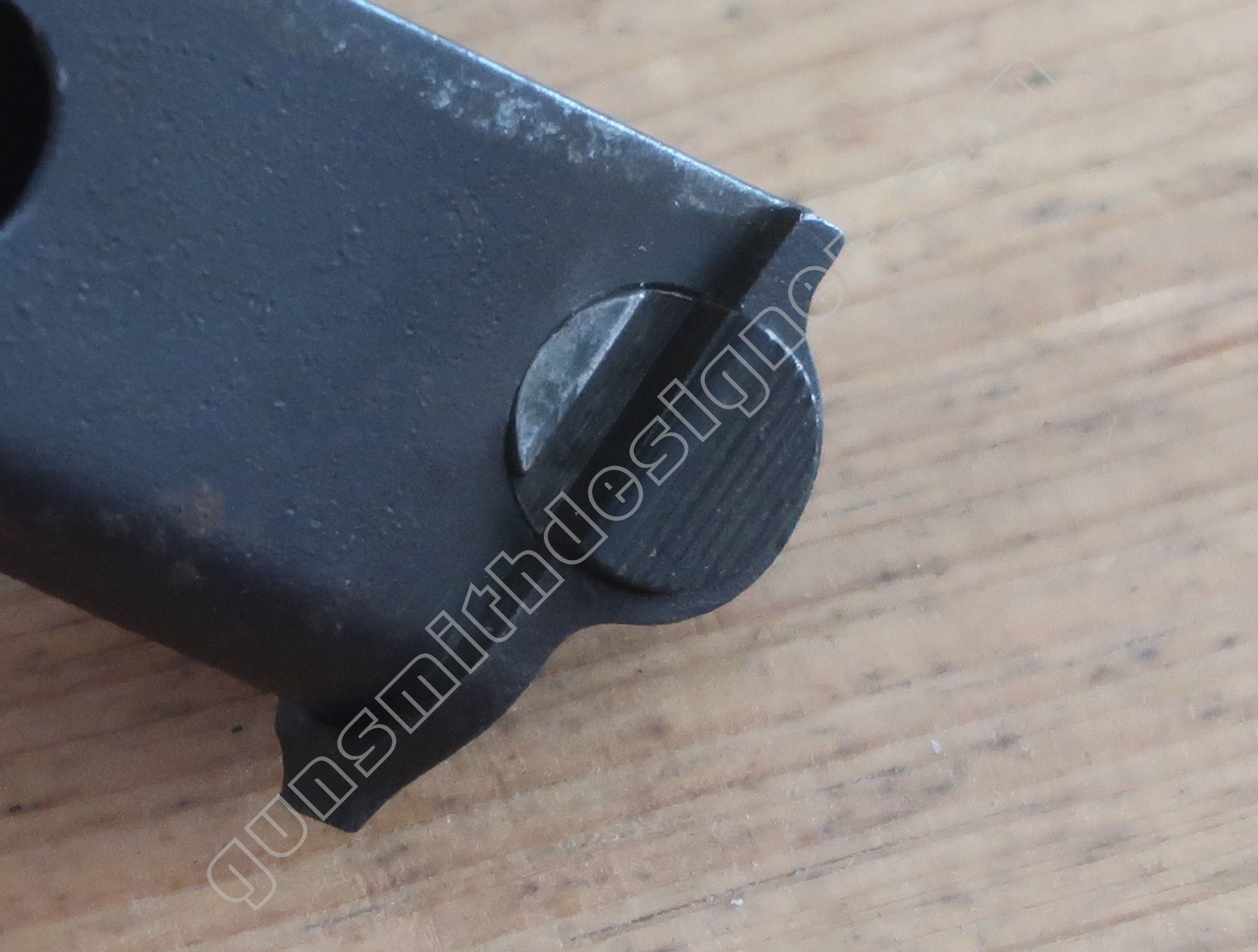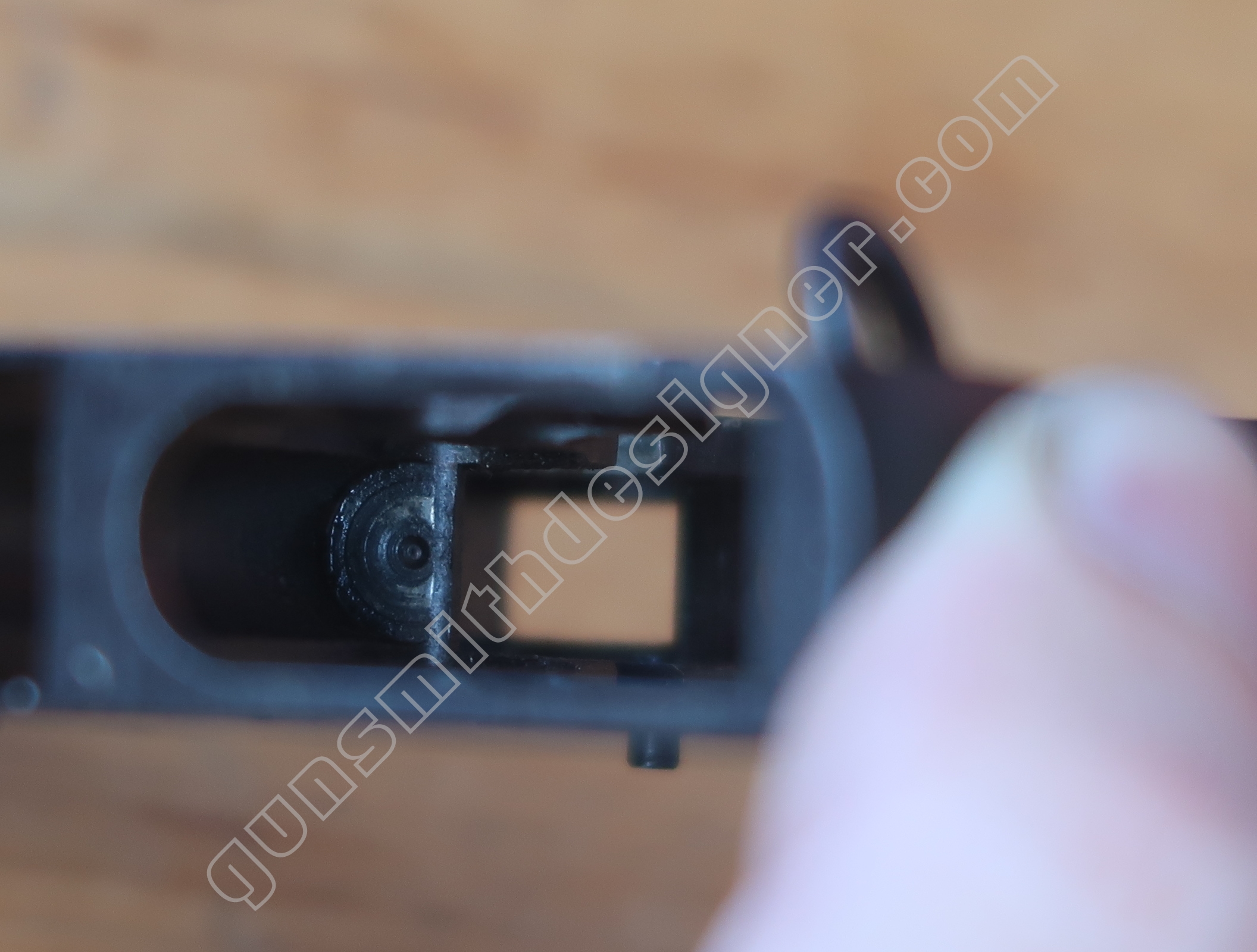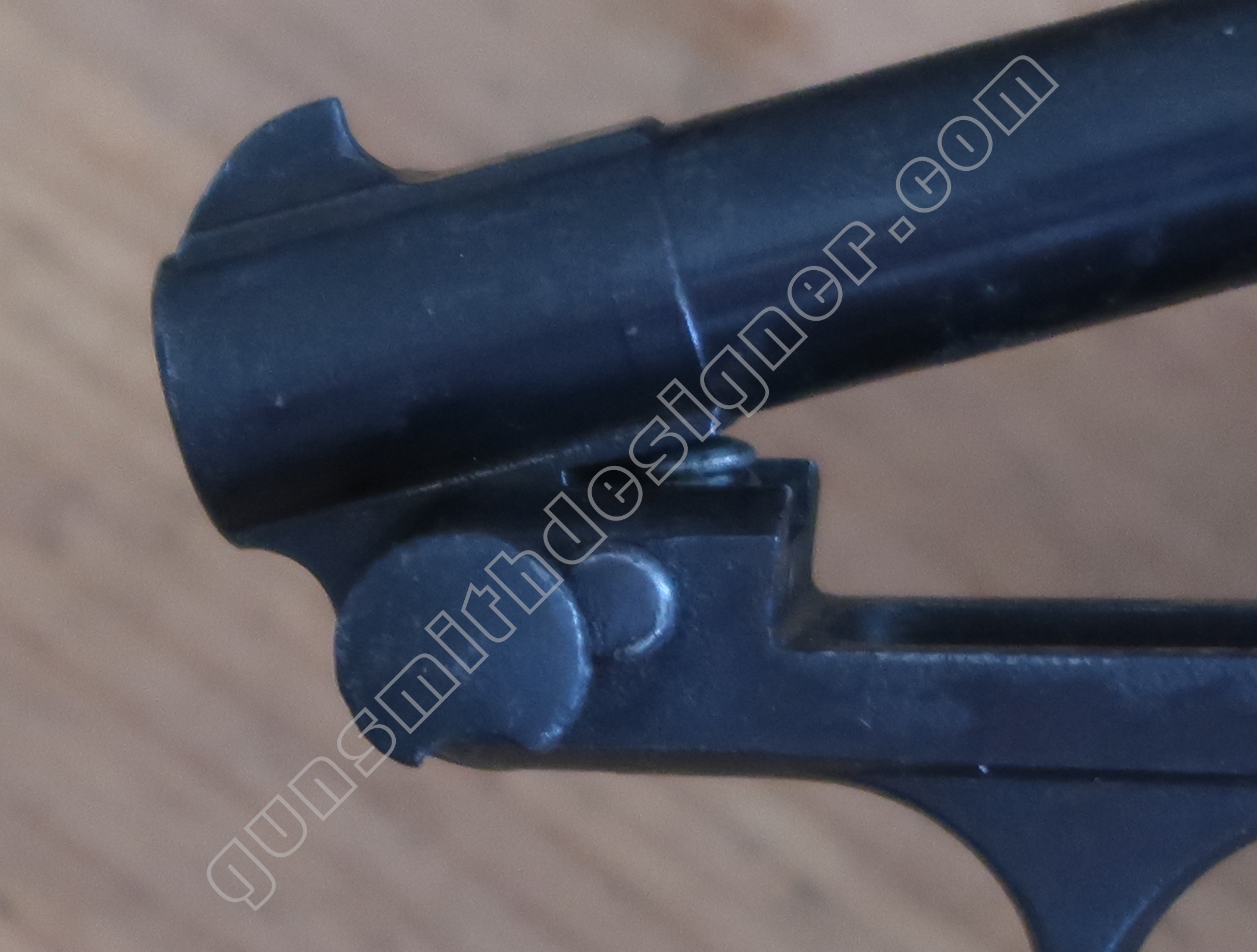 Au même endroit mais sur la face droite de la carcasse, il existe la butée de la gâchette. Il s’agit de la butée avant.