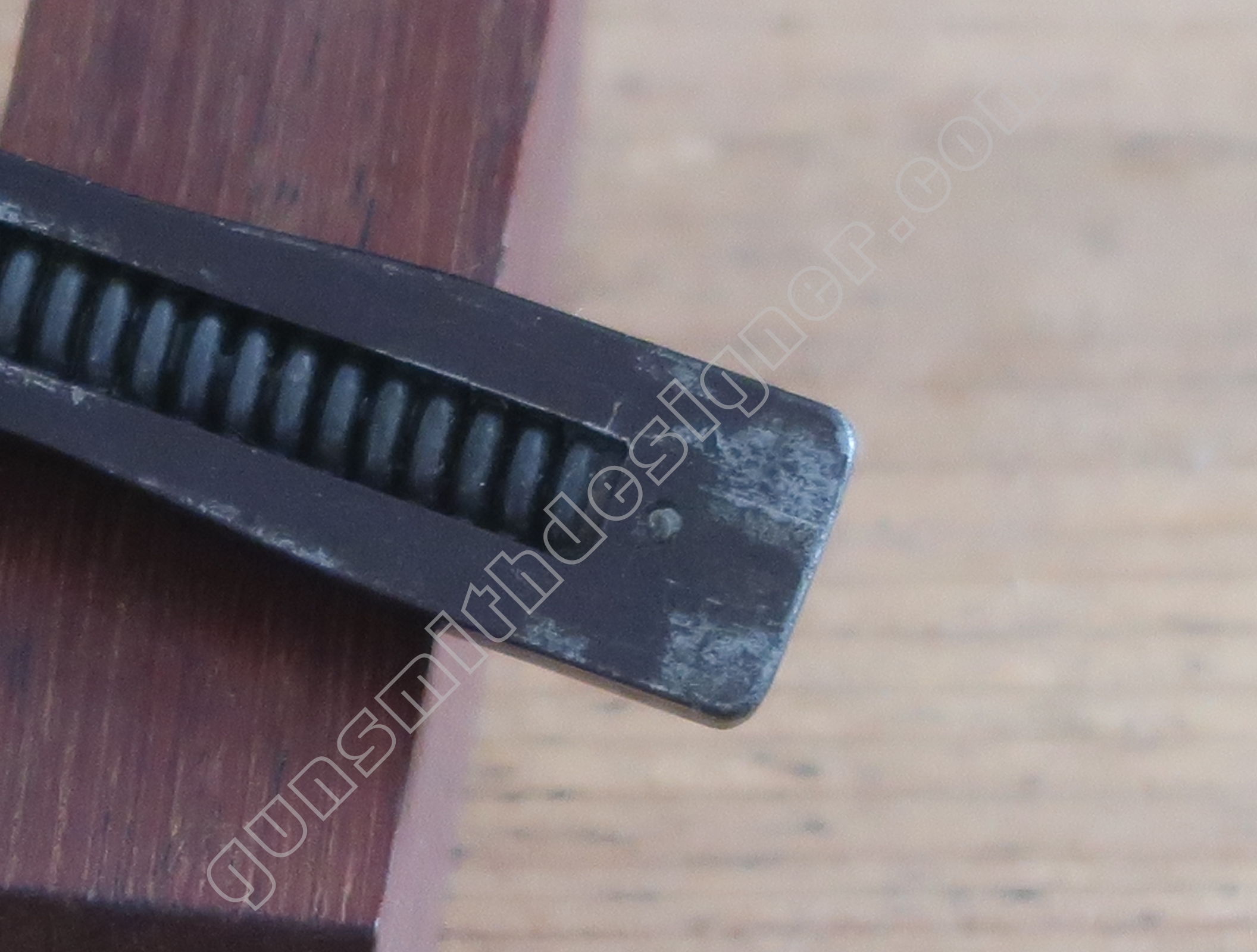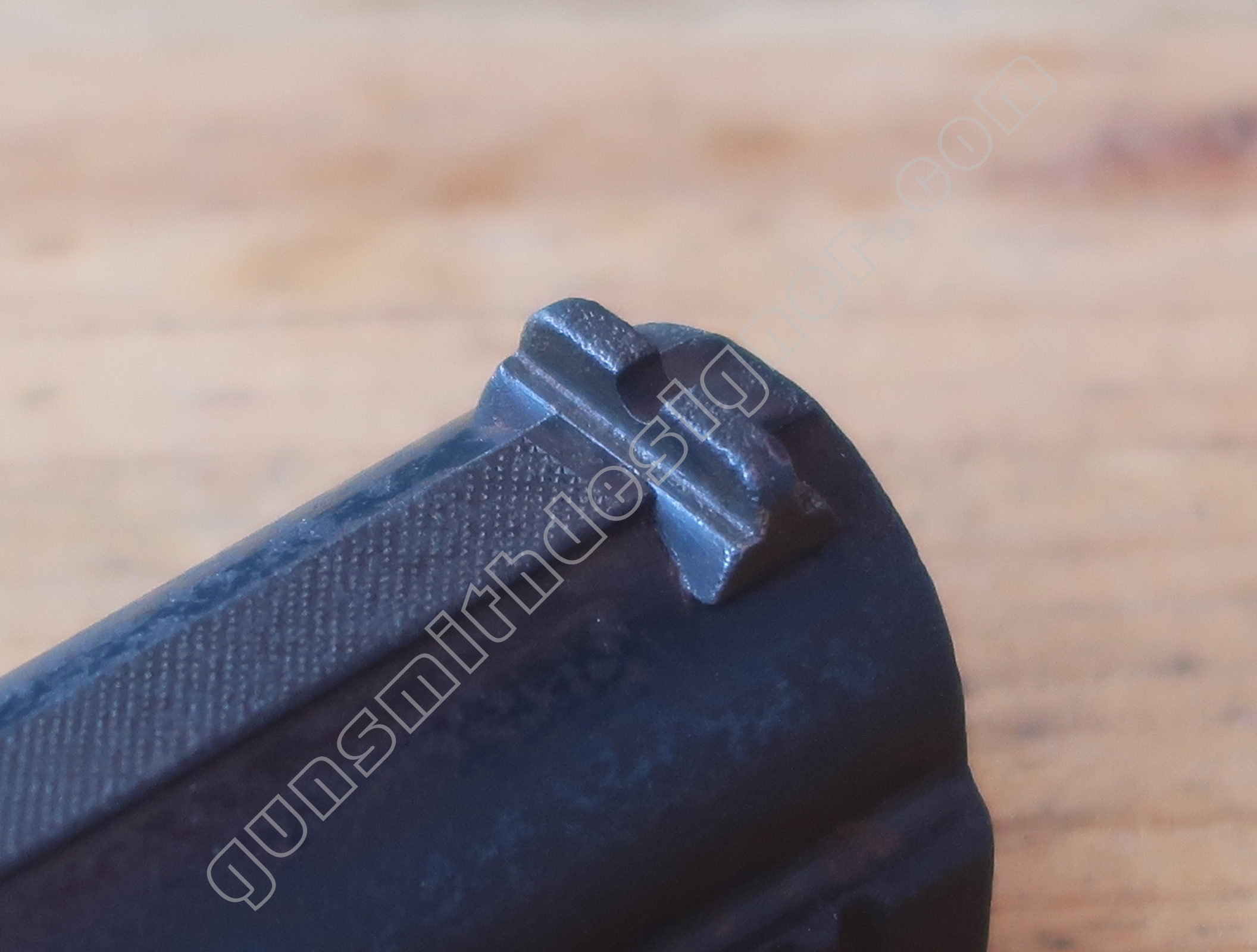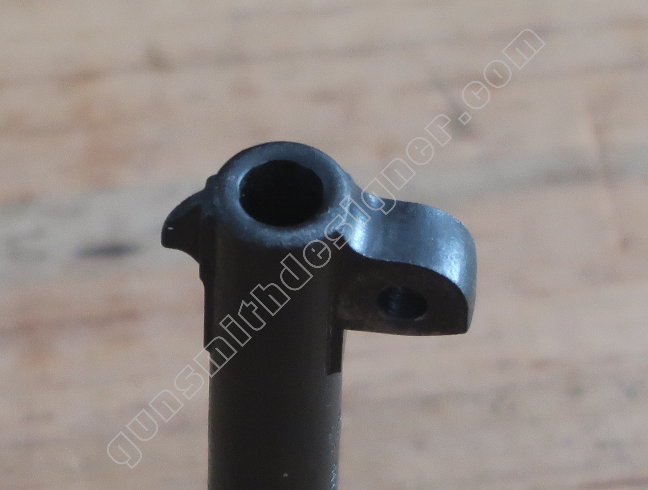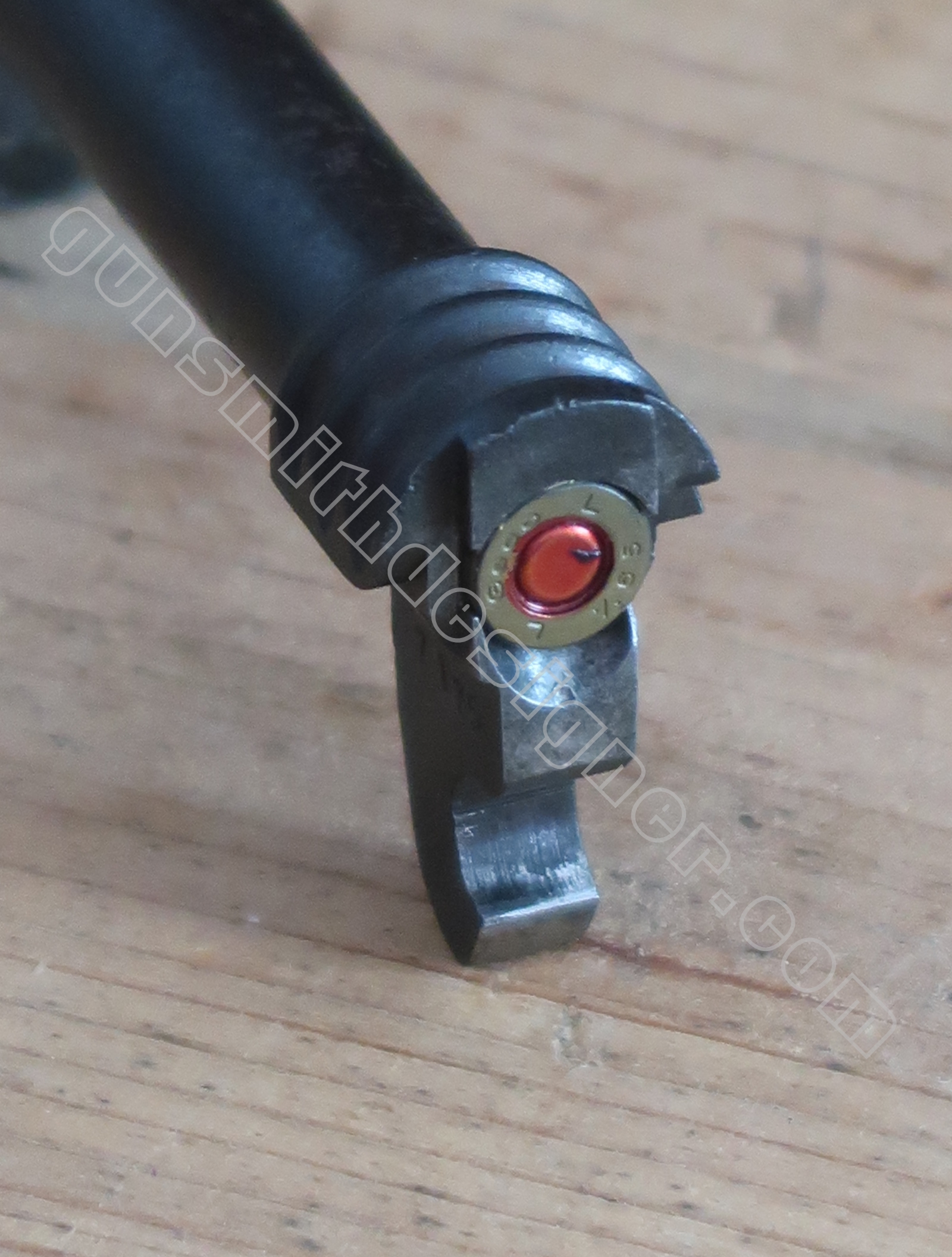 Au même endroit mais sur la face droite de la carcasse, il existe la butée de la gâchette. Il s’agit de la butée avant.