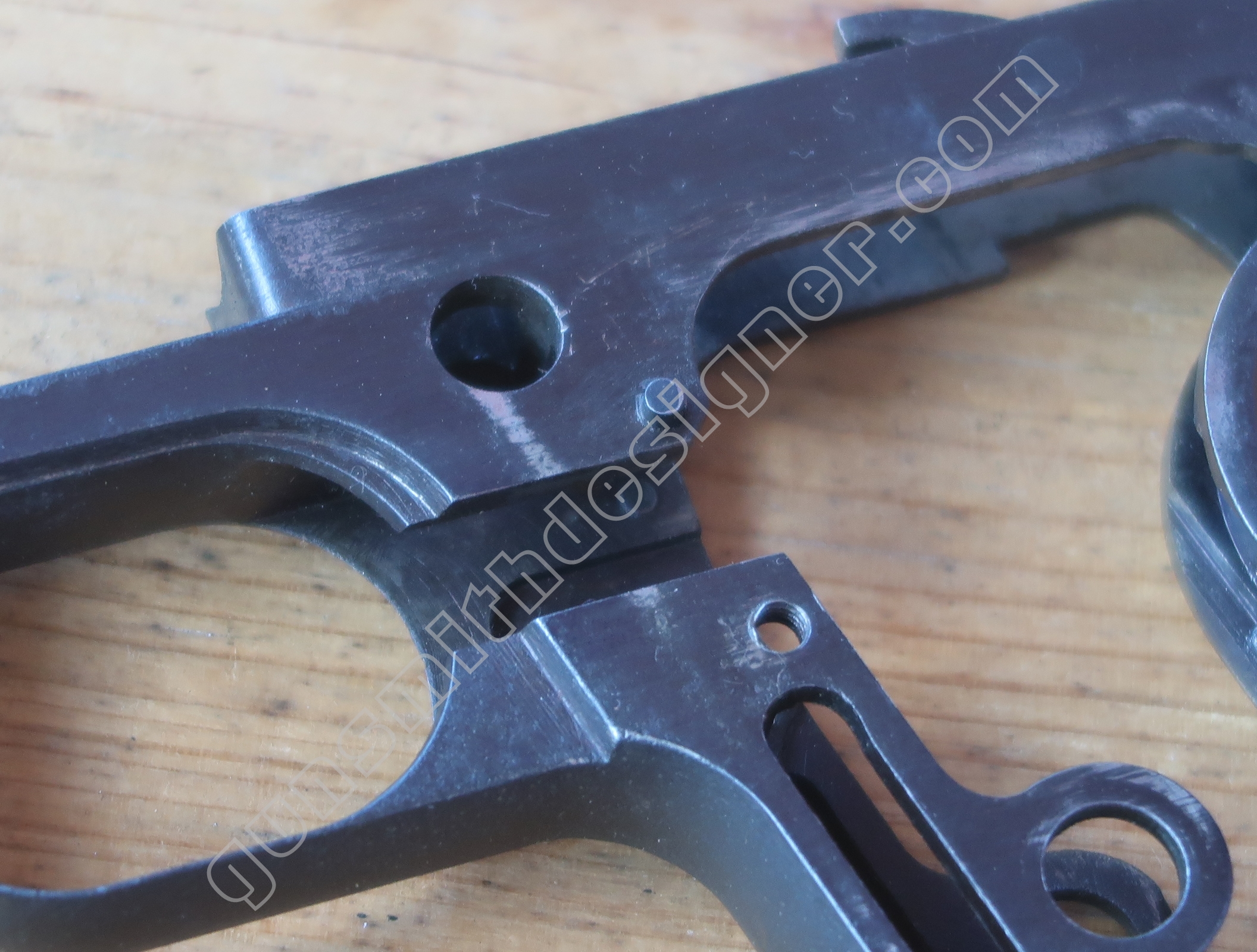 Sur la face gauche, un usinage important de la carcasse est la portée de la gâchette. Cette surface va donner à cette dernière sa position verticale. Dit autrement, selon la position de la gâchette sur cette portée, la gâchette sera plus ou moins haute. La gâchette et la queue de détente ne faisant qu’une seule pièce, c’est ainsi que le tir est commandé par l’action du doigt du tireur. On verra en détail cela dans un chapitre dédié au système de percussion et de détente.