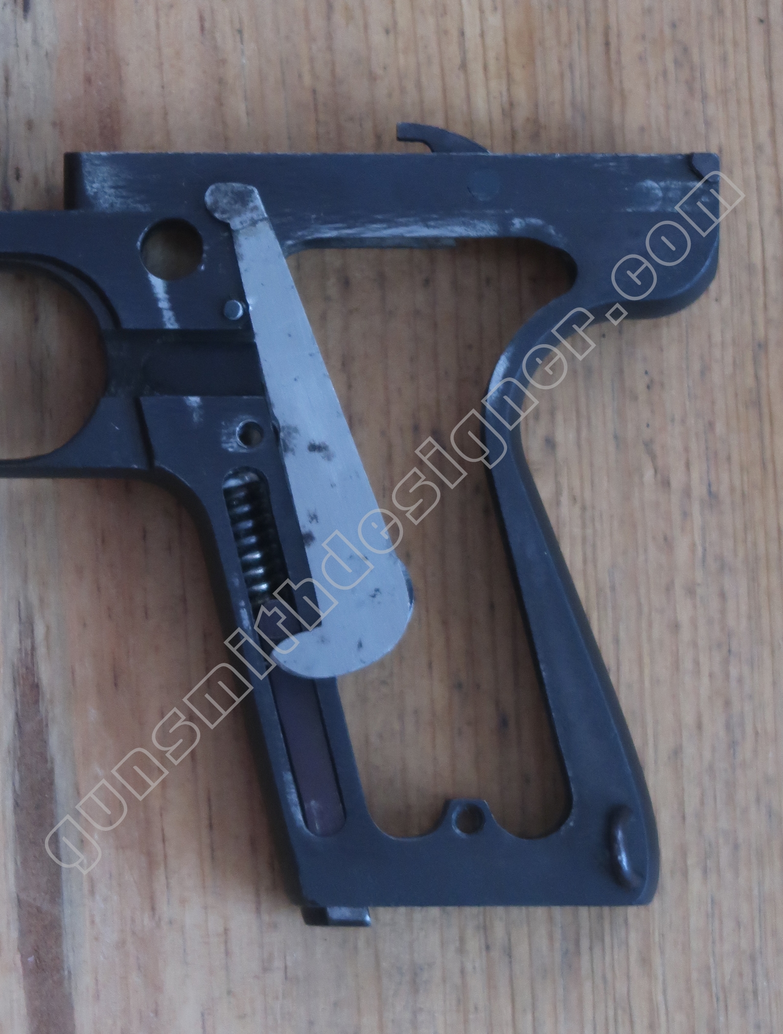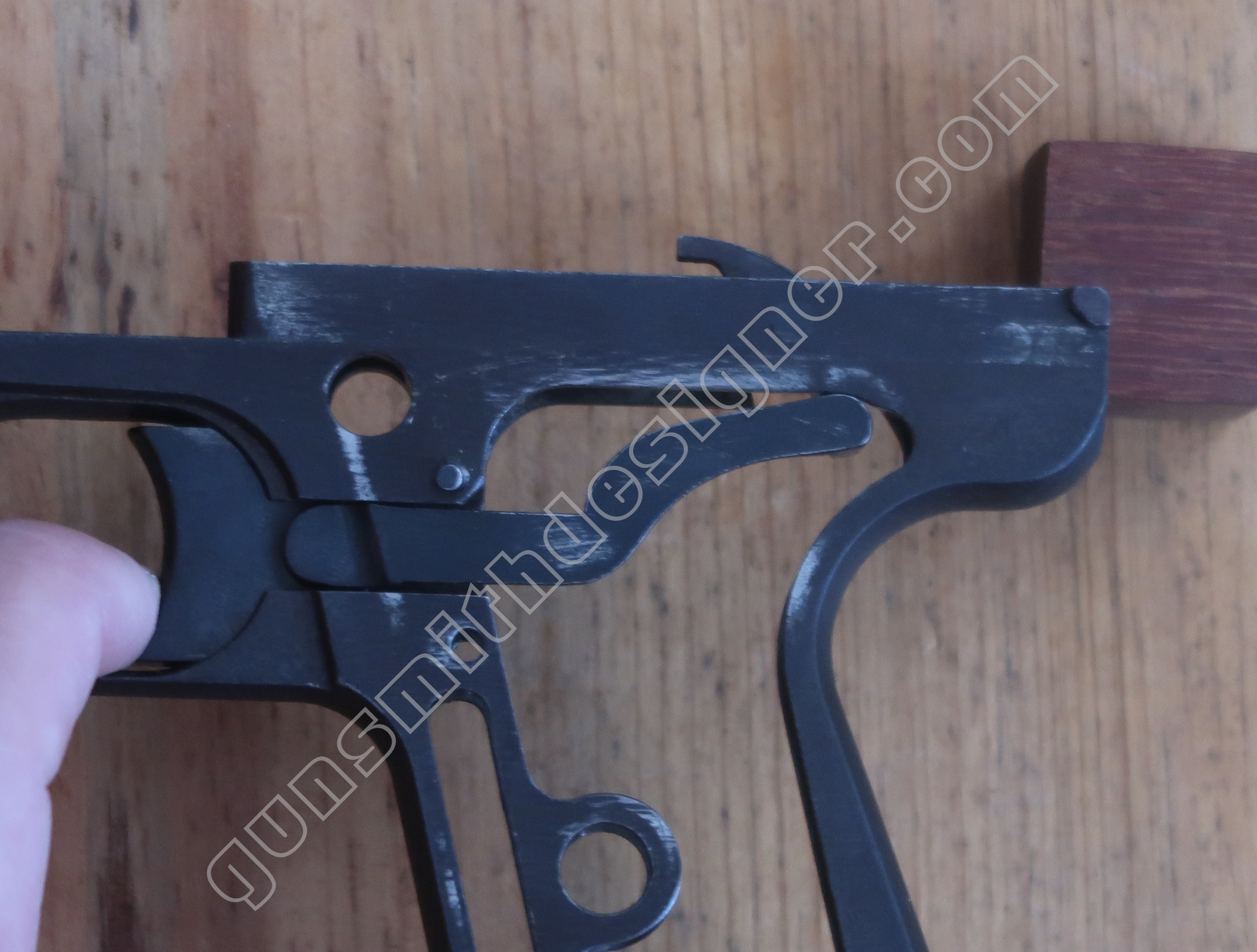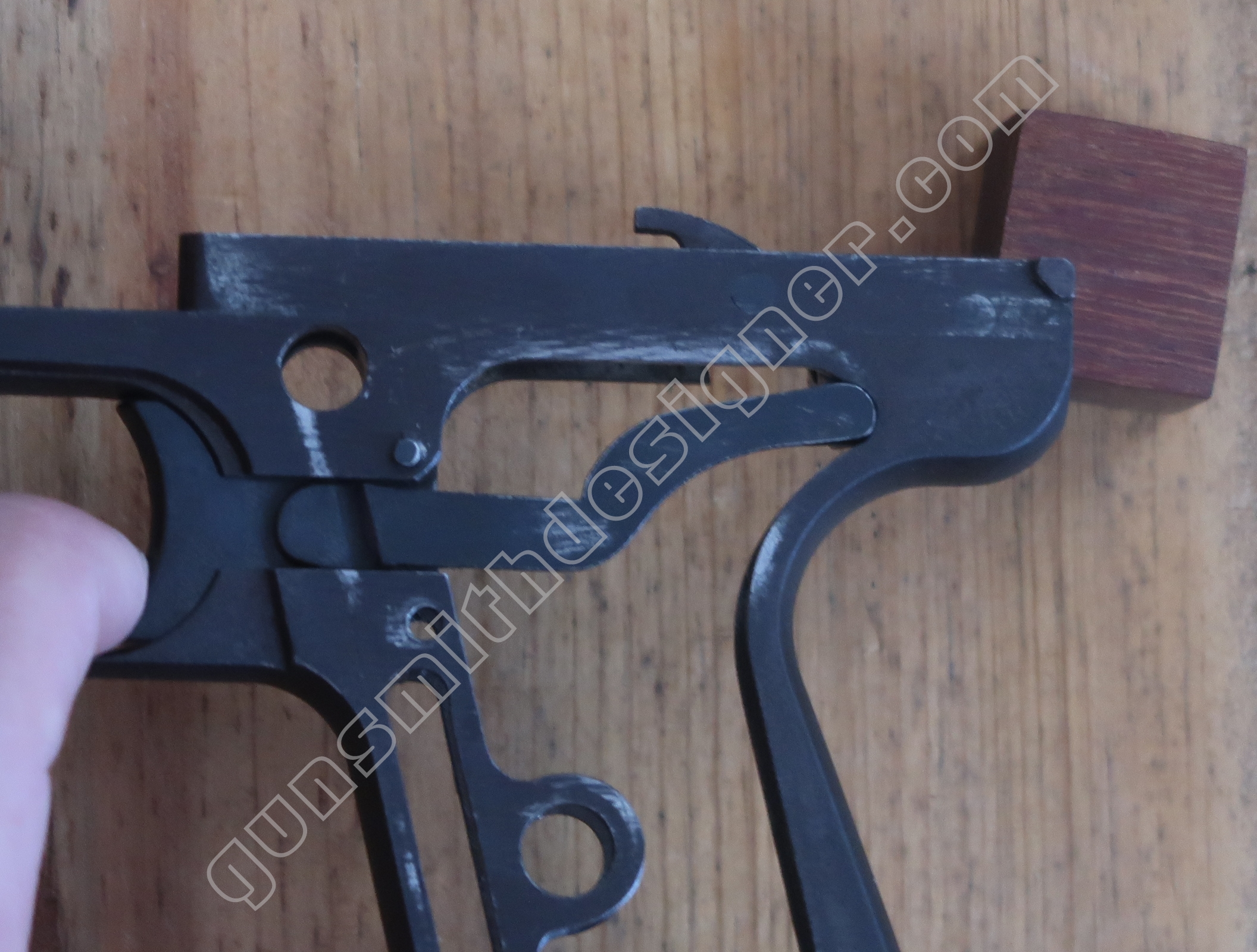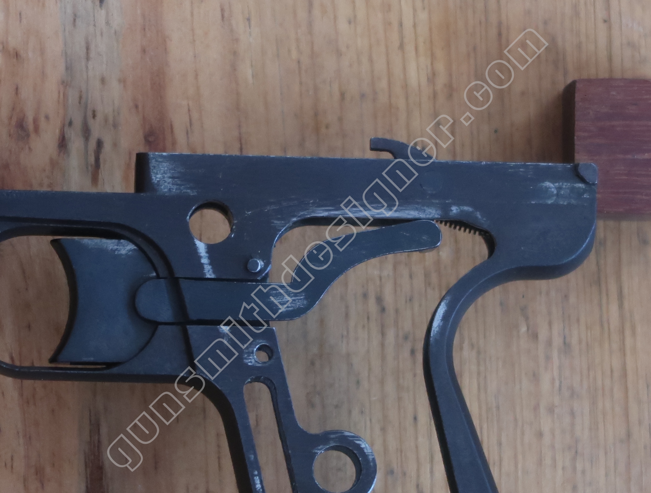 Comme nous l’avons déjà indiqué, la gâchette et la queue de détente ne font qu’une seule et même pièce. La butée avant et la hauteur de la gâchette sont commandées par des usinages sur la carcasse.