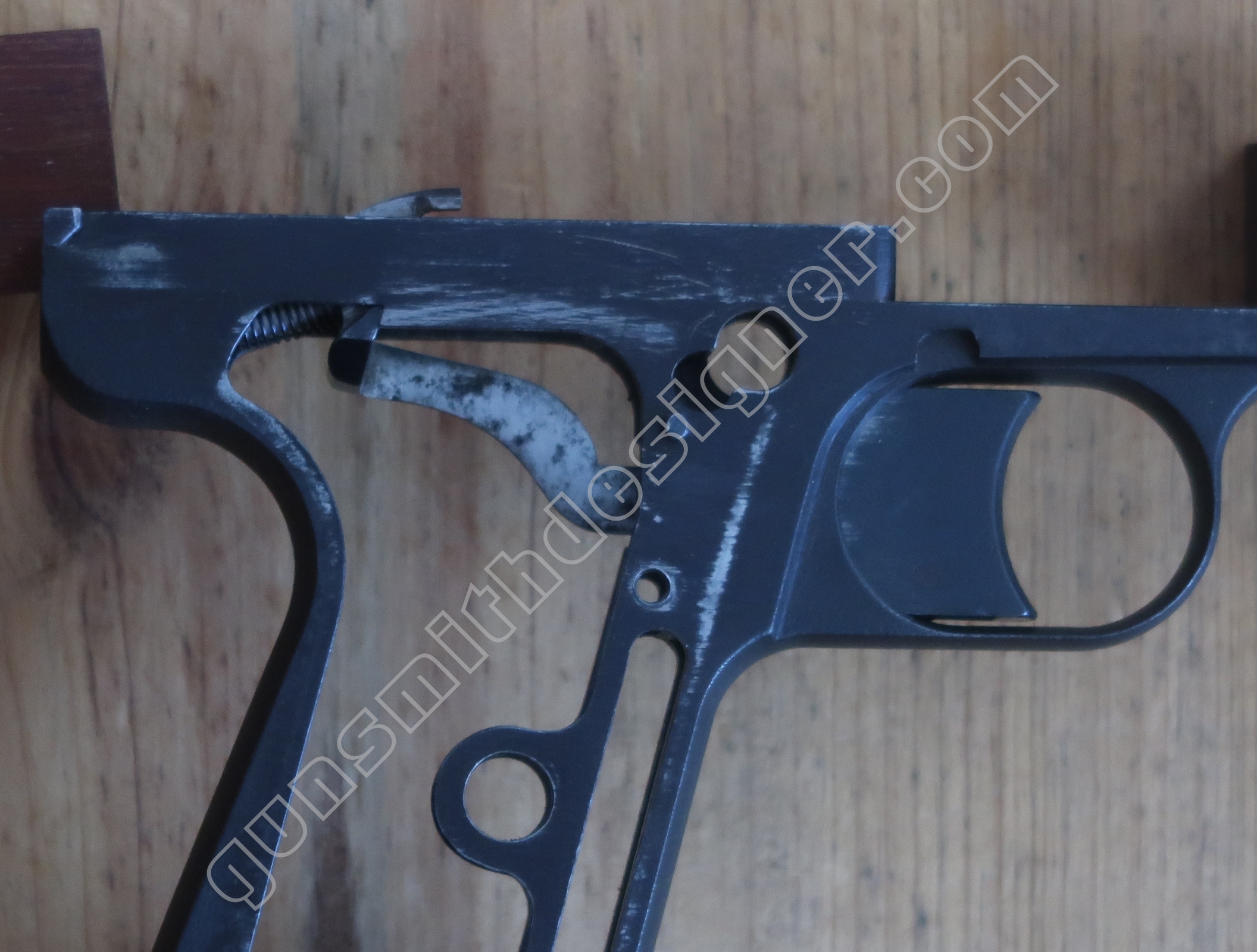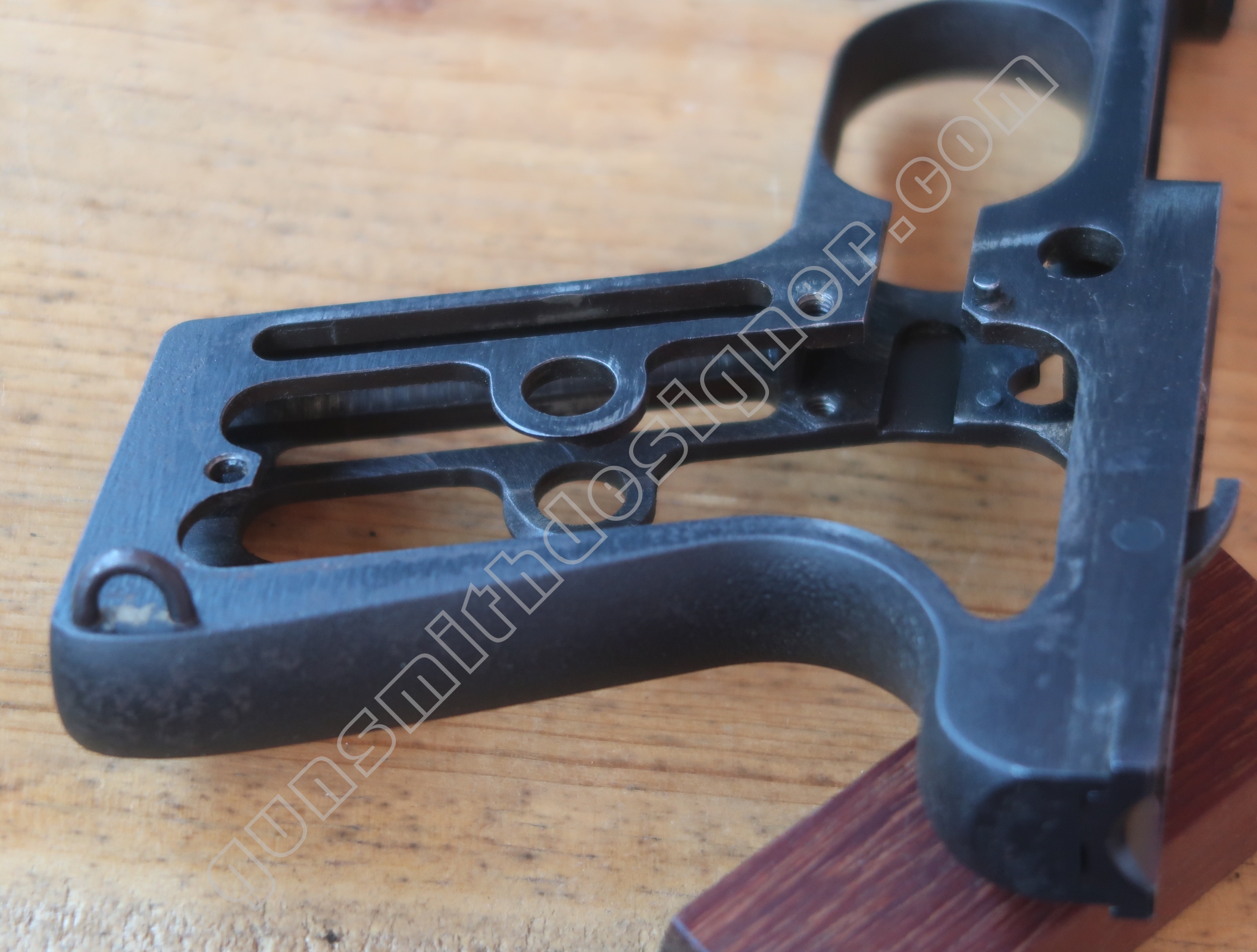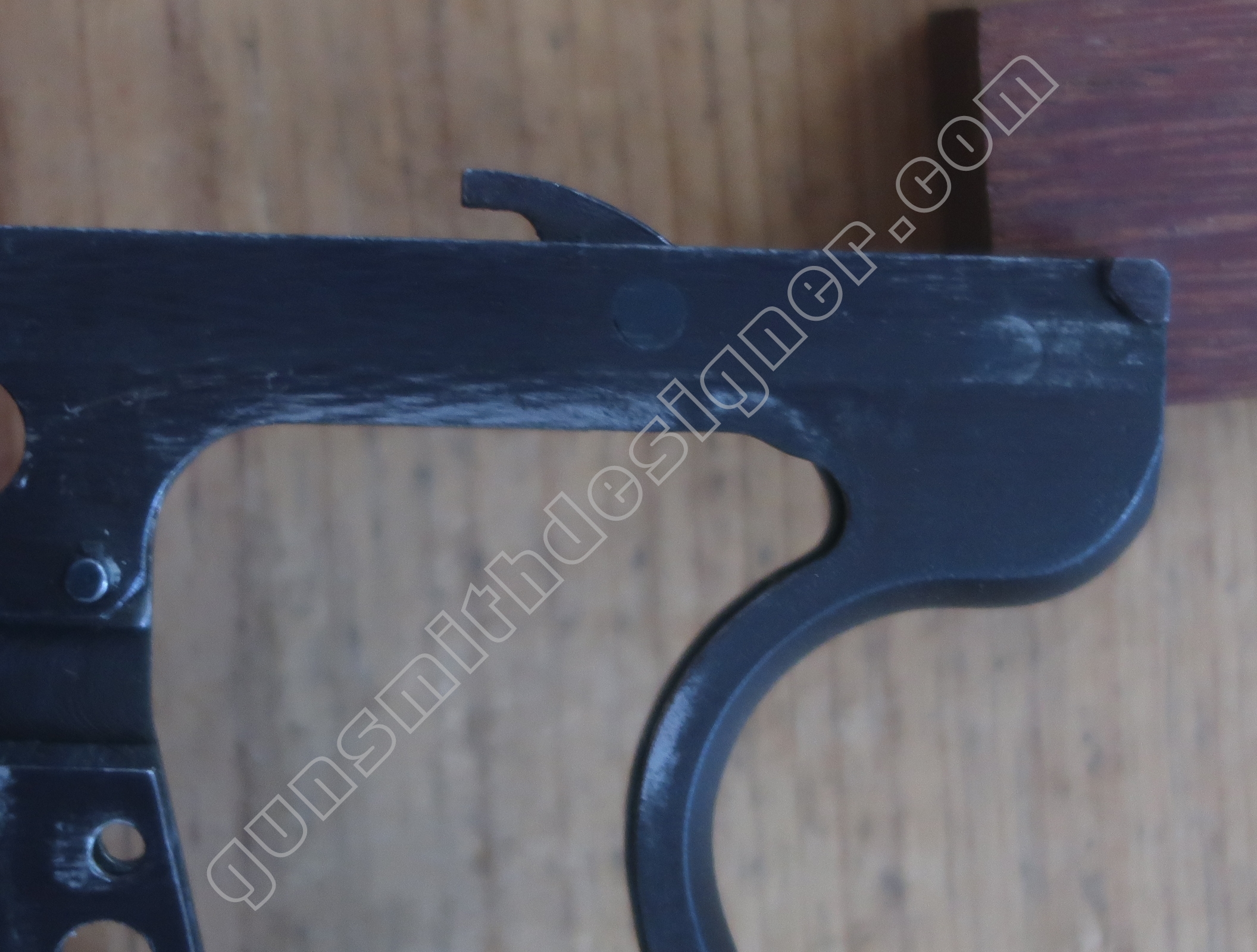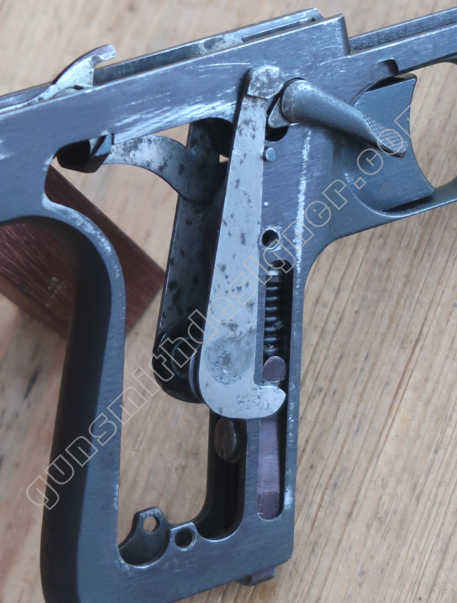 Comme nous l’avons déjà indiqué, la gâchette et la queue de détente ne font qu’une seule et même pièce. La butée avant et la hauteur de la gâchette sont commandées par des usinages sur la carcasse.