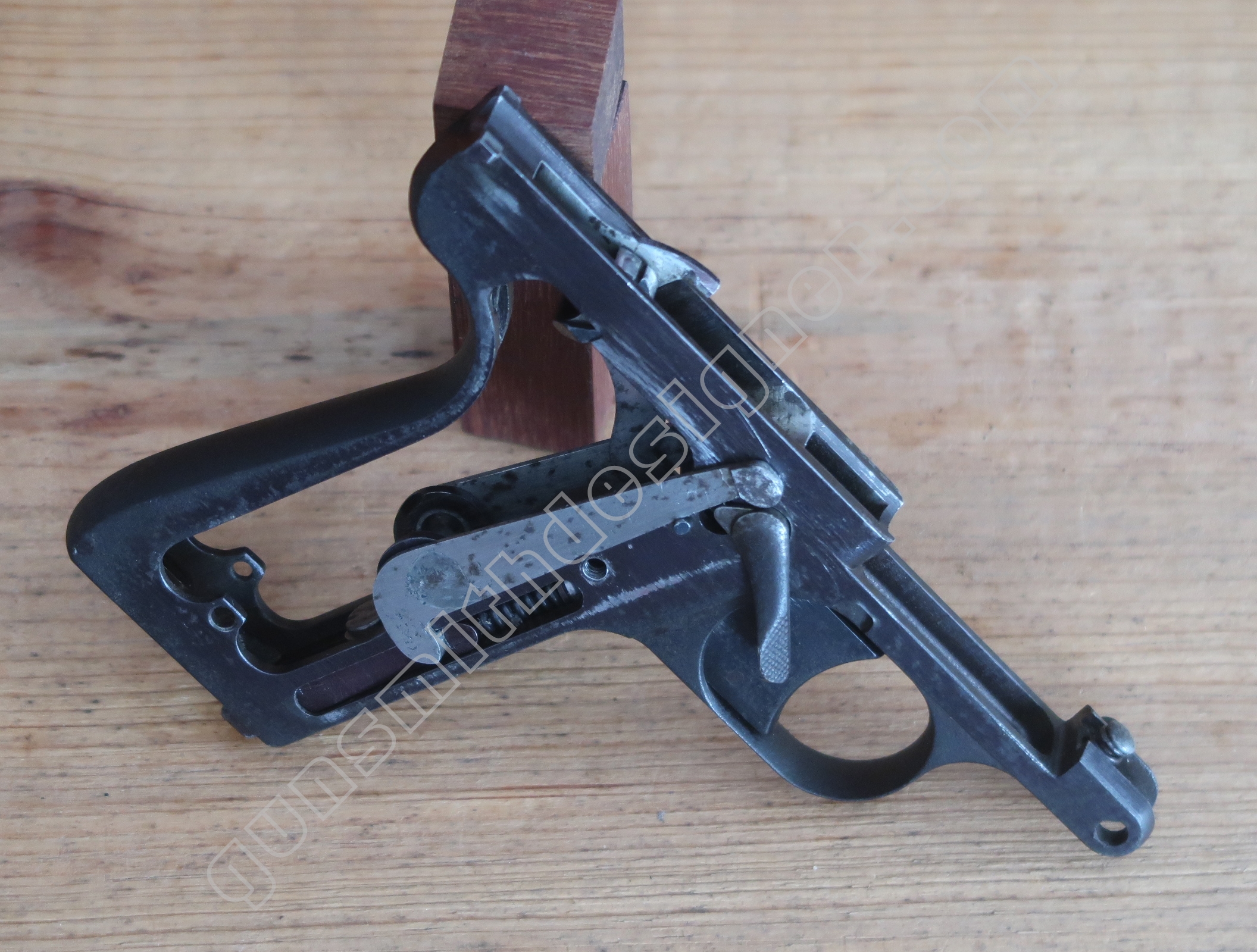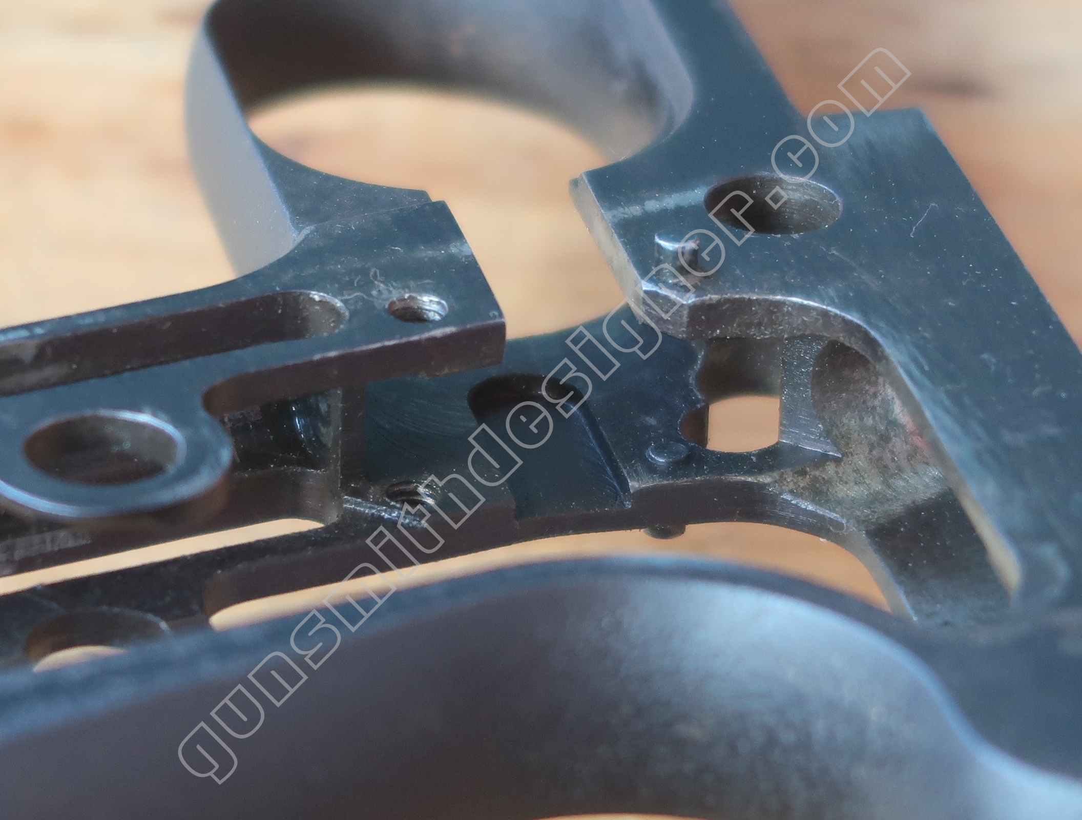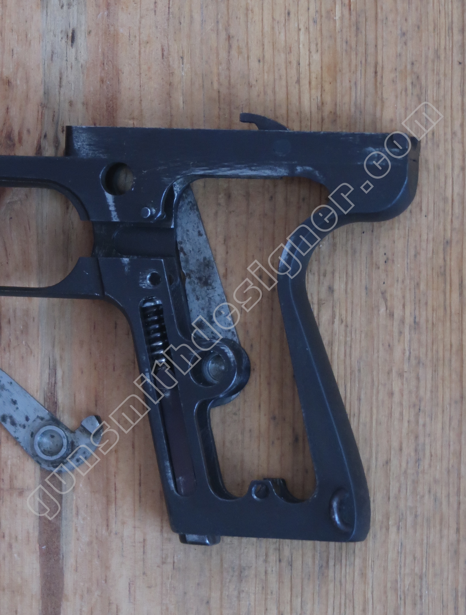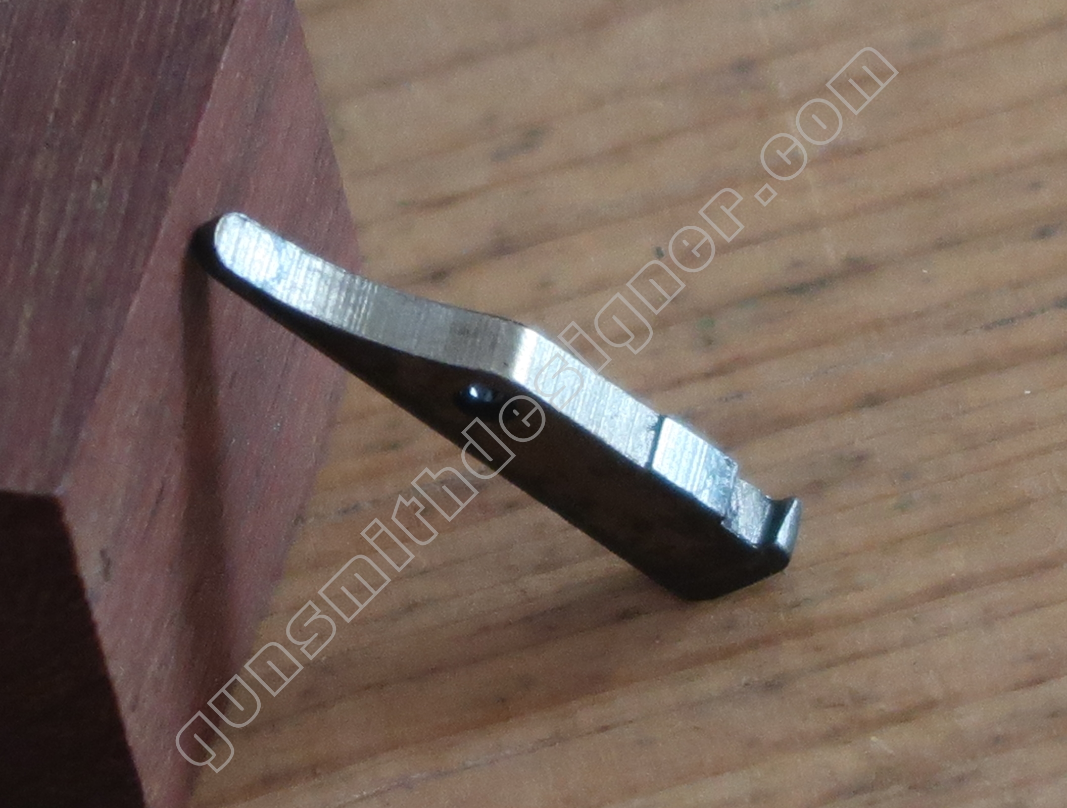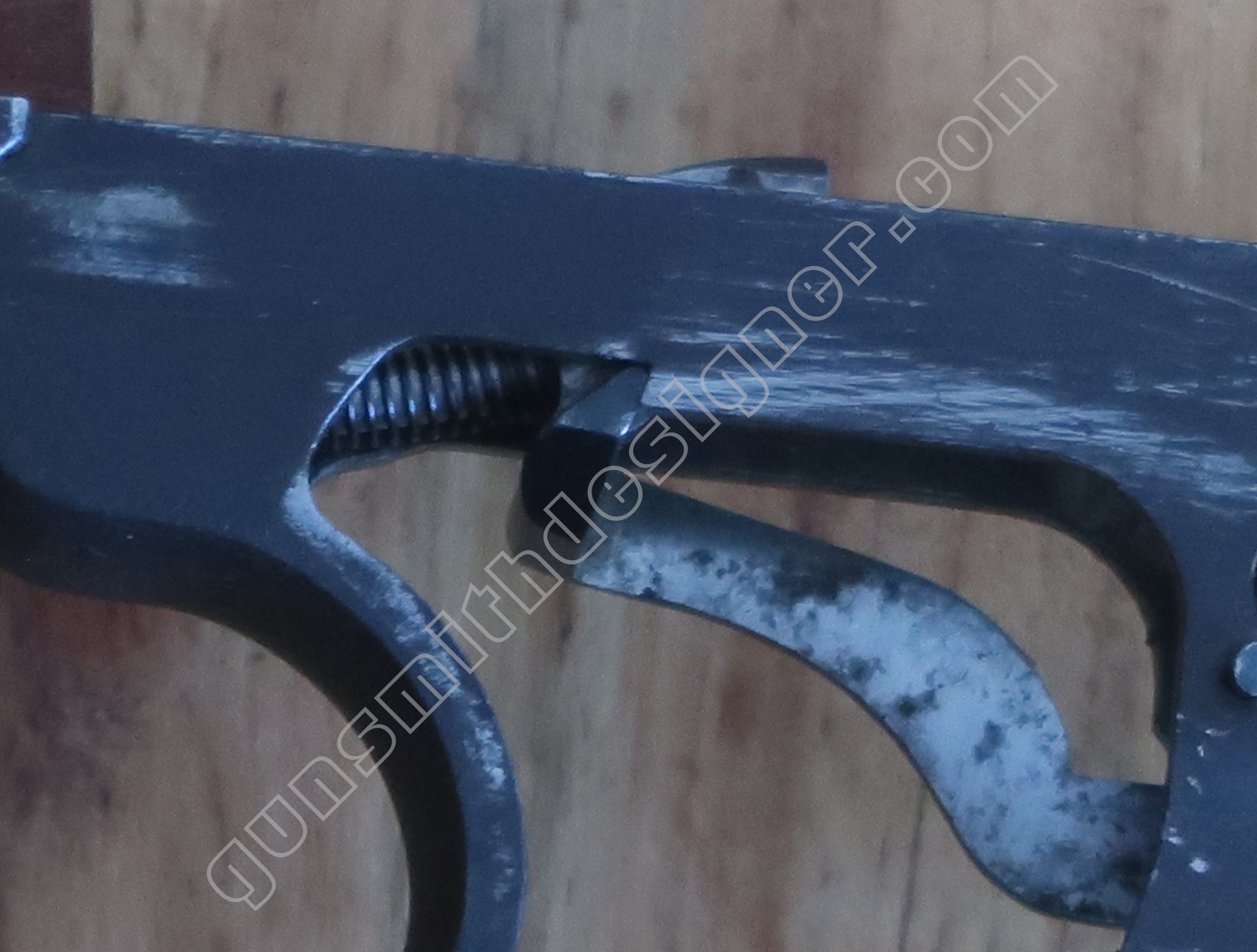 Comme nous l’avons déjà indiqué, la gâchette et la queue de détente ne font qu’une seule et même pièce. La butée avant et la hauteur de la gâchette sont commandées par des usinages sur la carcasse.