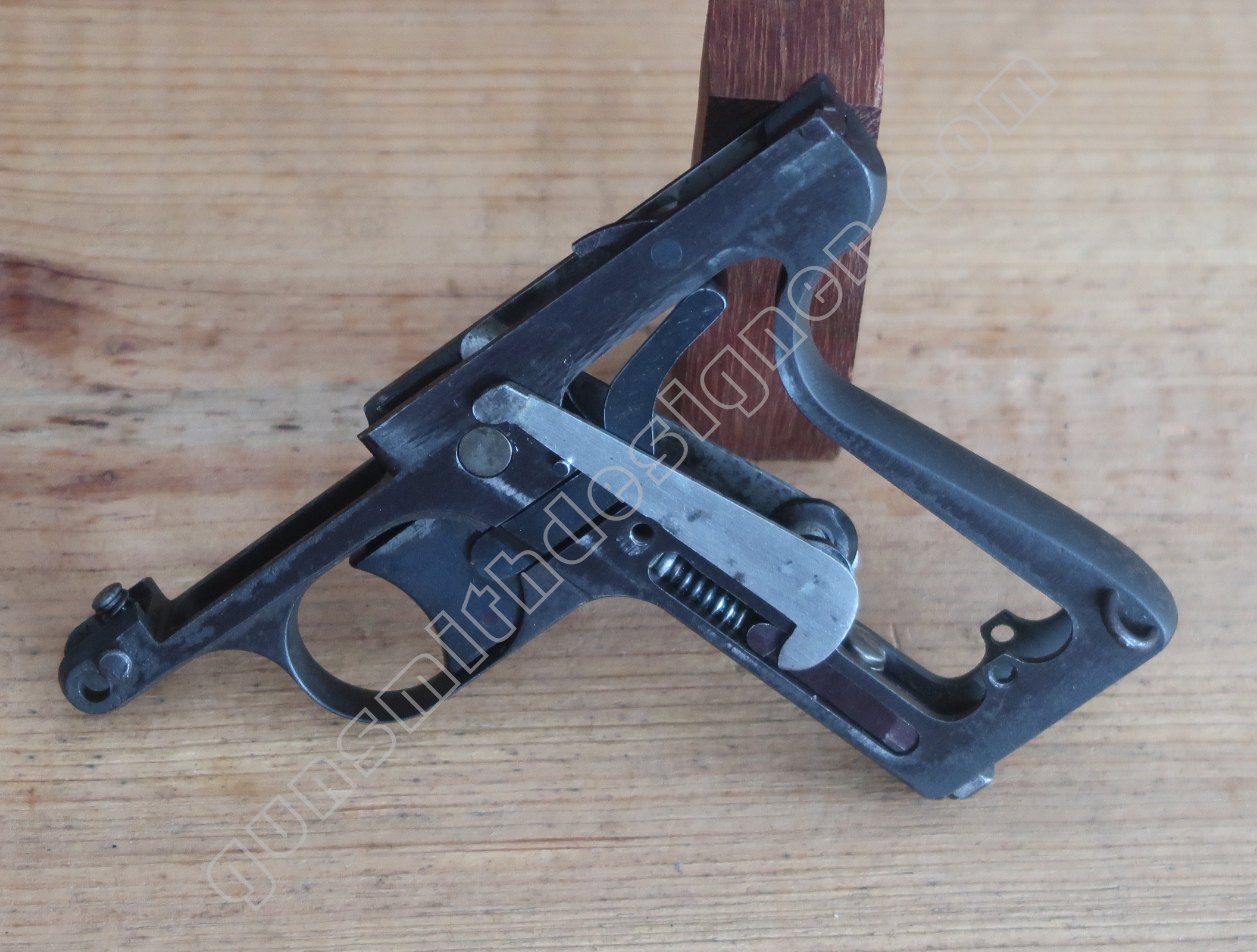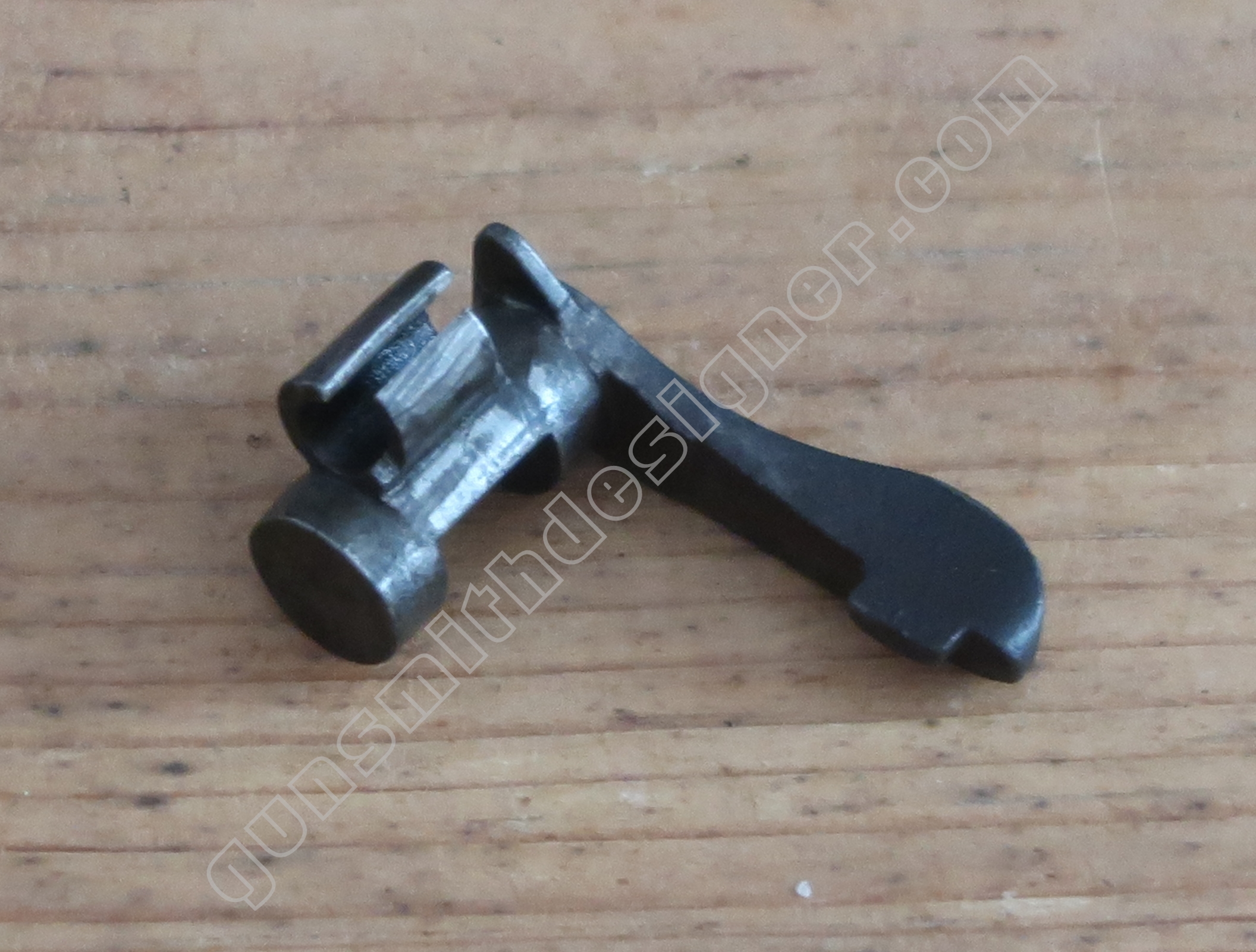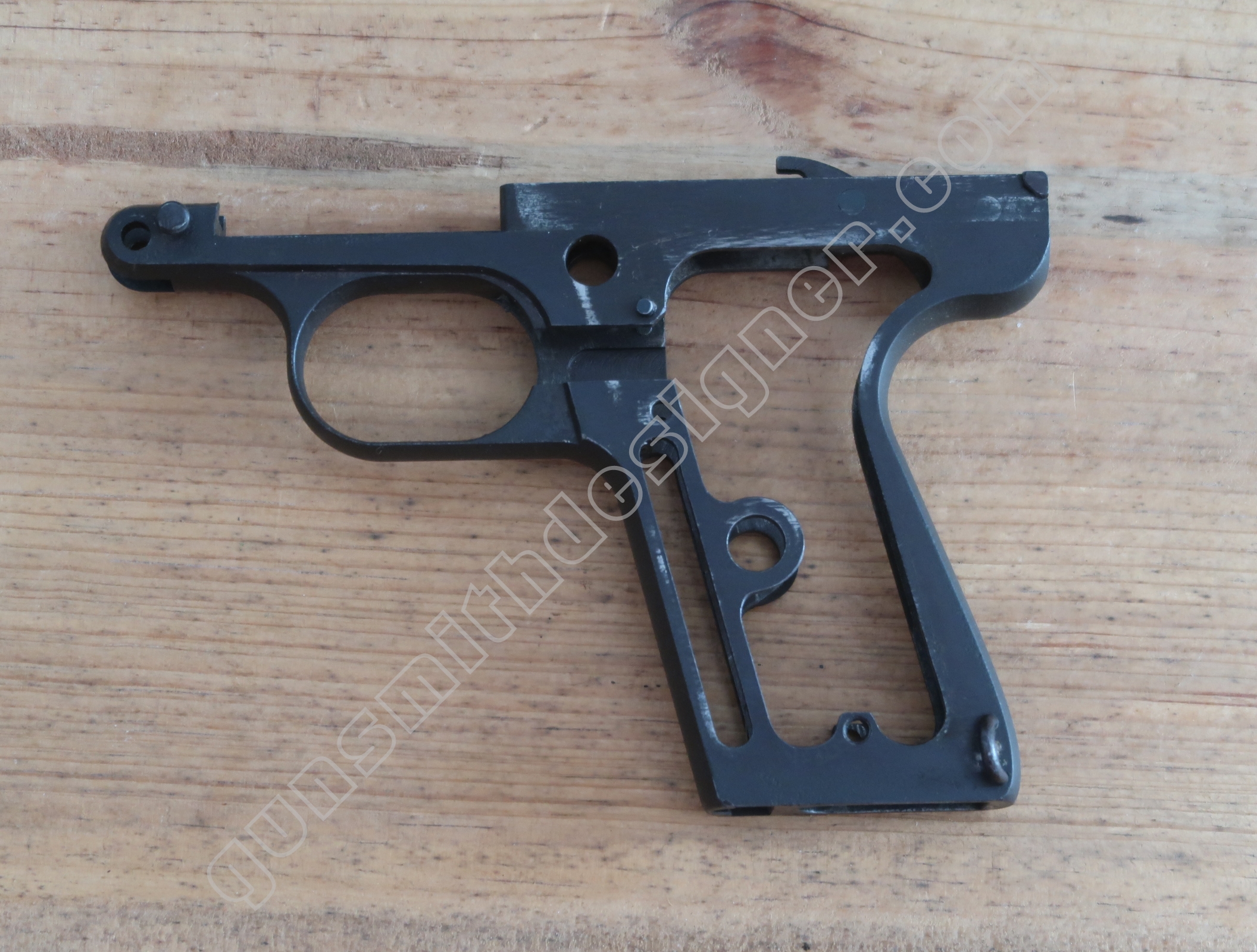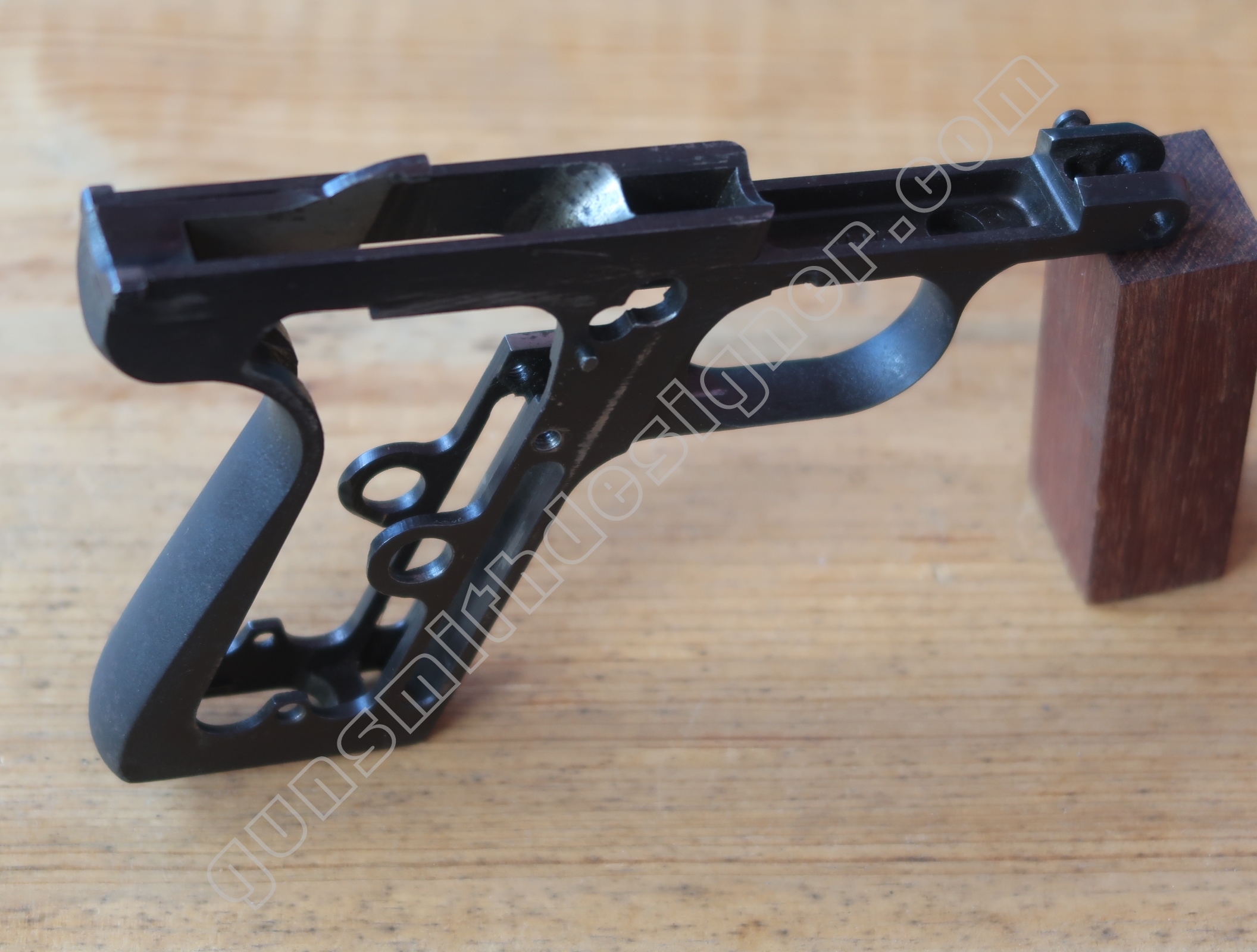 Comme nous l’avons déjà indiqué, la gâchette et la queue de détente ne font qu’une seule et même pièce. La butée avant et la hauteur de la gâchette sont commandées par des usinages sur la carcasse.