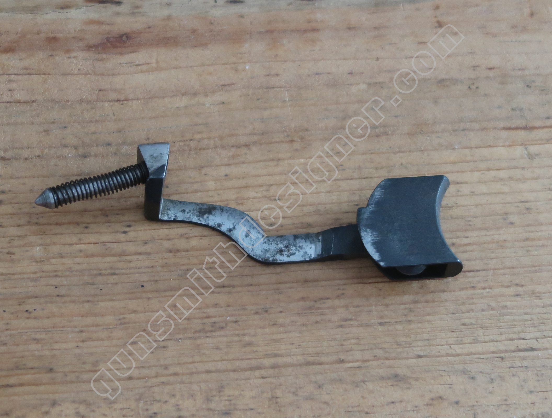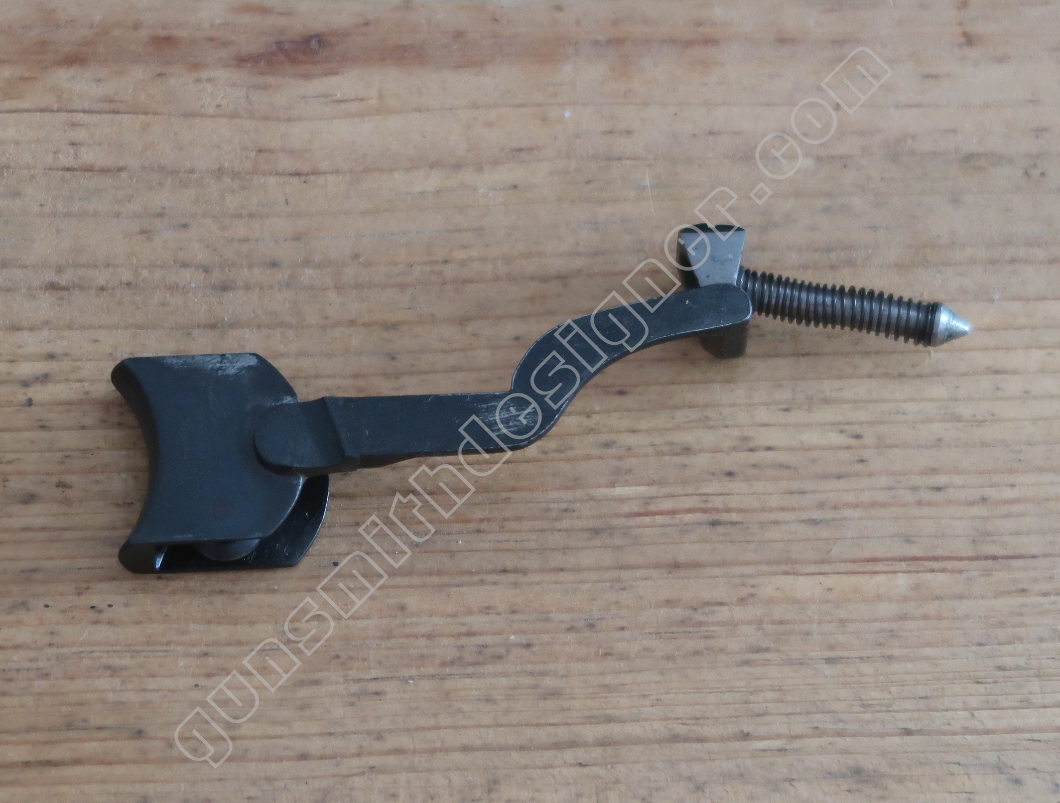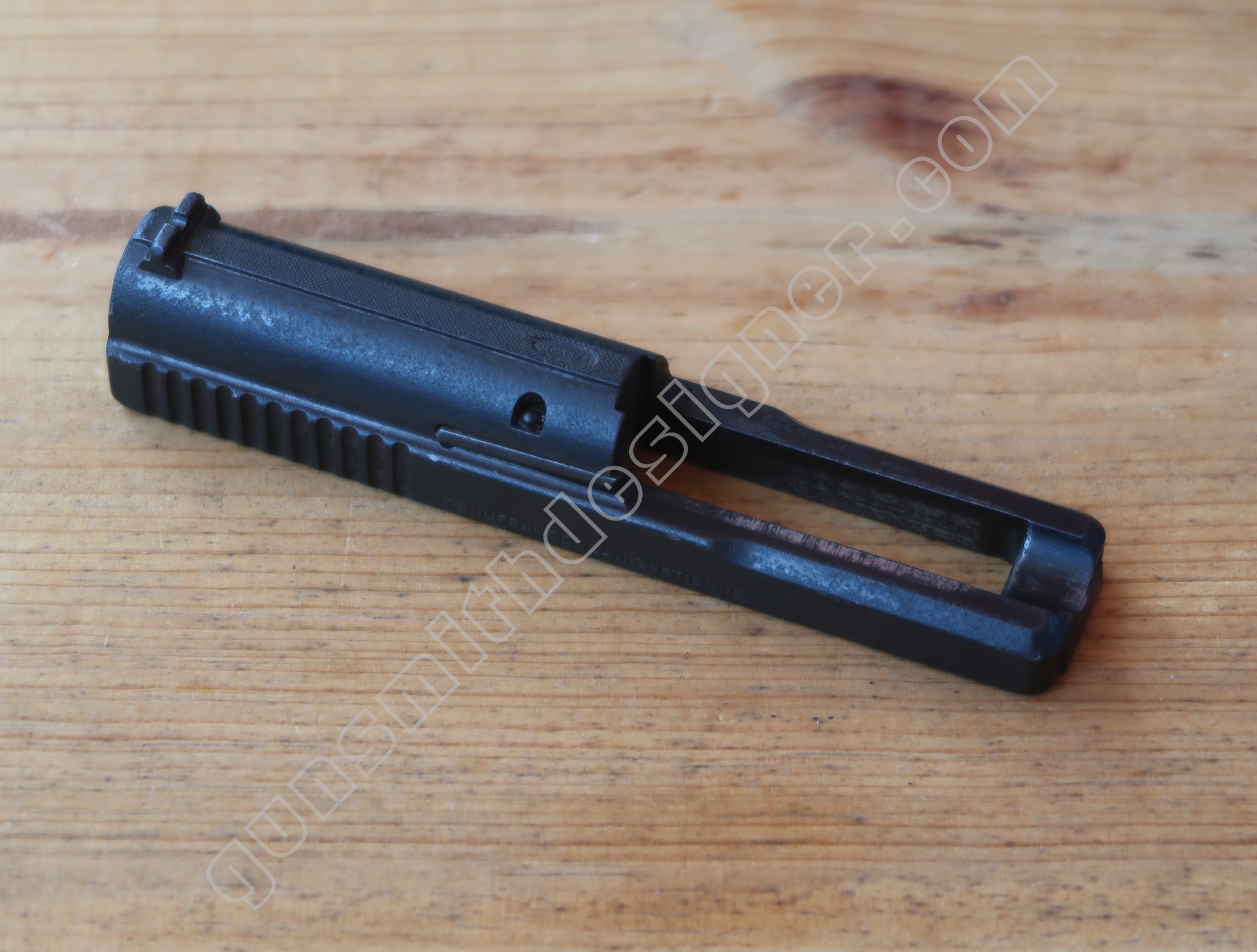 La queue de détente est en acier. C’est une pièce complexe. On pourrait imaginer que cette dernière soit formée à partir de plusieurs pièces soudées. Ca ne semble pas être le cas. Il serait intéressant de se plonger dans les archives de Manufrance pour tenter de préciser les méthodes et moyens de production usités.