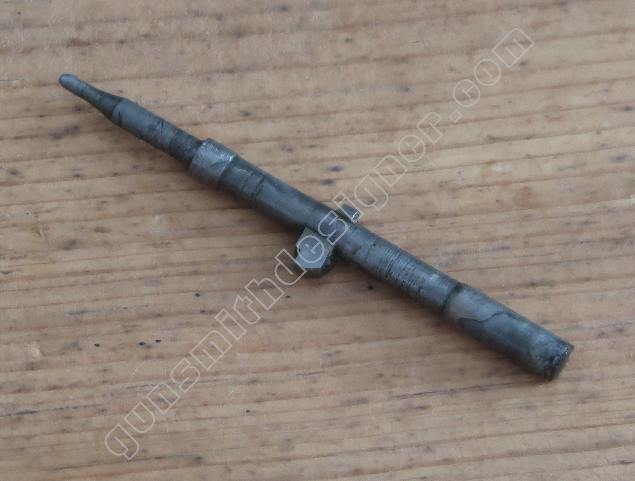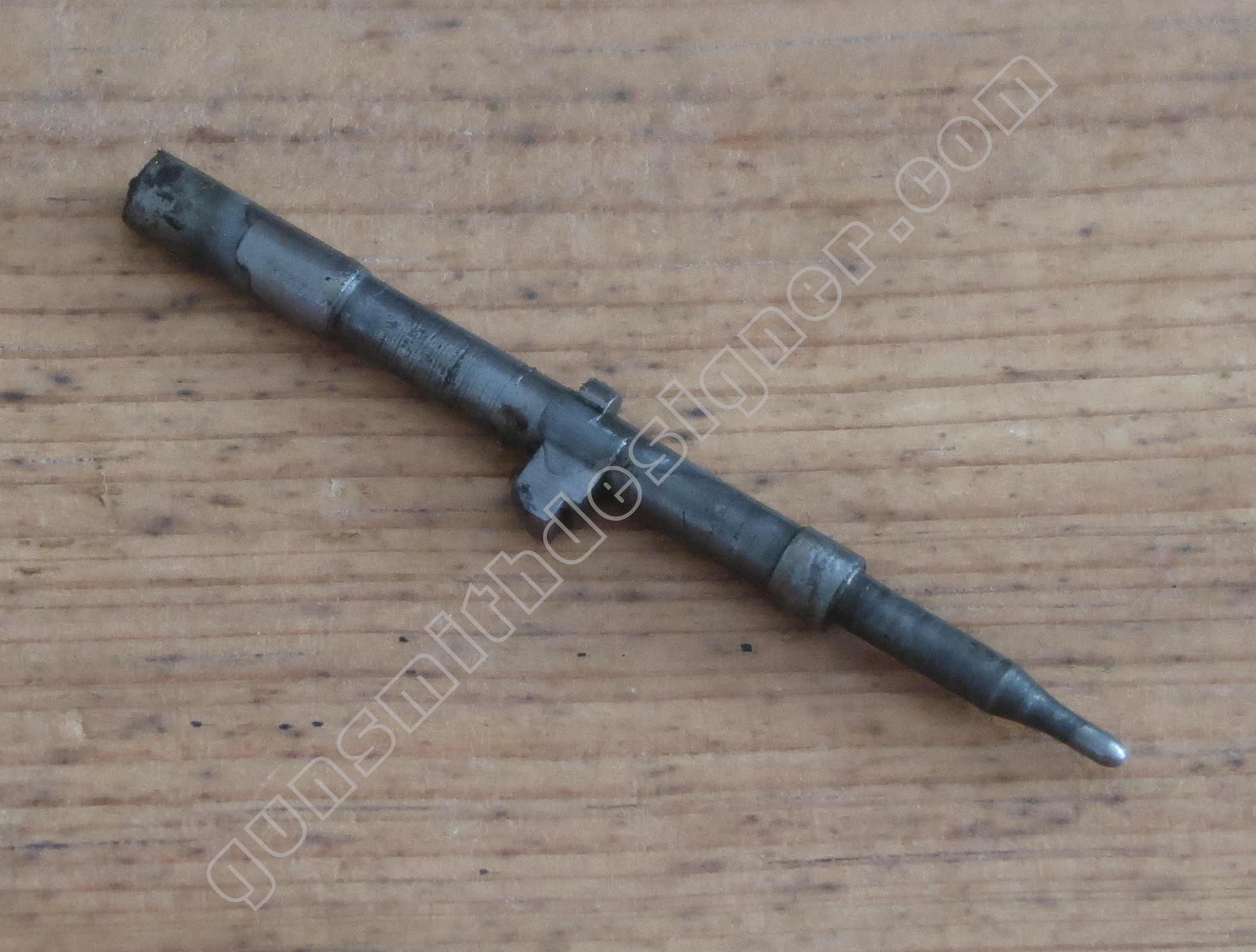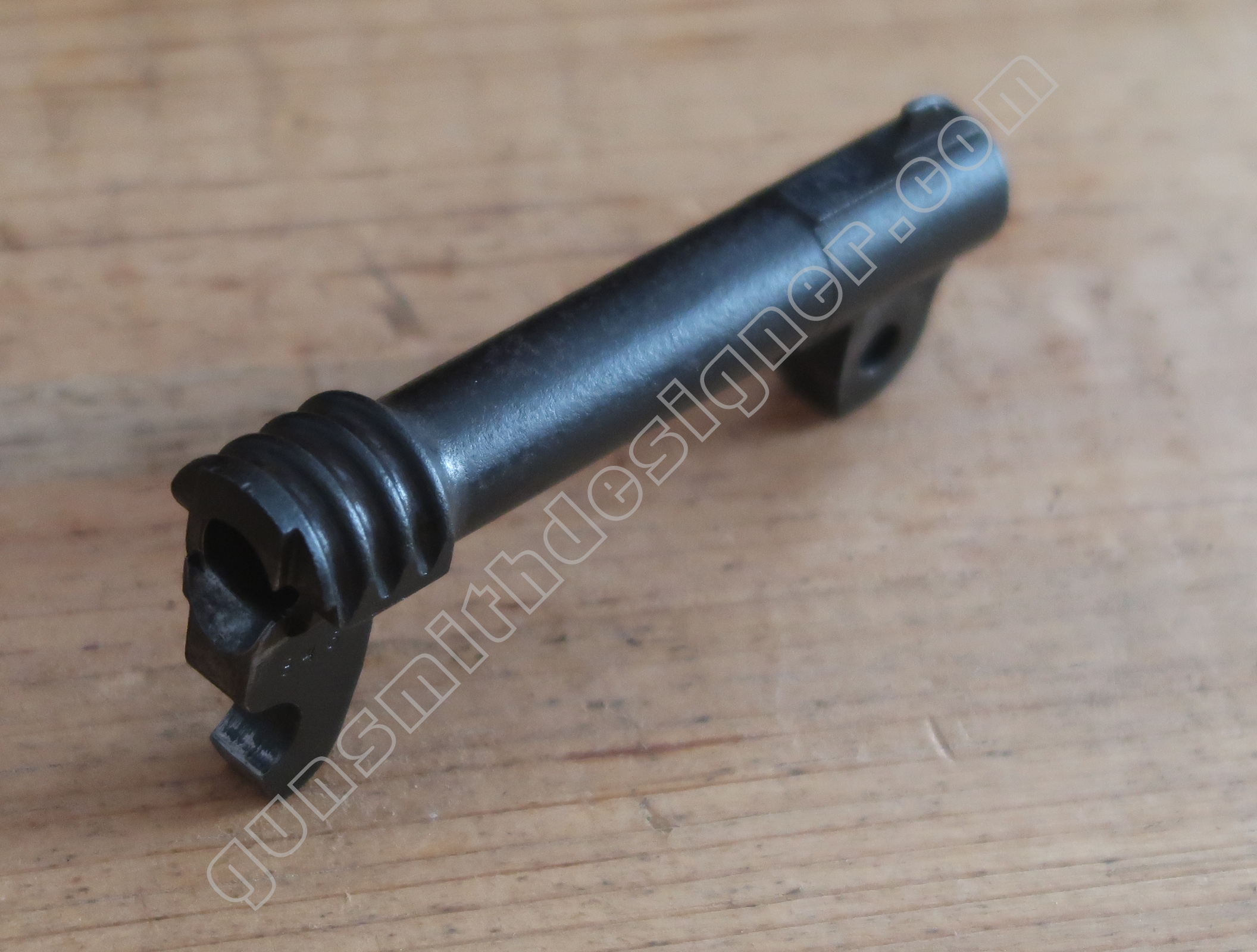 L’axe de canon est en acier. Cette pièce est amovible, en enlevant cette pièce le canon peut être extrait de la carcasse. La tête de l’axe de canon se verrouille sur un pion porté par la carcasse. Pour désolidariser la culasse de l’arme, il faut au préalable démonter le canon.