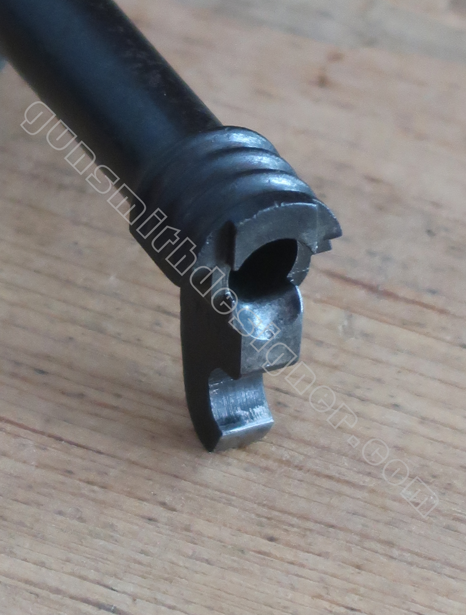 Le logement de la queue de détente est usiné sur la face gauche de la carcasse. Grace à cette configuration, le servant peu démonté simplement la queue de détente et approfondir l’entretien de son arme.