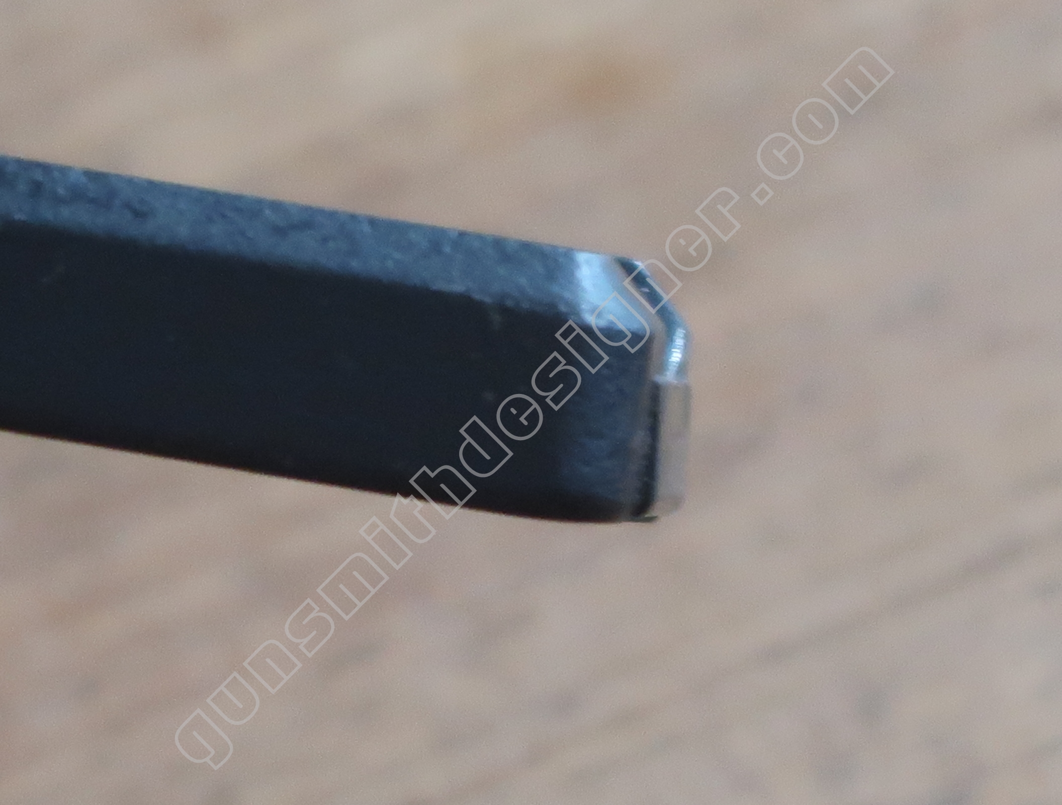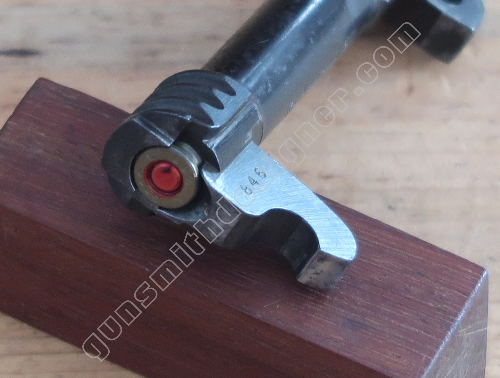 Une butée est aménagée à l’avant de la culasse. C’est cette surface qui est en contacte avec la carcasse. Il est à noter que cette butée est biseautée, elle n’est pas perpendiculaire au dessous de la culasse.