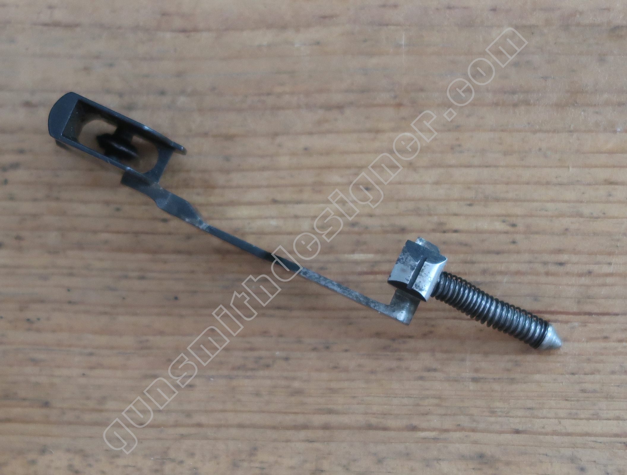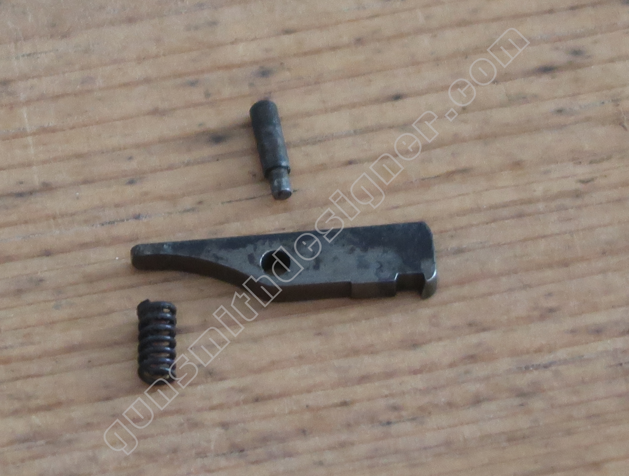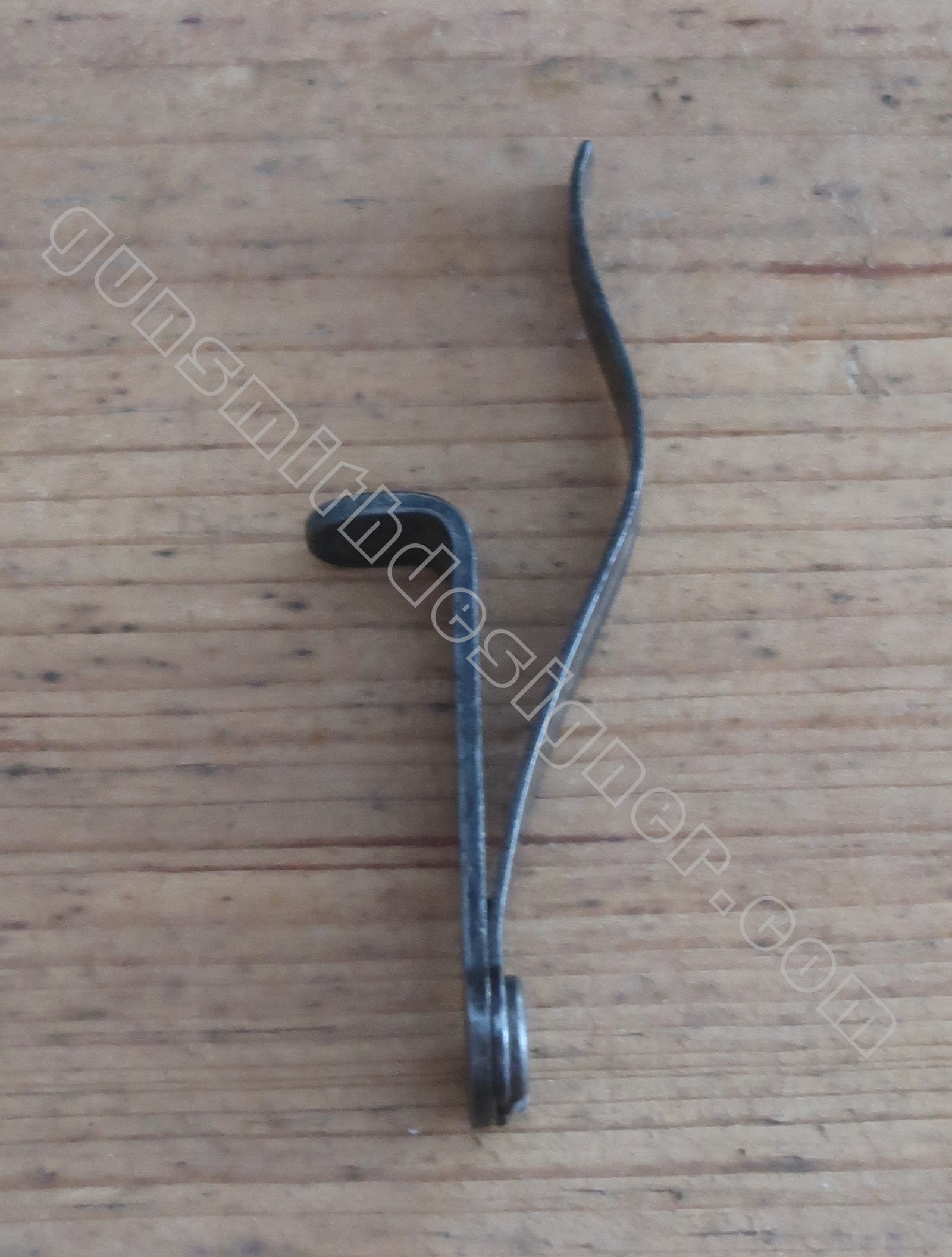 Le ressort de queue de détente et la tige guide de ressort de queue de détente ramène la queue de détente sur sa butée avant et sur le dessus de son rail de guidage. Les dimensions du ressort dépliée du ressort : 57 mm. Le diamètre externe du ressort est : 5 mm. Une des extrémités est évasée, elle mesure 5,5 mm. Le diamètre du fil est : 0,5 mm.