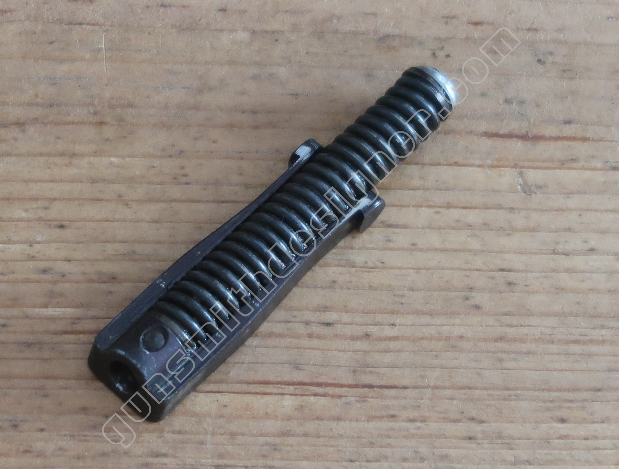 Le ressort récupérateur est très dur. Je n’ai pas désolidarisé le ressort de l’ensemble car la goupille est difficile à sortir. Monté sur sa pièce support, le ressort n’est pas compressible à la main. Le diamètre extérieur du ressort est 8,4 mm. Le diamètre du fil est d’environ 1,5 mm.