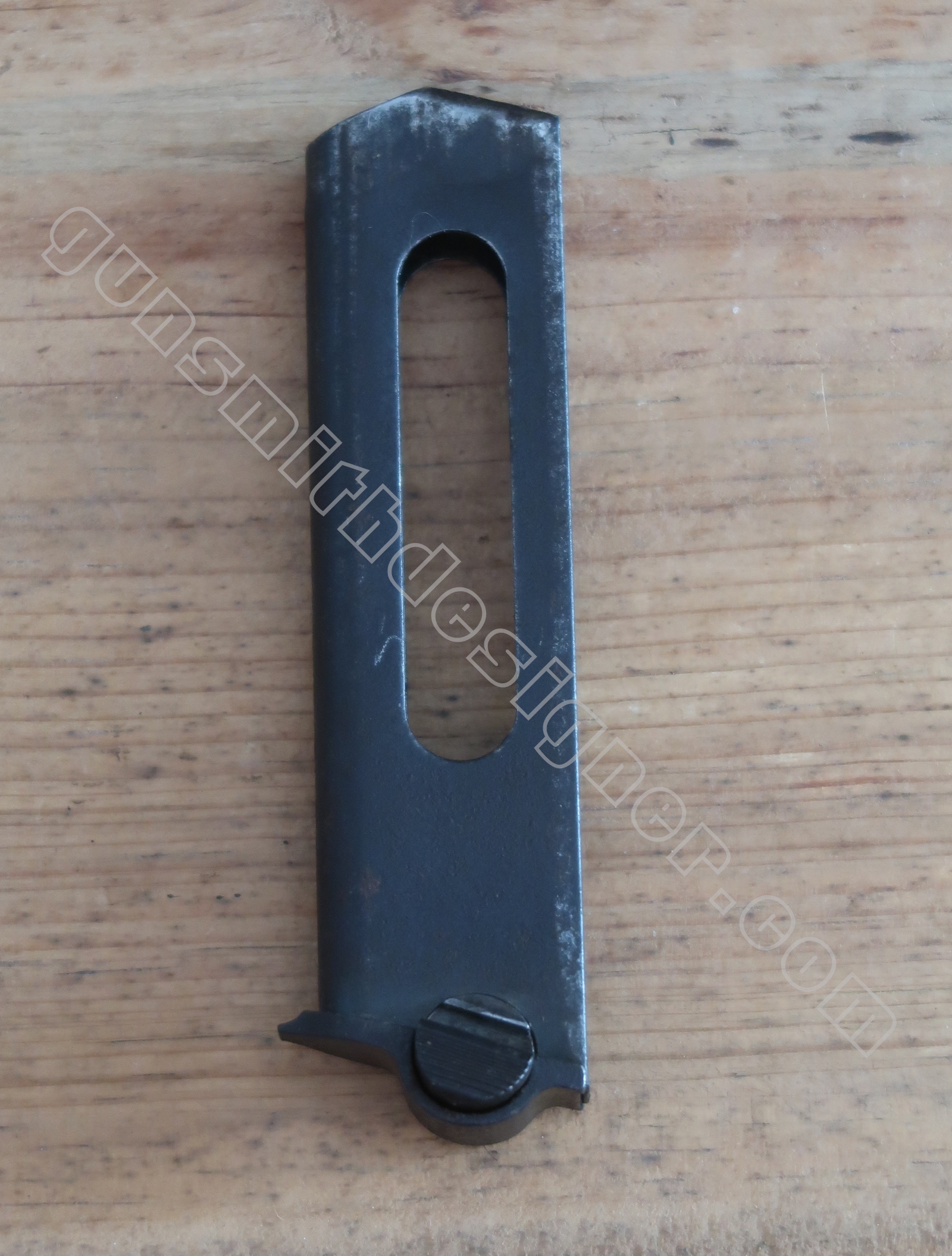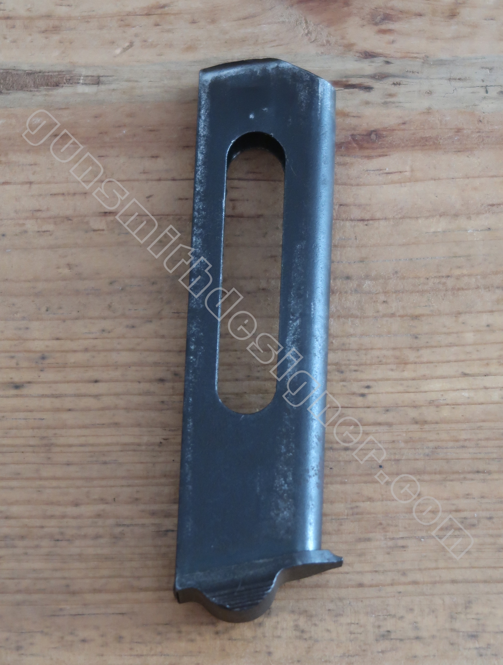 Le support du ressort récupérateur est en acier. Il coulisse dans un logement prévu à cet effet à l’avant du logement du chargeur. Il est usiné de sorte que deux petites oreilles sont présentes de chaque coté. C’est sur celle-ci que viennent reposer les bras relais de ressort récupérateur.
