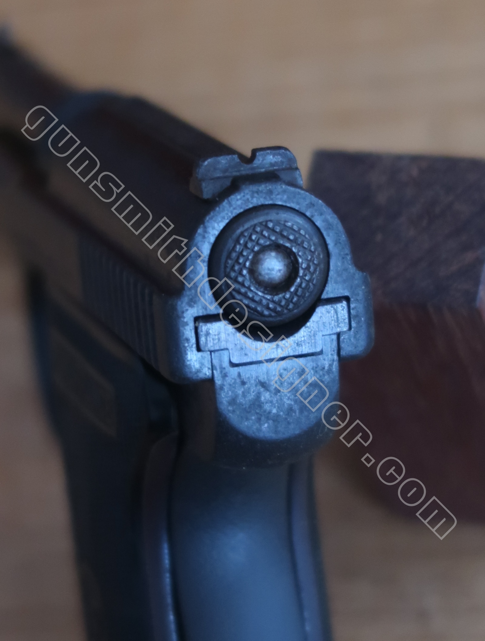 La hausse est en acier. Elle est montée par queue d’aronde sur le corps de la culasse. La largeur du cran de hausse est : 1,6 mm. La hausse dépasse de 2,7 mm du dessus de la culasse.