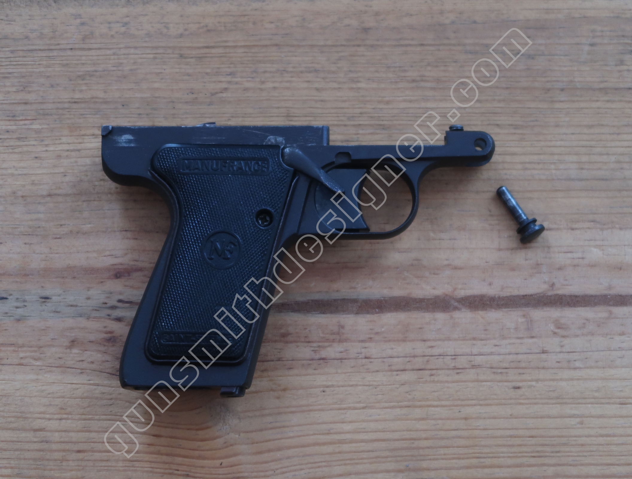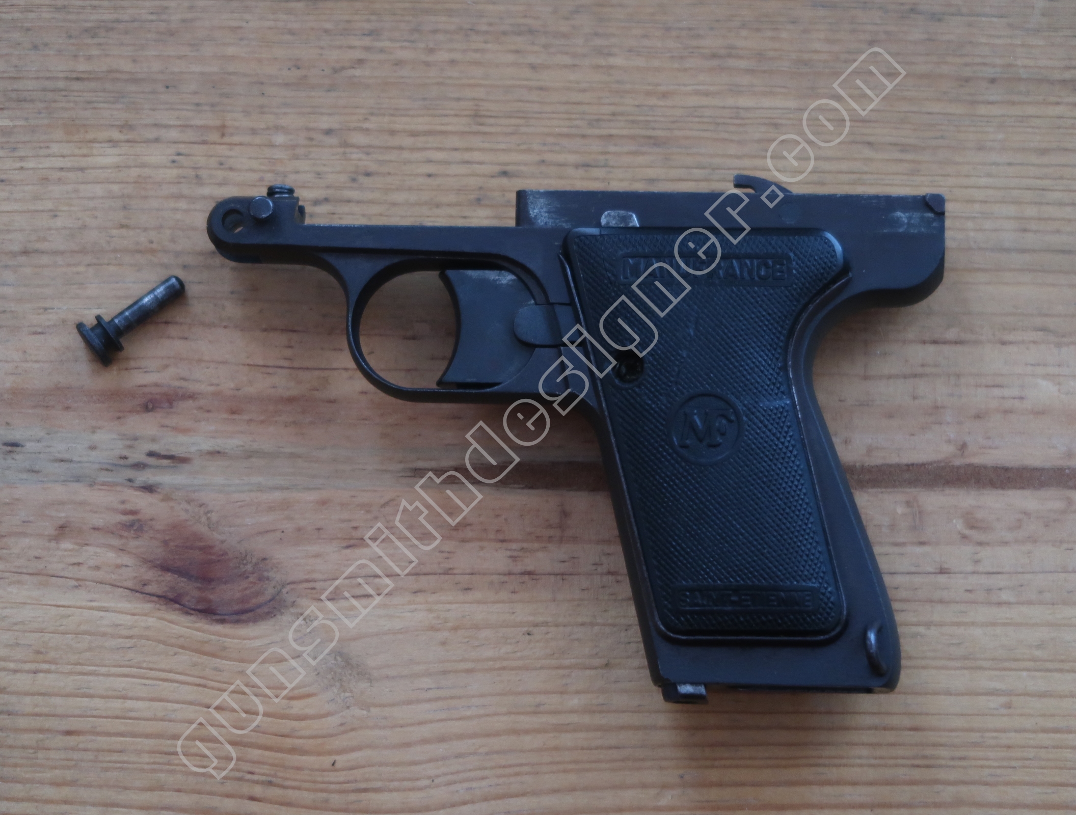 Sur le pistolet Le Français en 7,65 mm, le verrou du chargeur est porté par le chargeur lui même. L’encoche du crochet de chargeur se trouve à l’entrée du logement de chargeur.