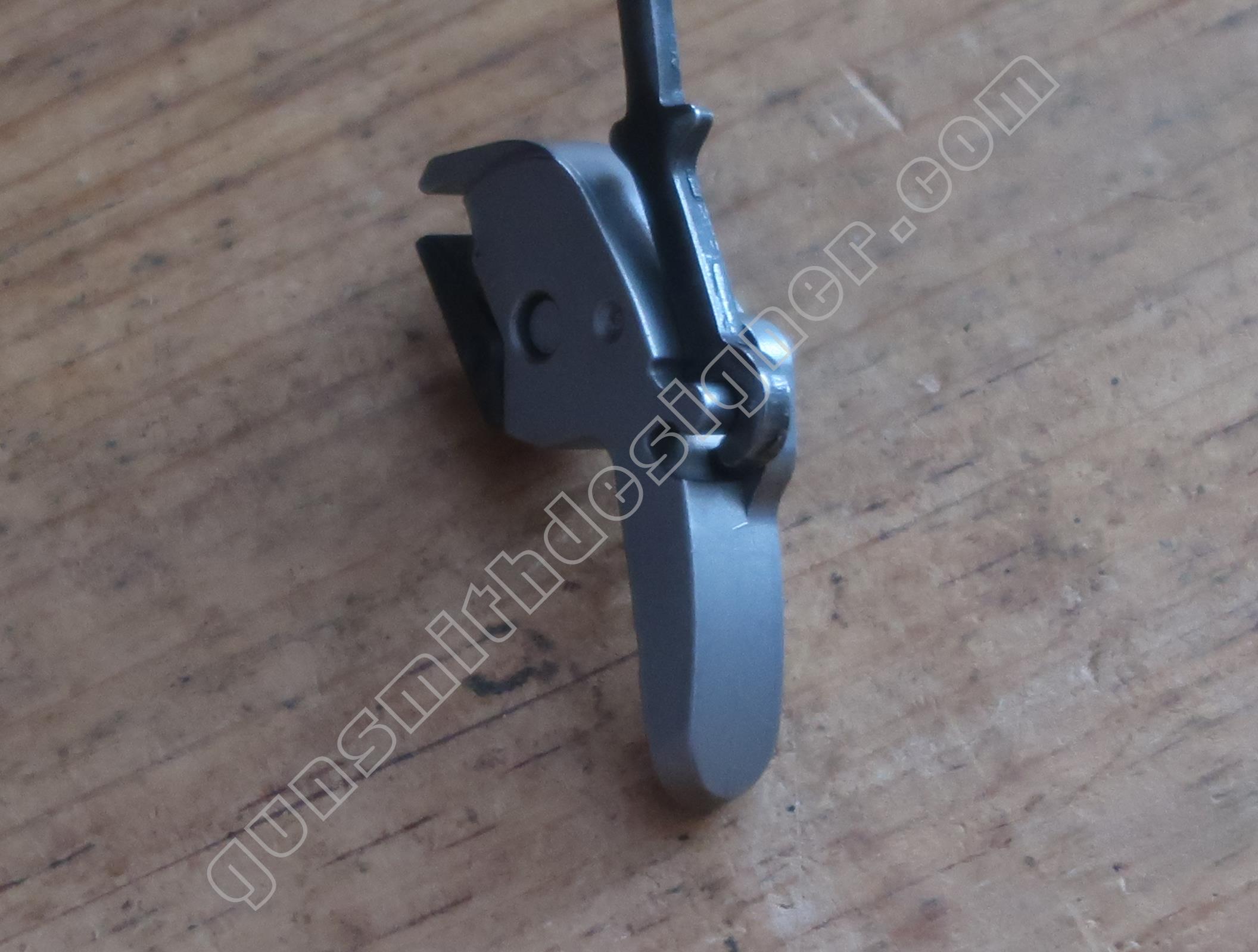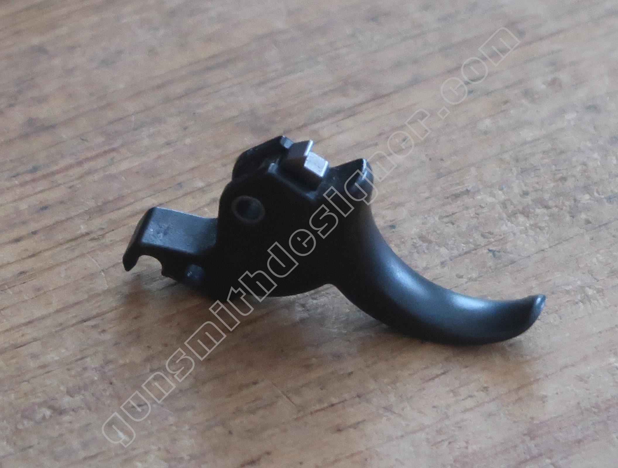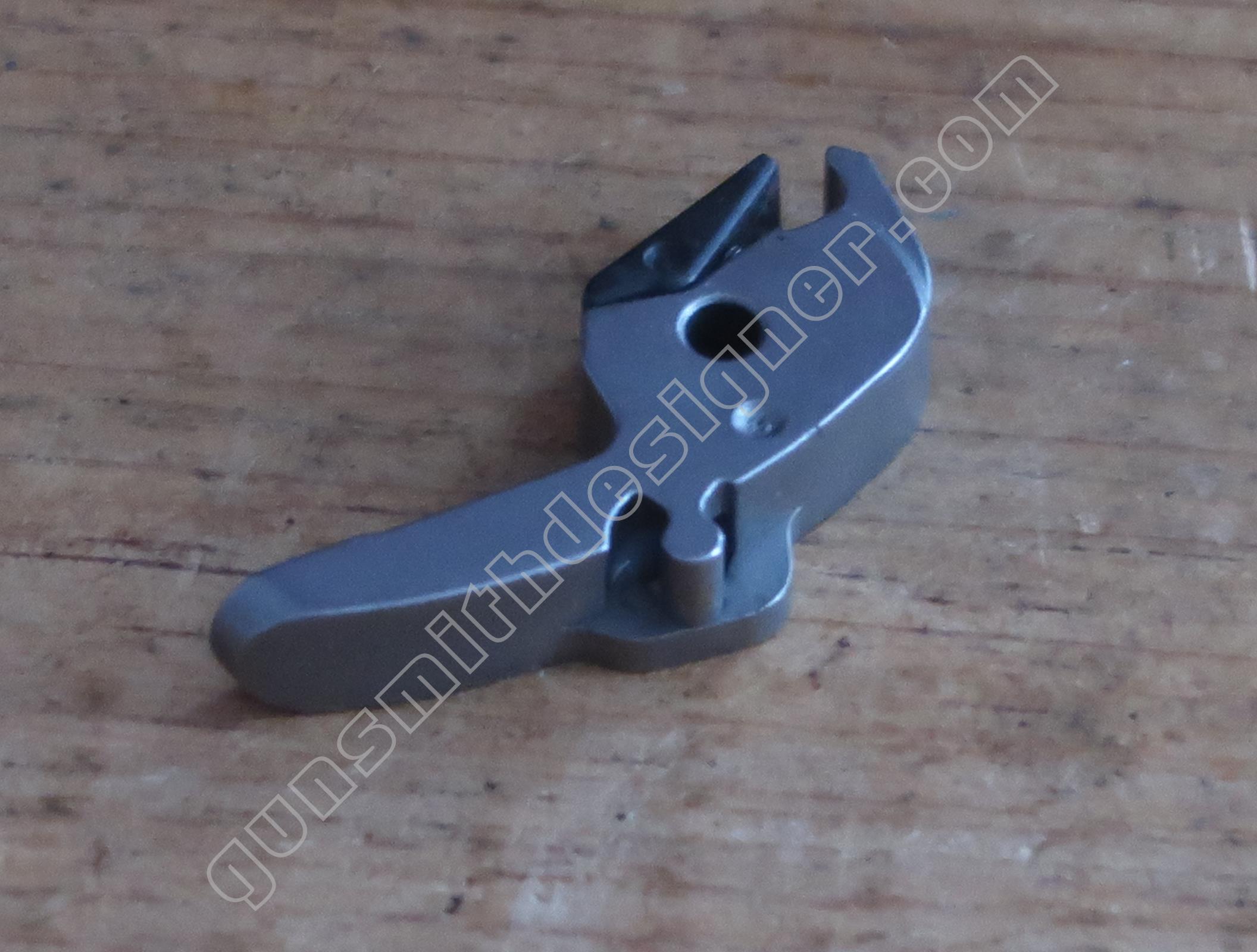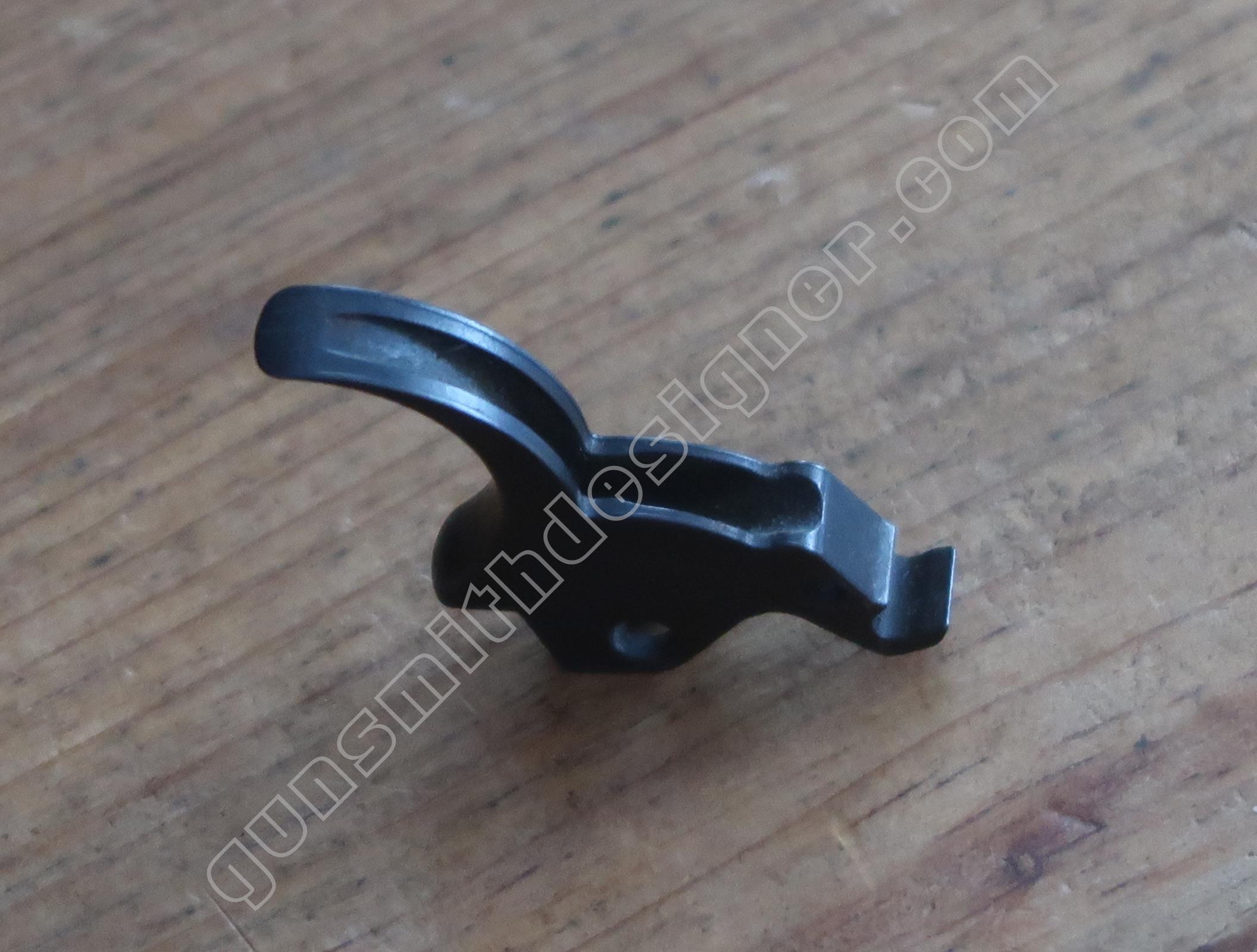 La queue de détente est une pièce de micro-fusion en acier. Elle possède une forme unique qui ne peut être obtenue qu’en micro-fusion. La queue de détente pivote autour d’un axe qui ne peut être extrait que par le coté droit de la carcasse.