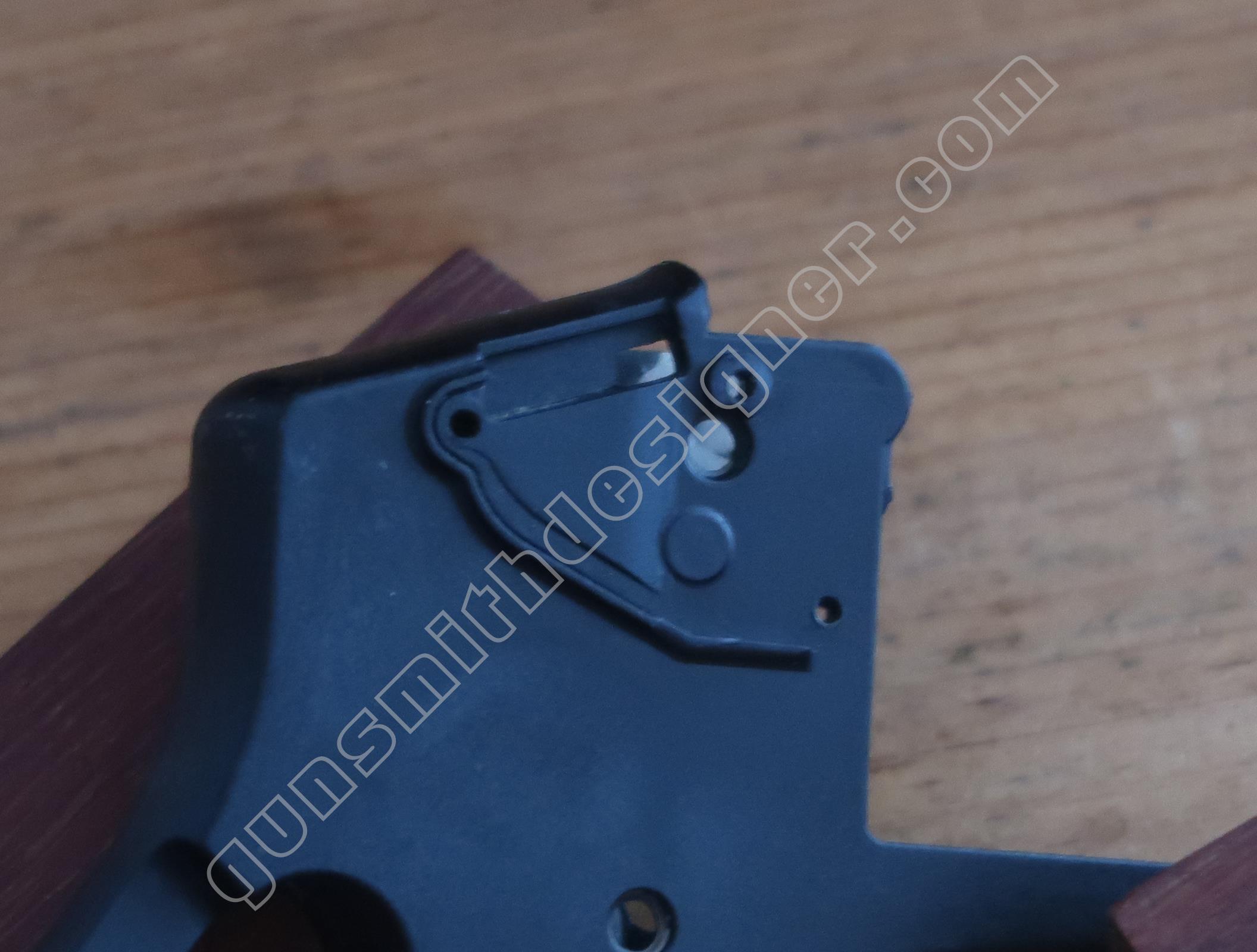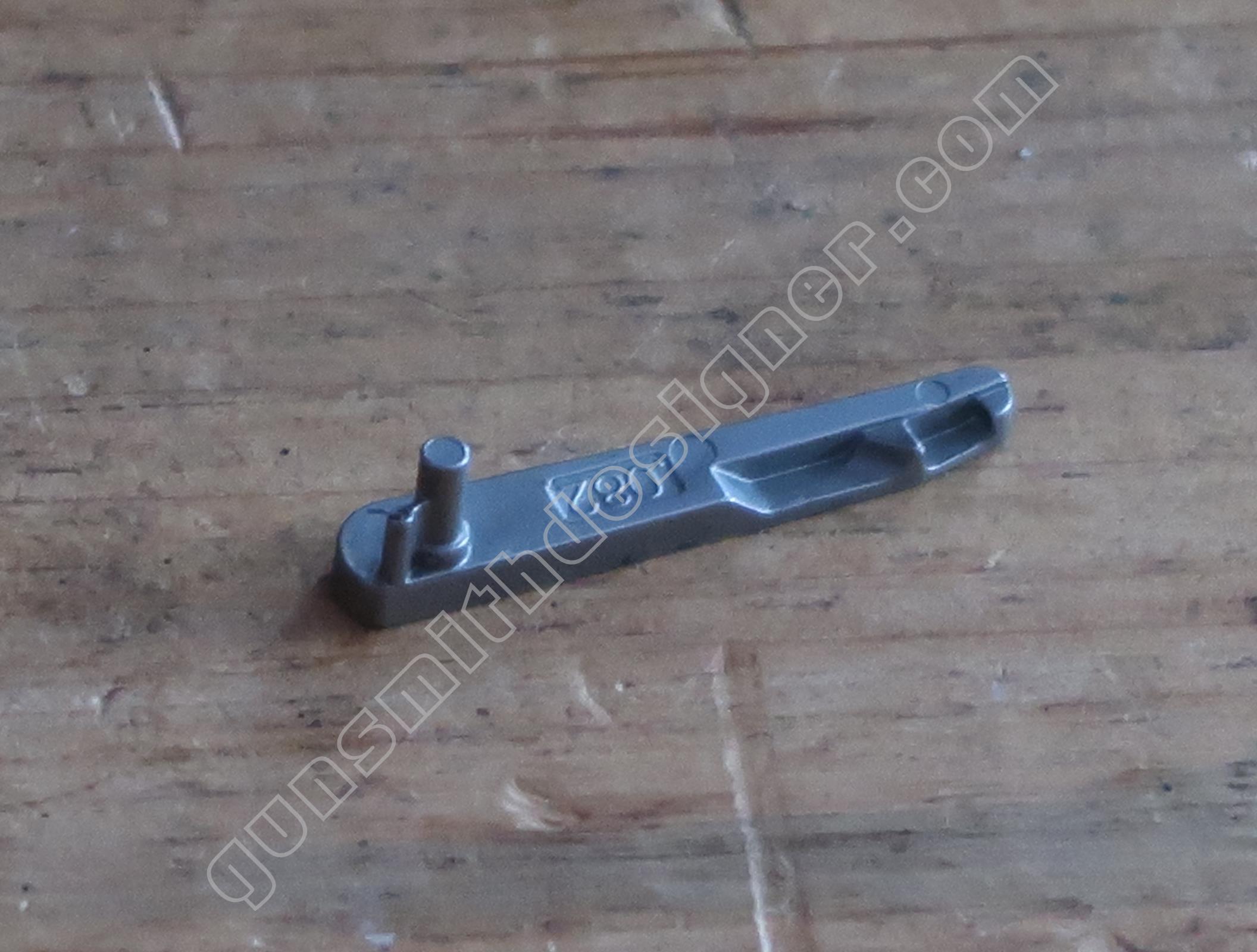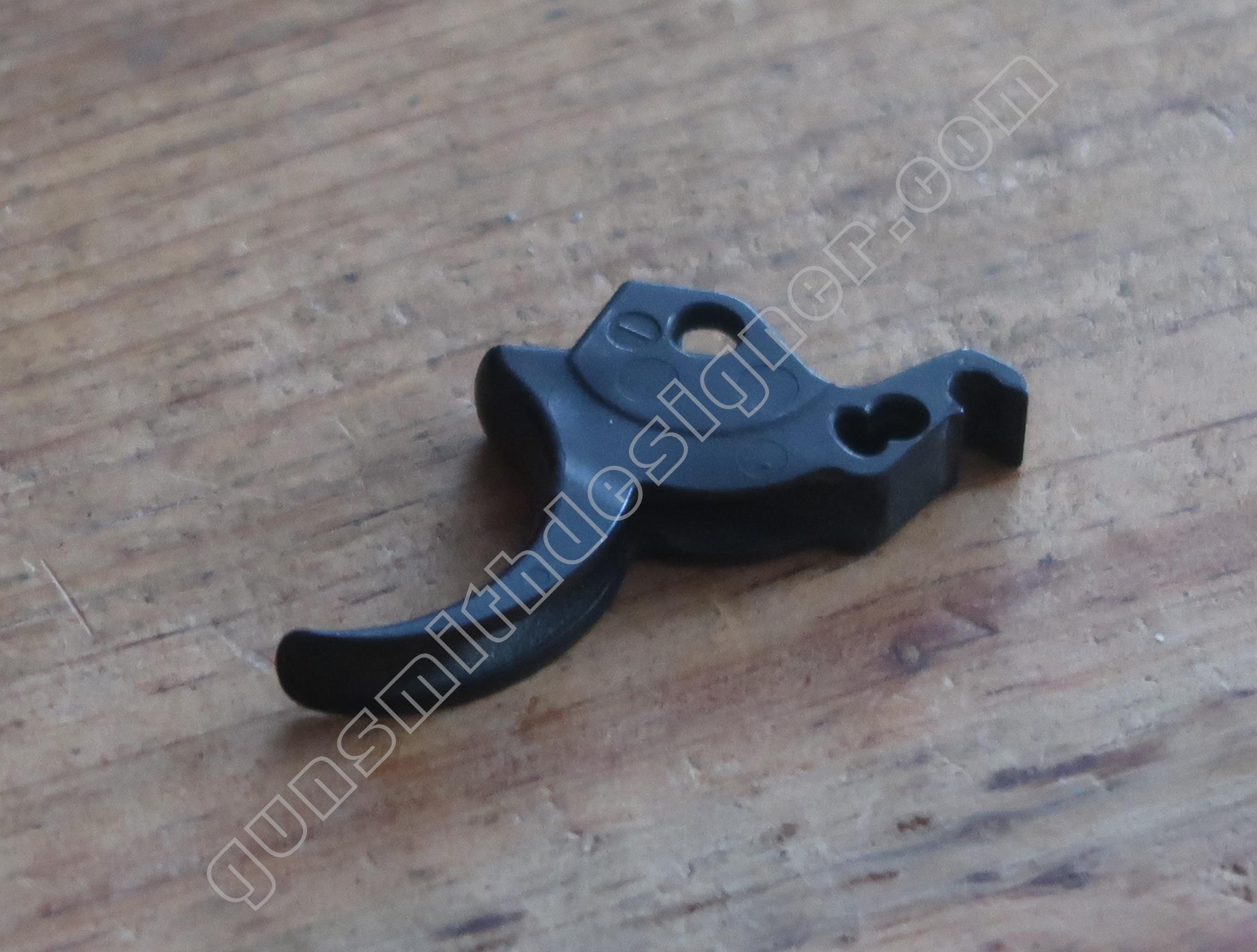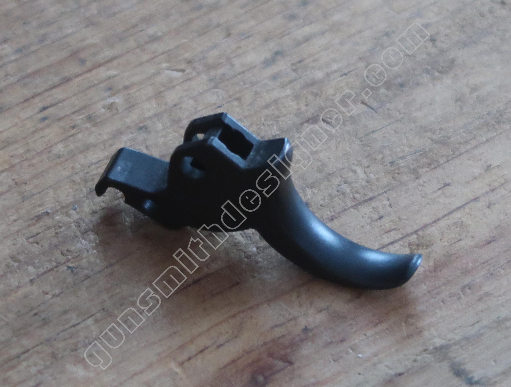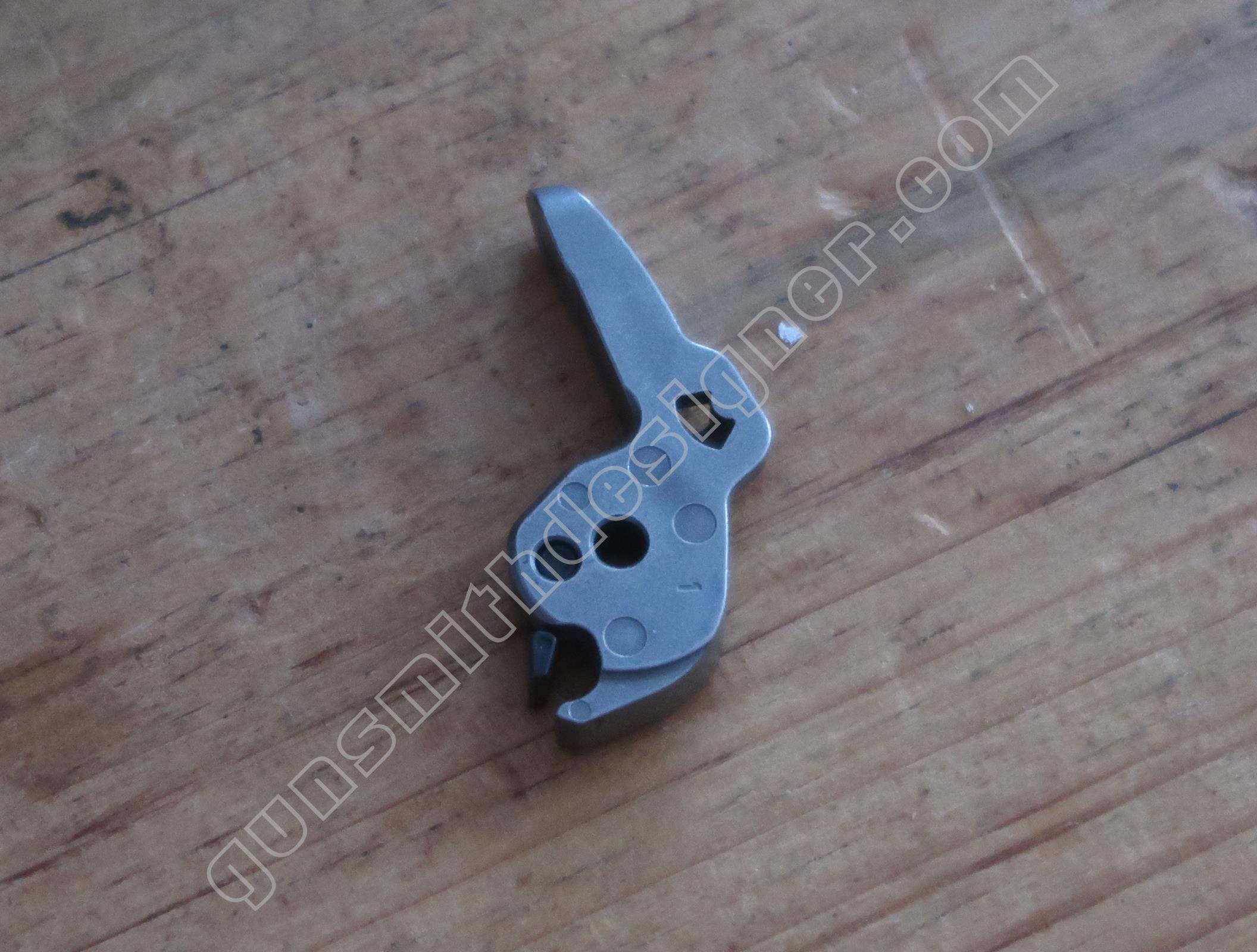 La queue de détente est une pièce de micro-fusion en acier. Elle possède une forme unique qui ne peut être obtenue qu’en micro-fusion. La queue de détente pivote autour d’un axe qui ne peut être extrait que par le coté droit de la carcasse.