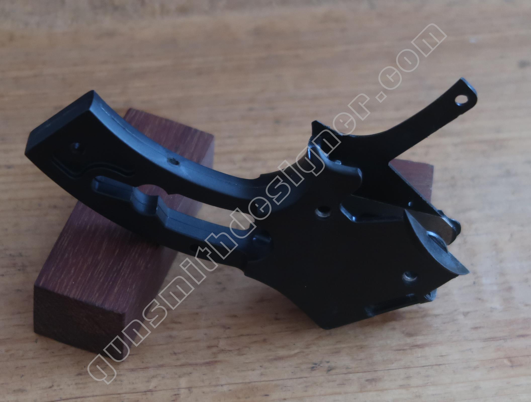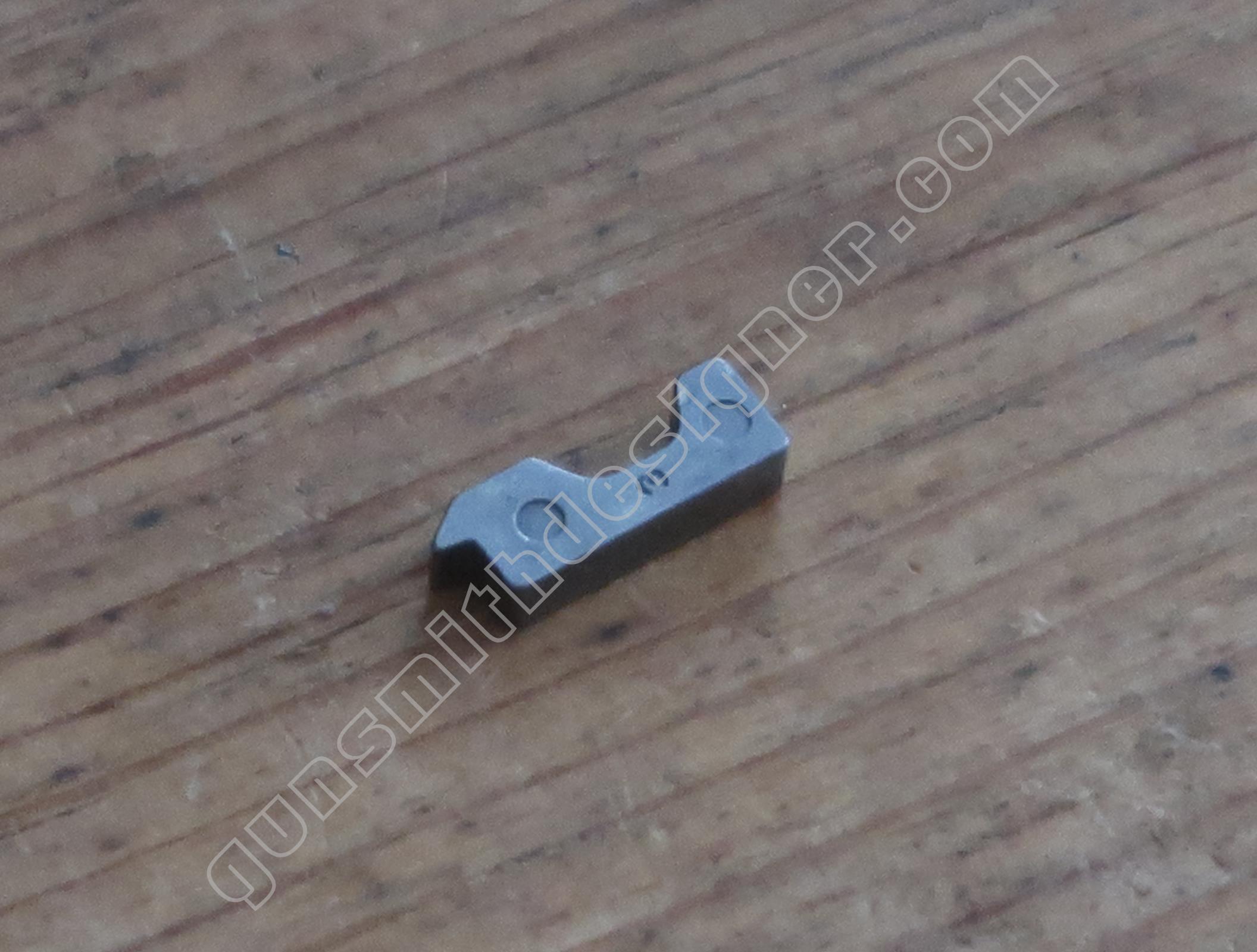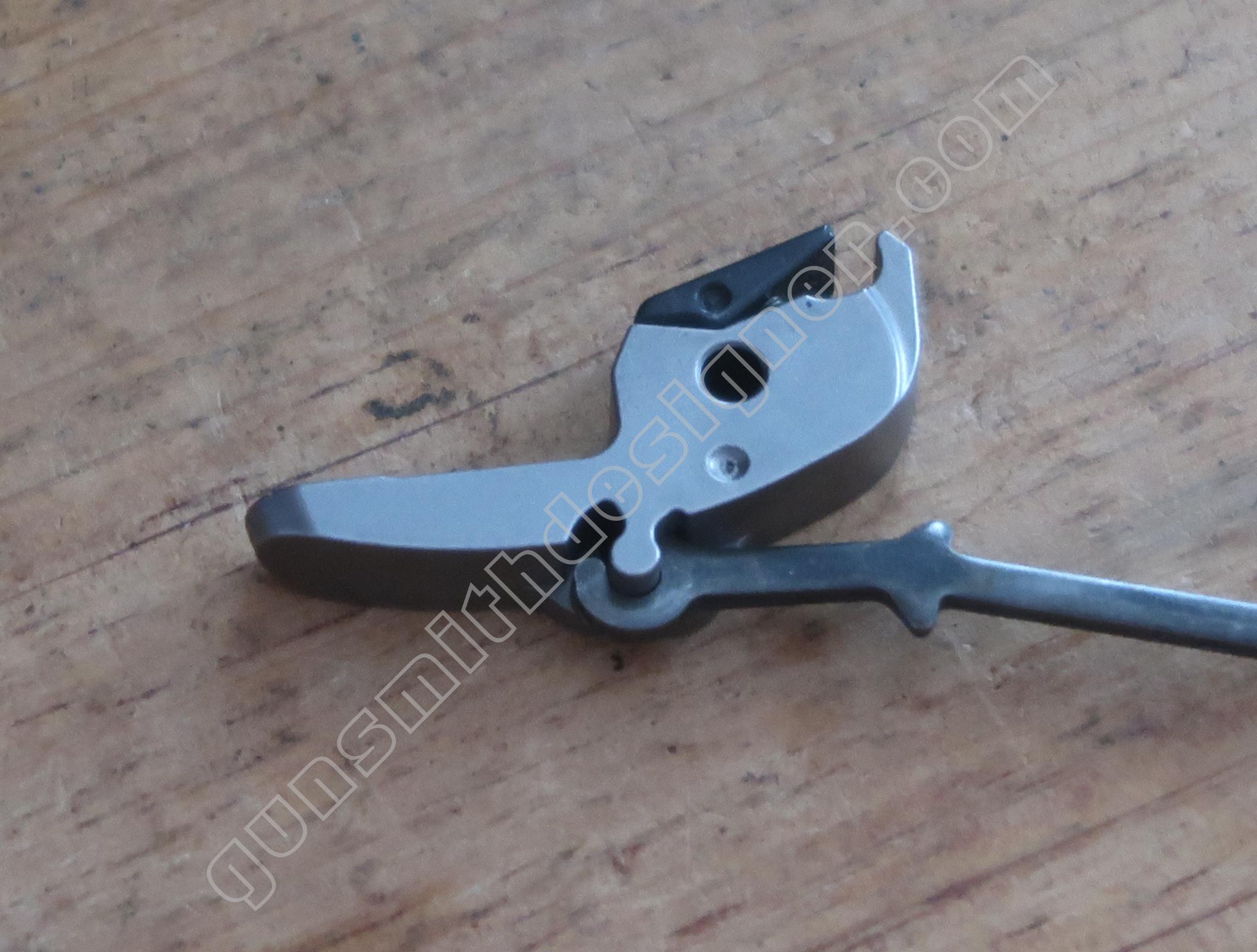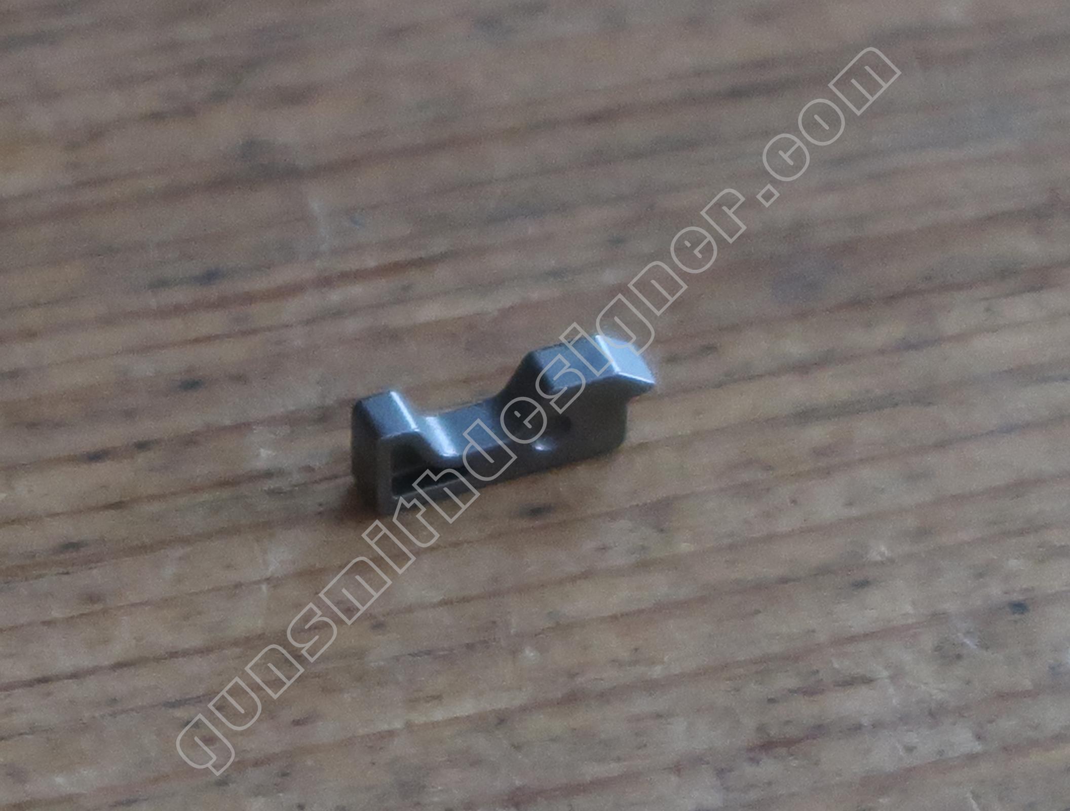 La queue de détente est une pièce de micro-fusion en acier. Elle possède une forme unique qui ne peut être obtenue qu’en micro-fusion. La queue de détente pivote autour d’un axe qui ne peut être extrait que par le coté droit de la carcasse.