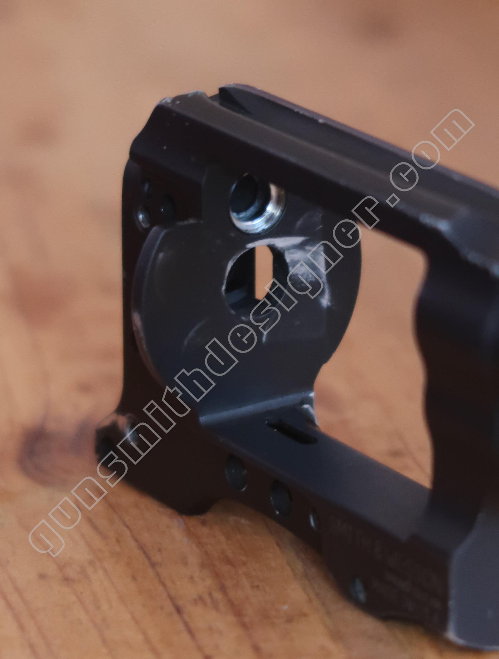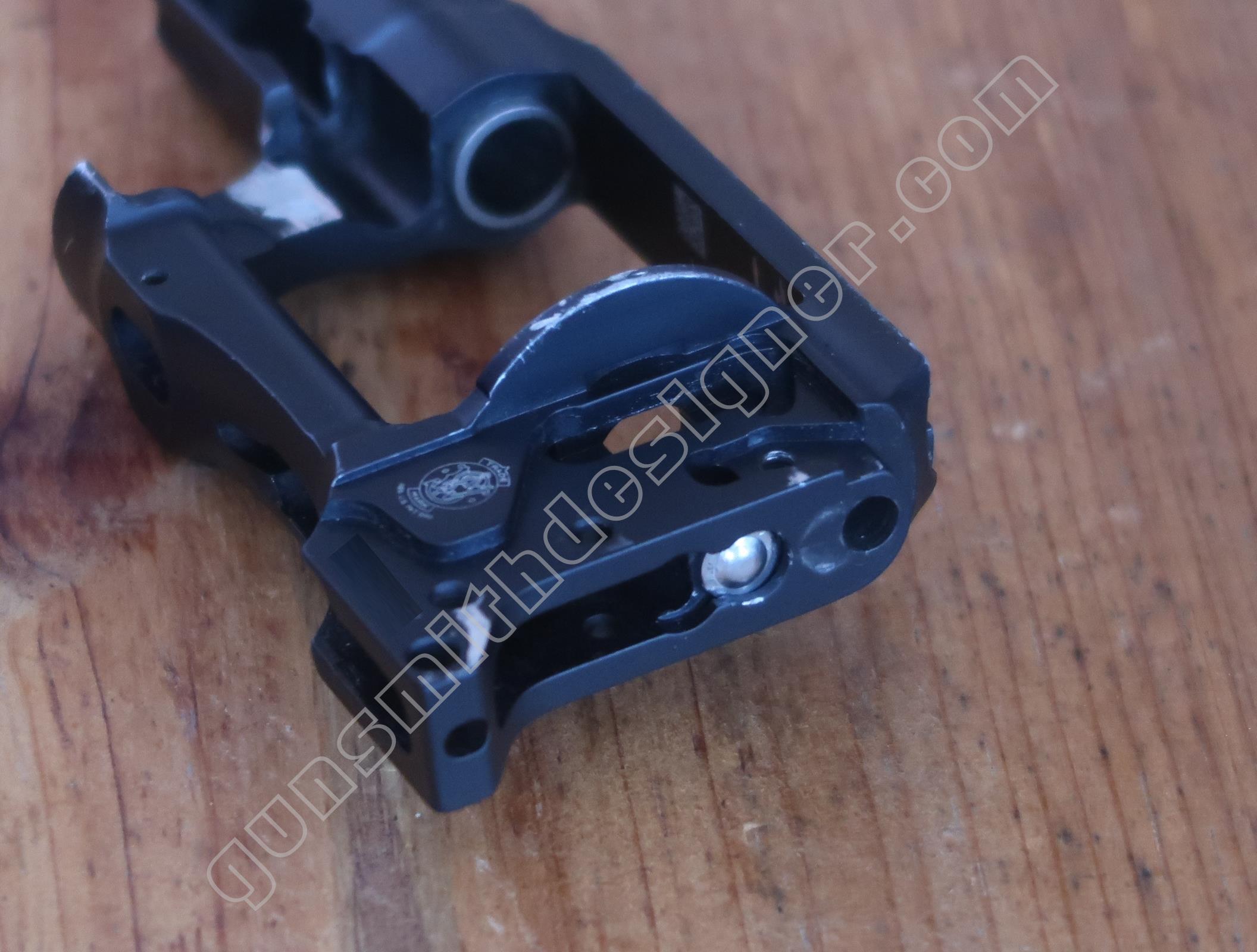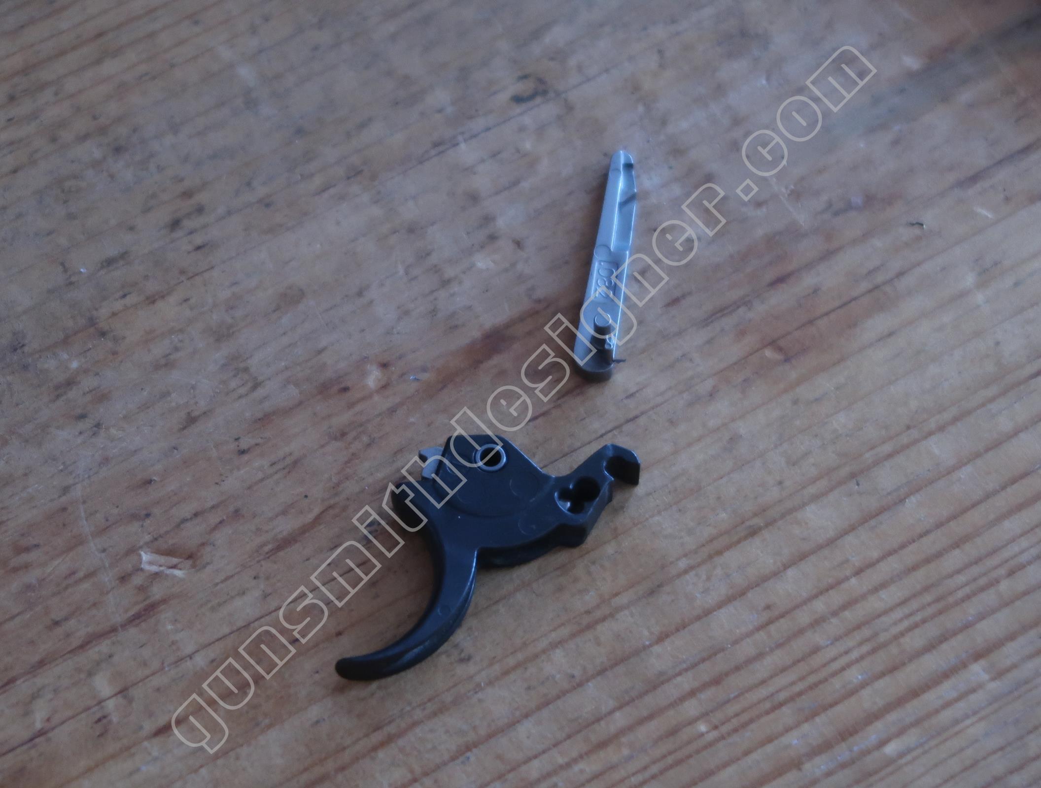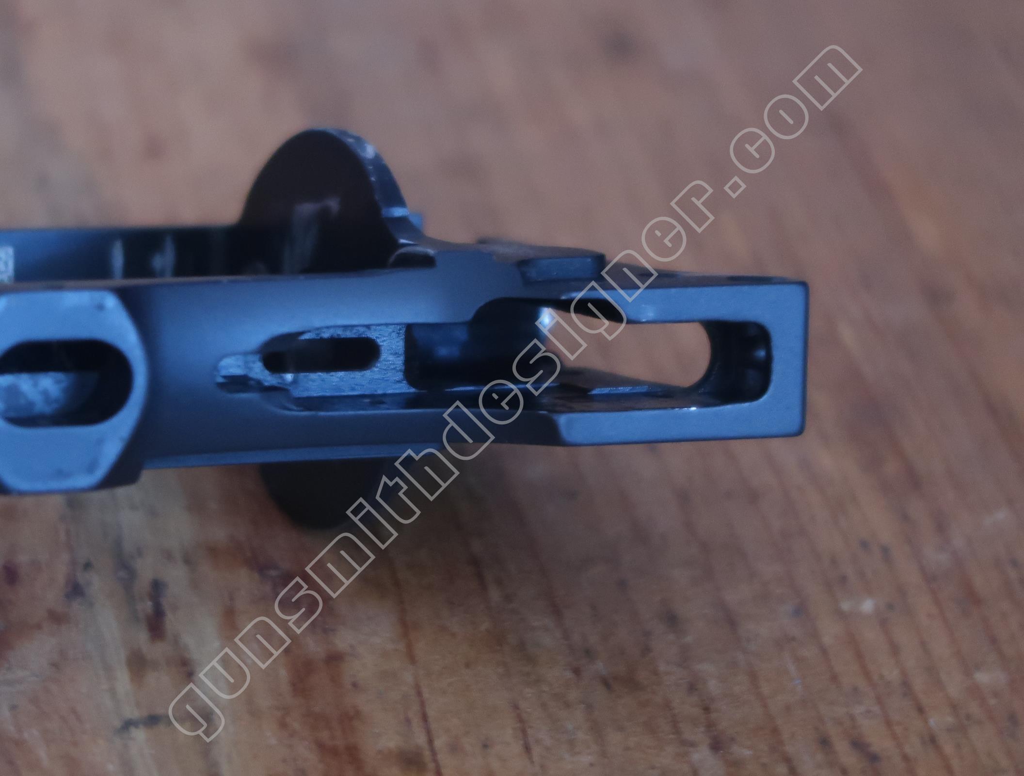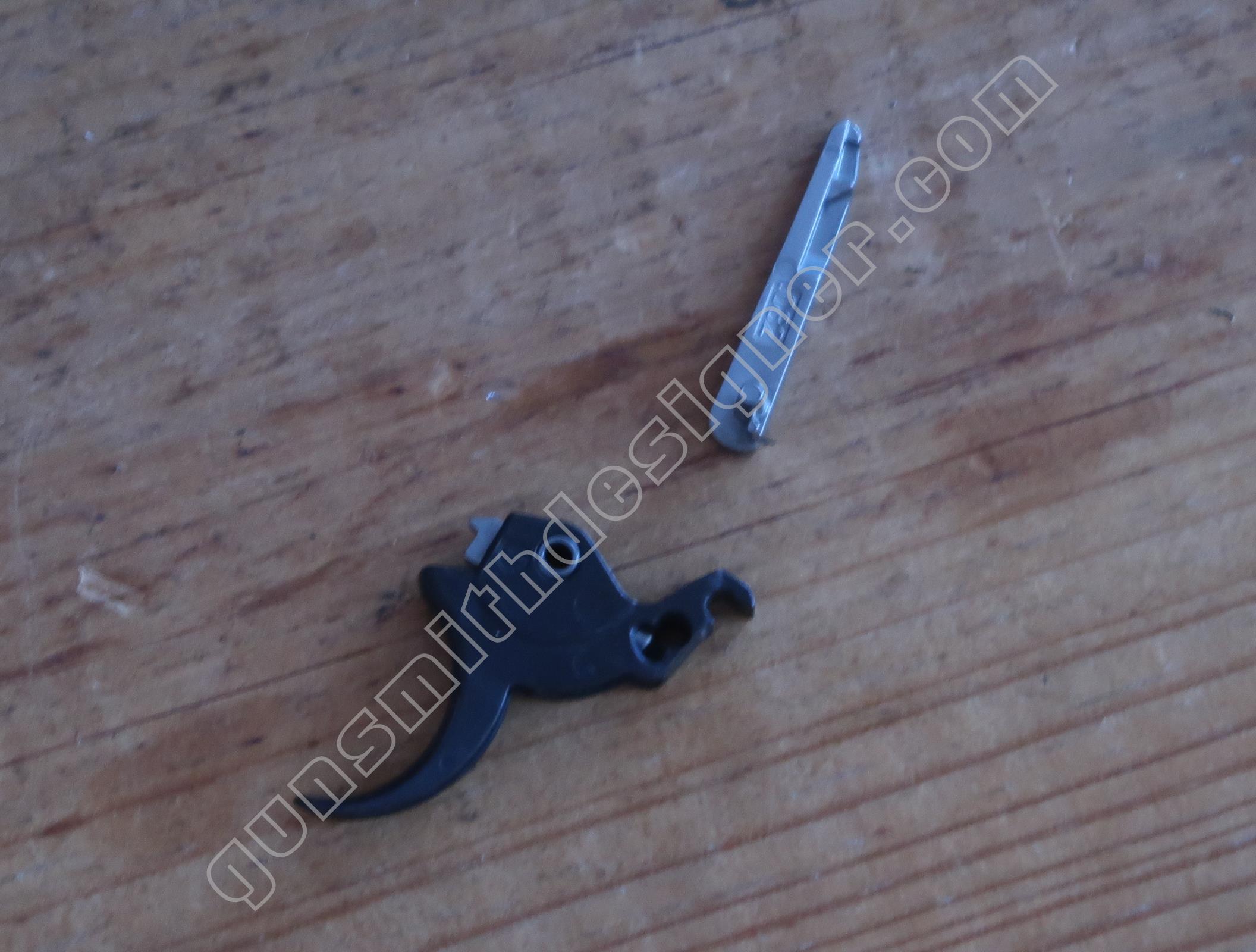La queue de détente est une pièce de micro-fusion en acier. Elle possède une forme unique qui ne peut être obtenue qu’en micro-fusion. La queue de détente pivote autour d’un axe qui ne peut être extrait que par le coté droit de la carcasse.