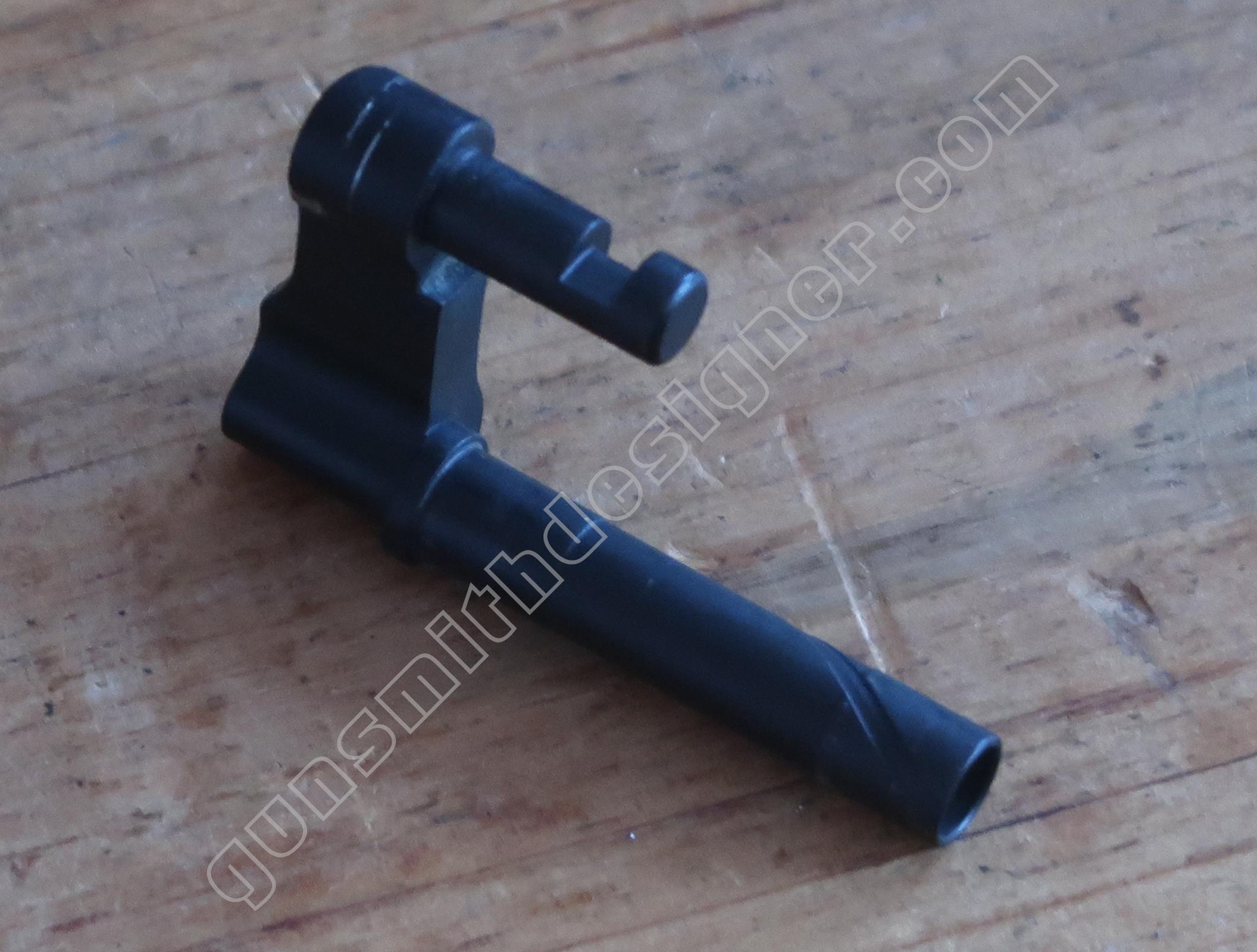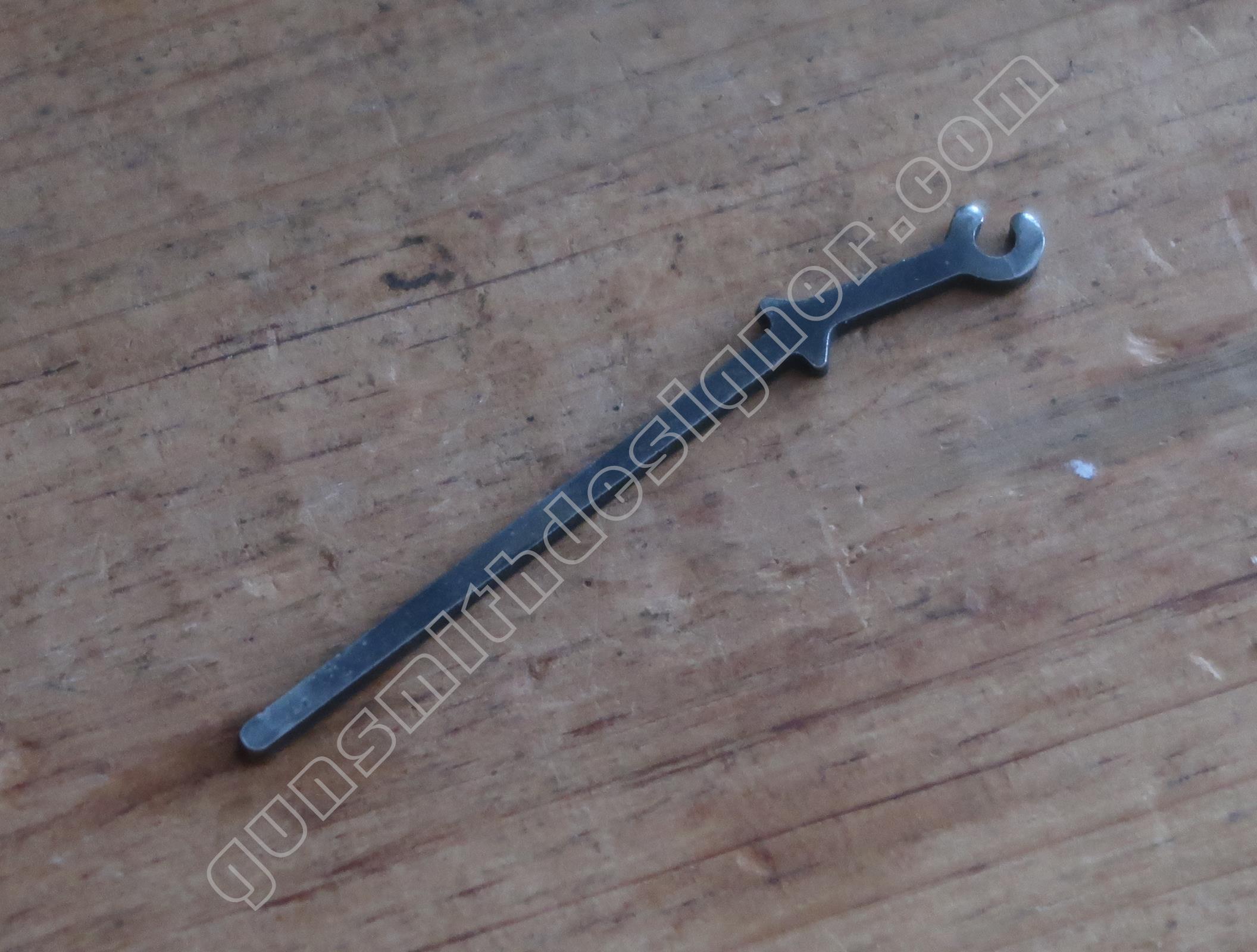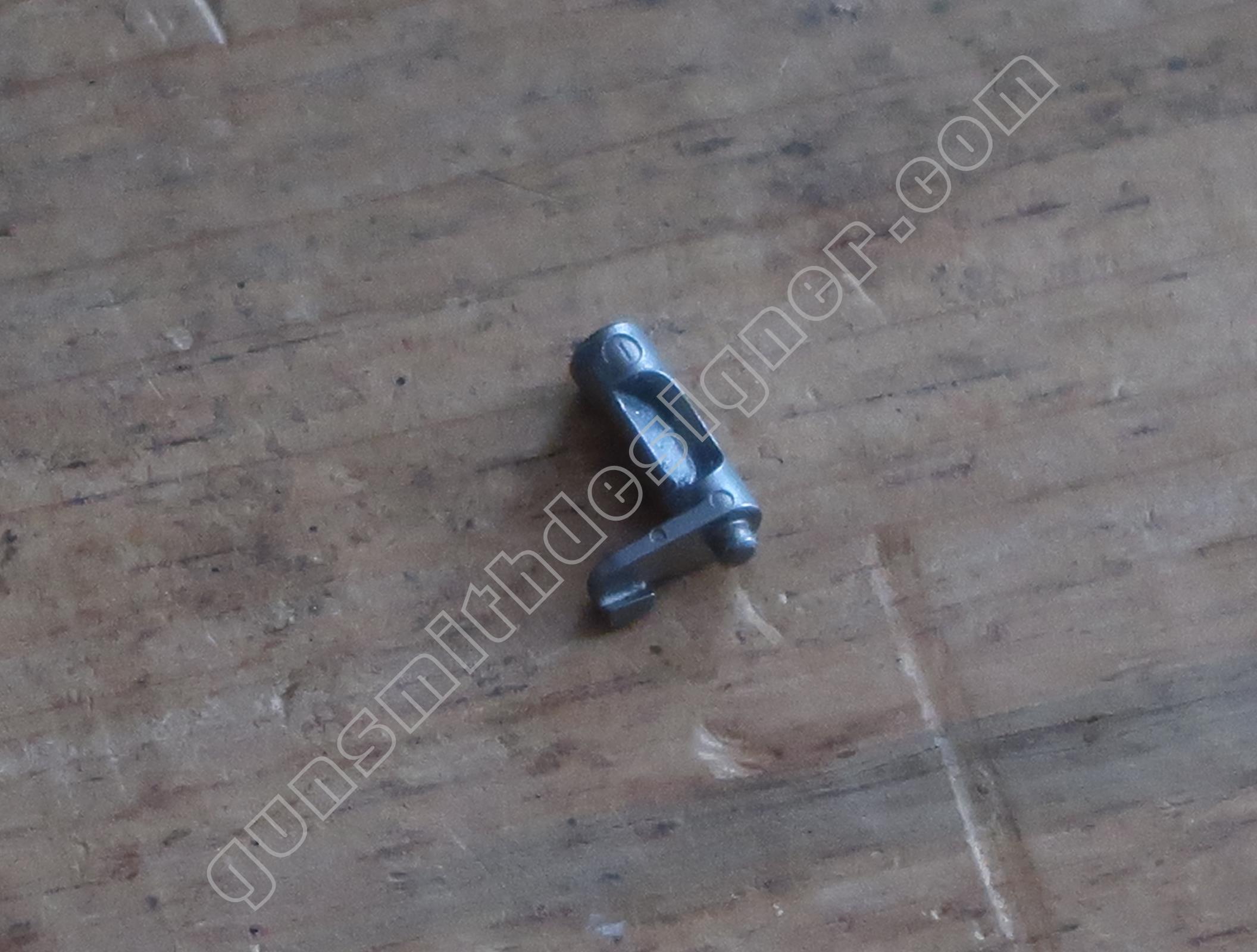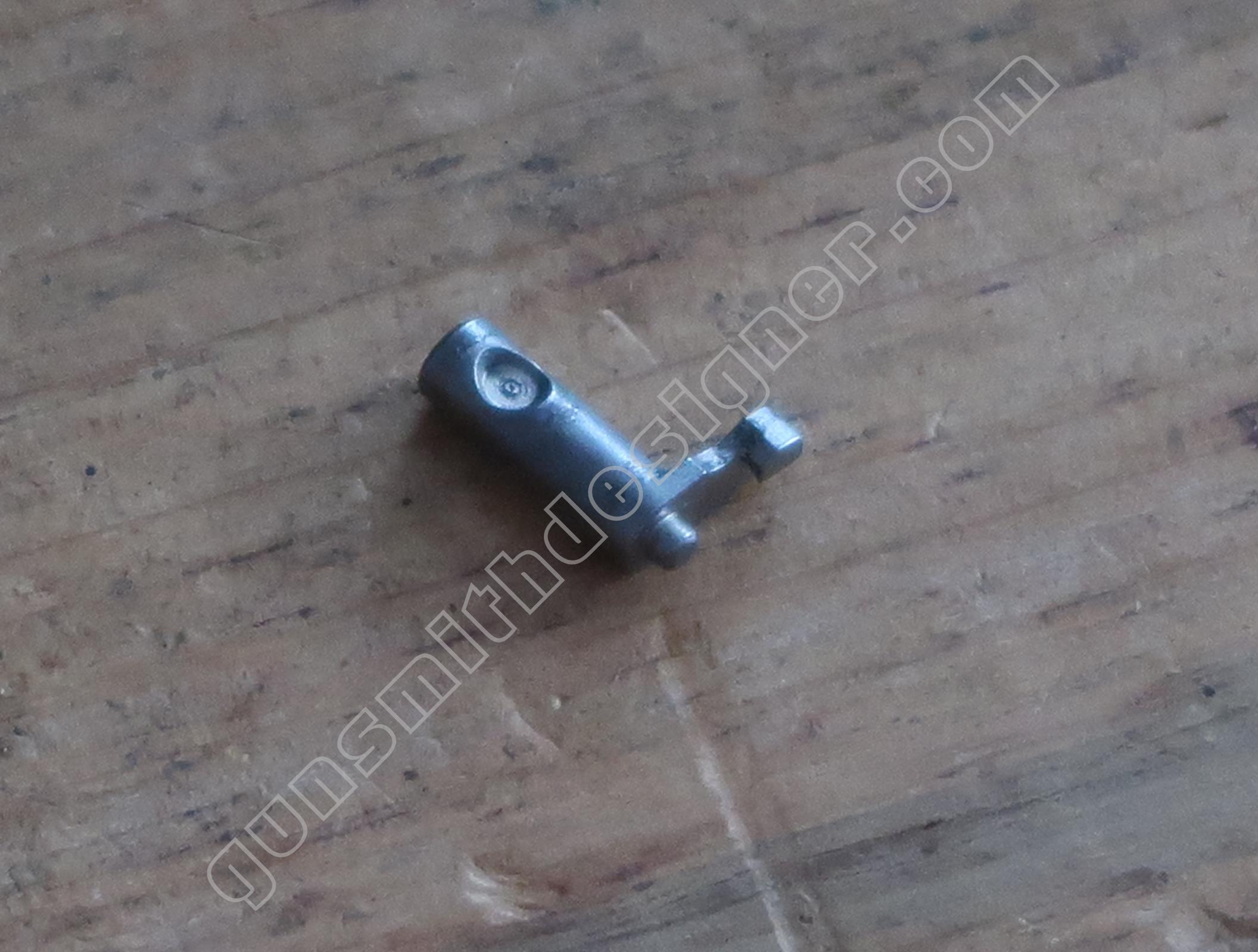 La commande du verrou de barillet est portée par la queue de détente. C’est également une pièce de micro-fusion. Elle est mue par un ressort hélicoïdale de dimensions : longueur : 9 mm, diamètre extérieur : 2,9 mm, diamètre du fil : 0,2 mm. un petit cylindre en acier le maintien sur la queue de détente.