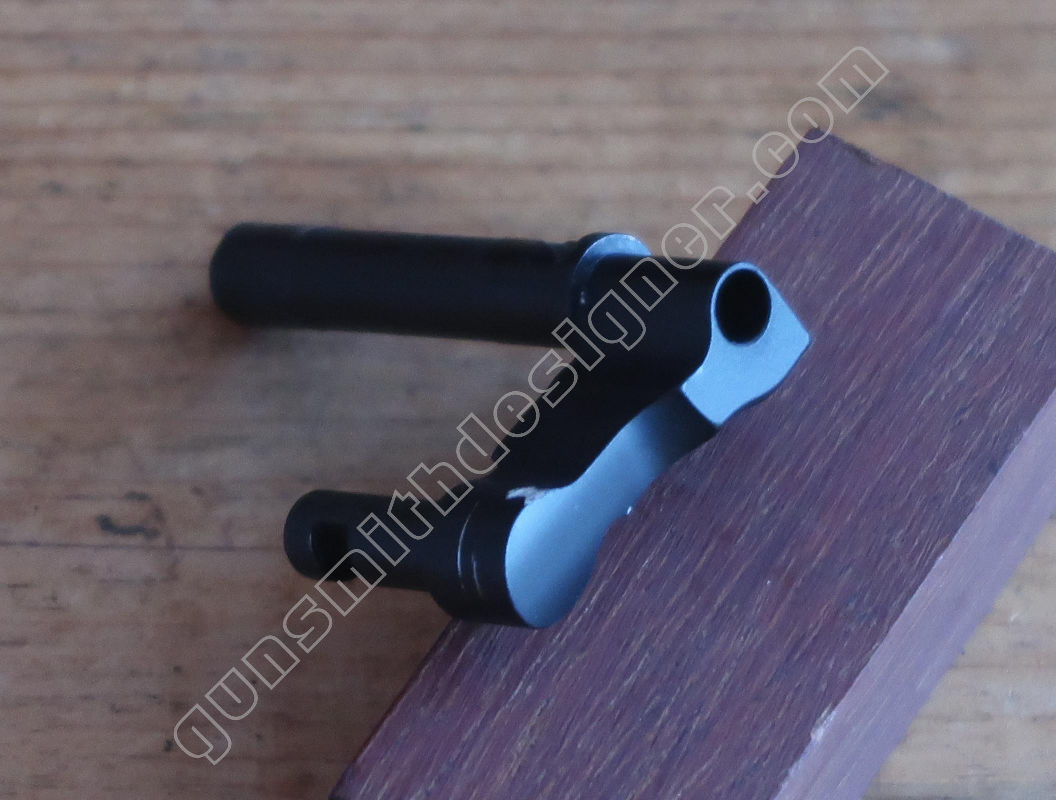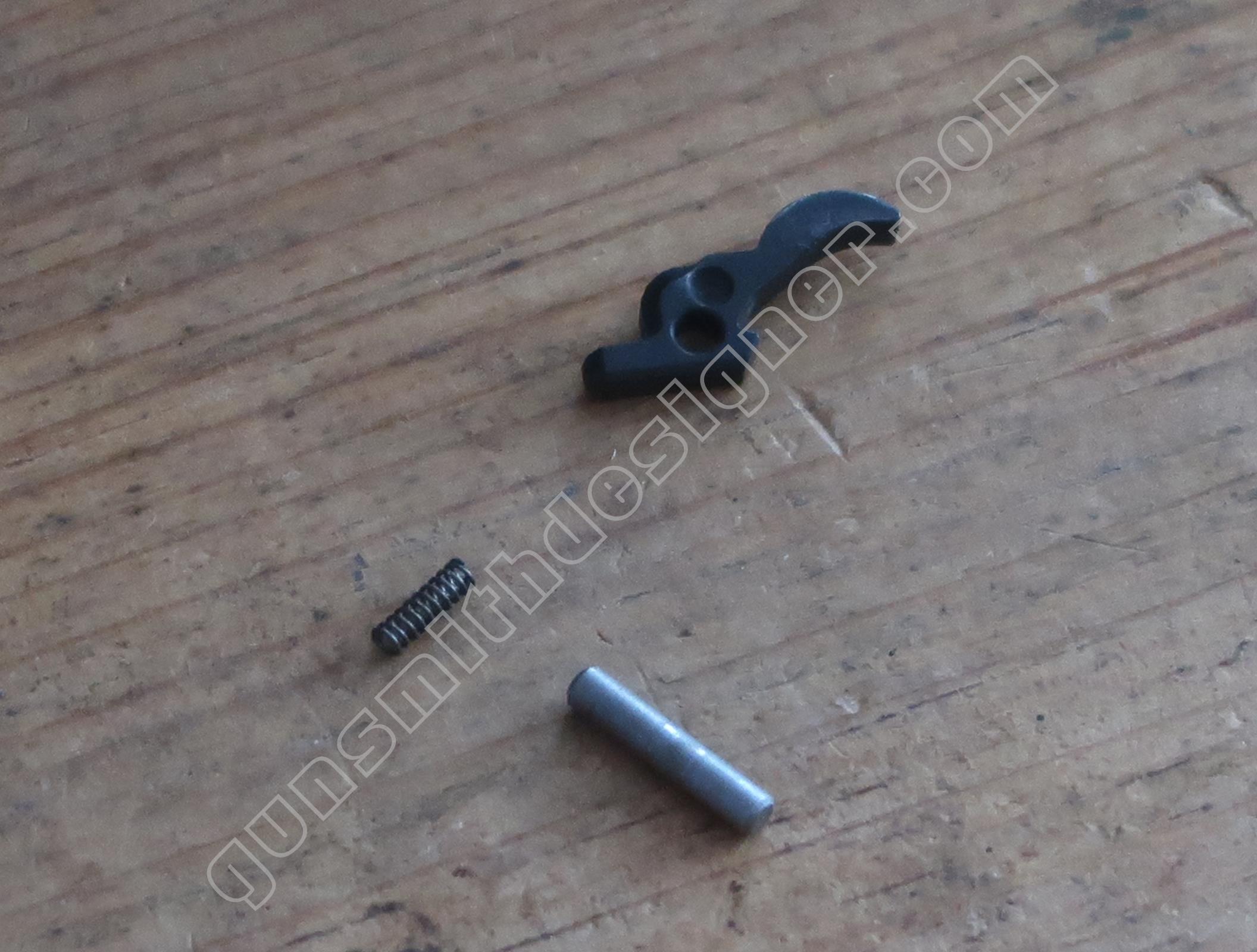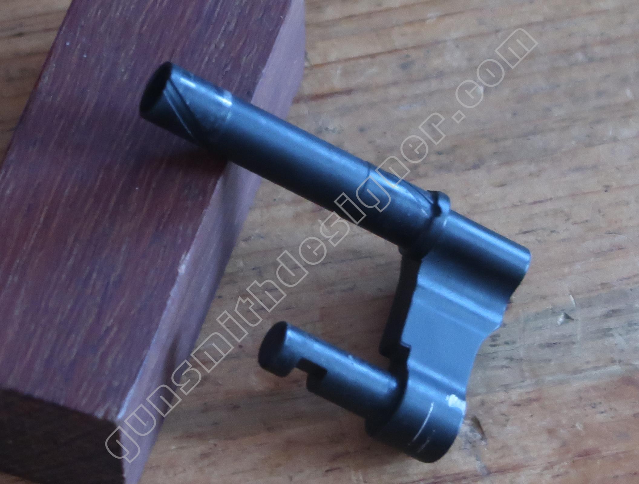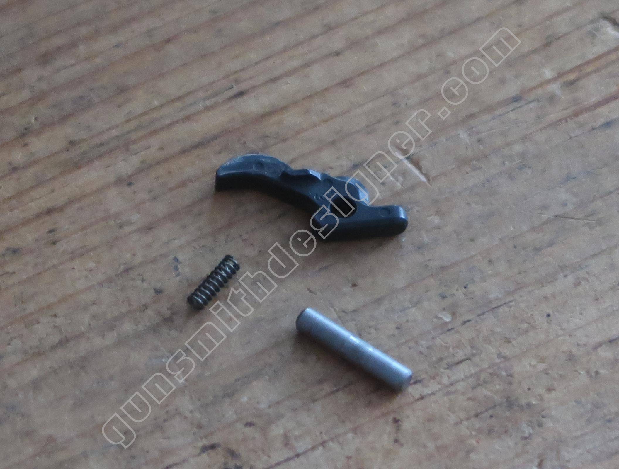 La commande du verrou de barillet est portée par la queue de détente. C’est également une pièce de micro-fusion. Elle est mue par un ressort hélicoïdale de dimensions : longueur : 9 mm, diamètre extérieur : 2,9 mm, diamètre du fil : 0,2 mm. un petit cylindre en acier le maintien sur la queue de détente.