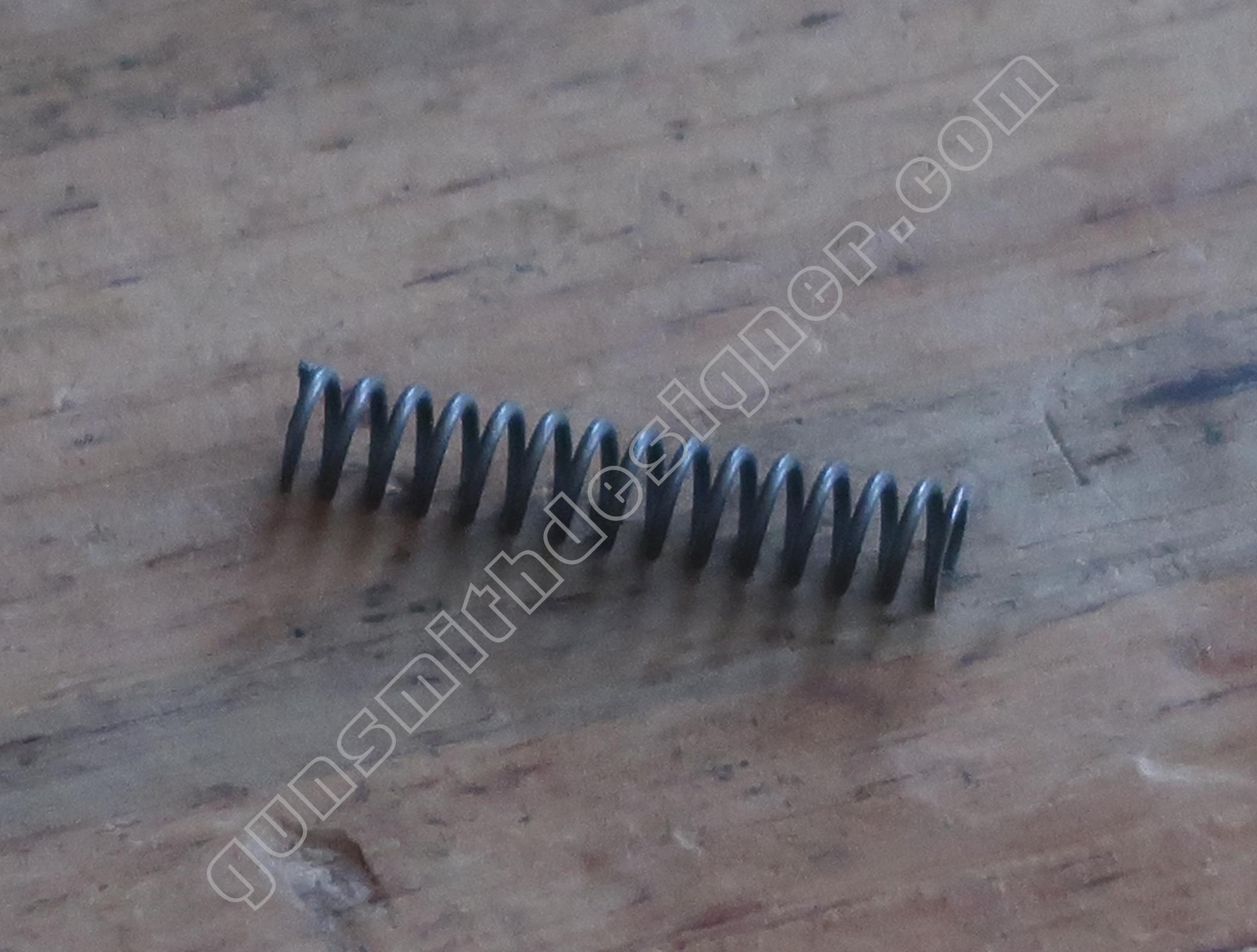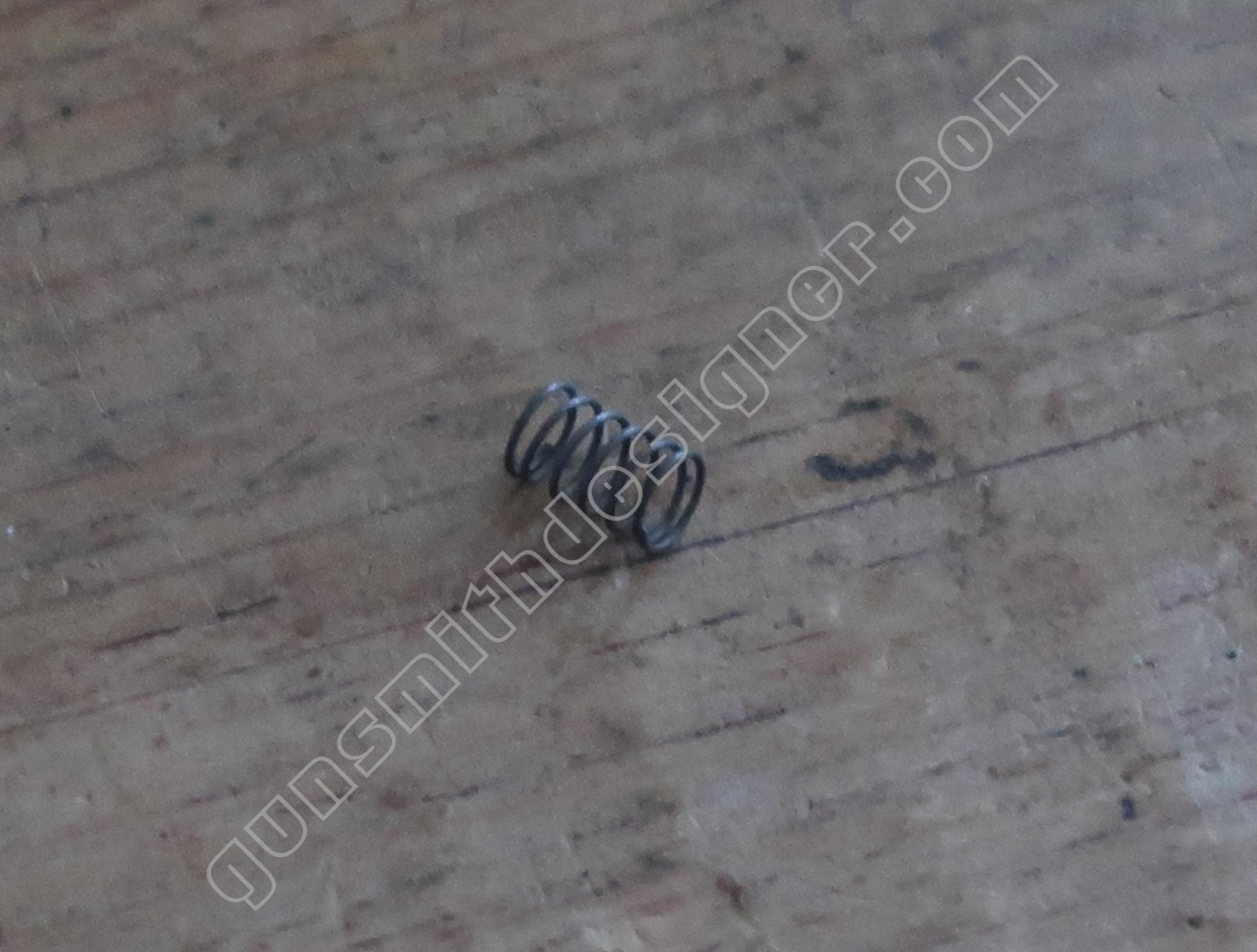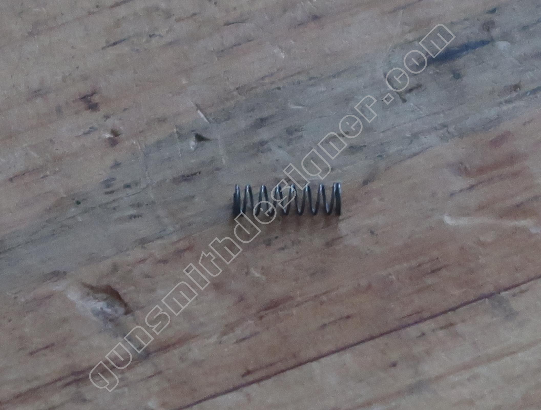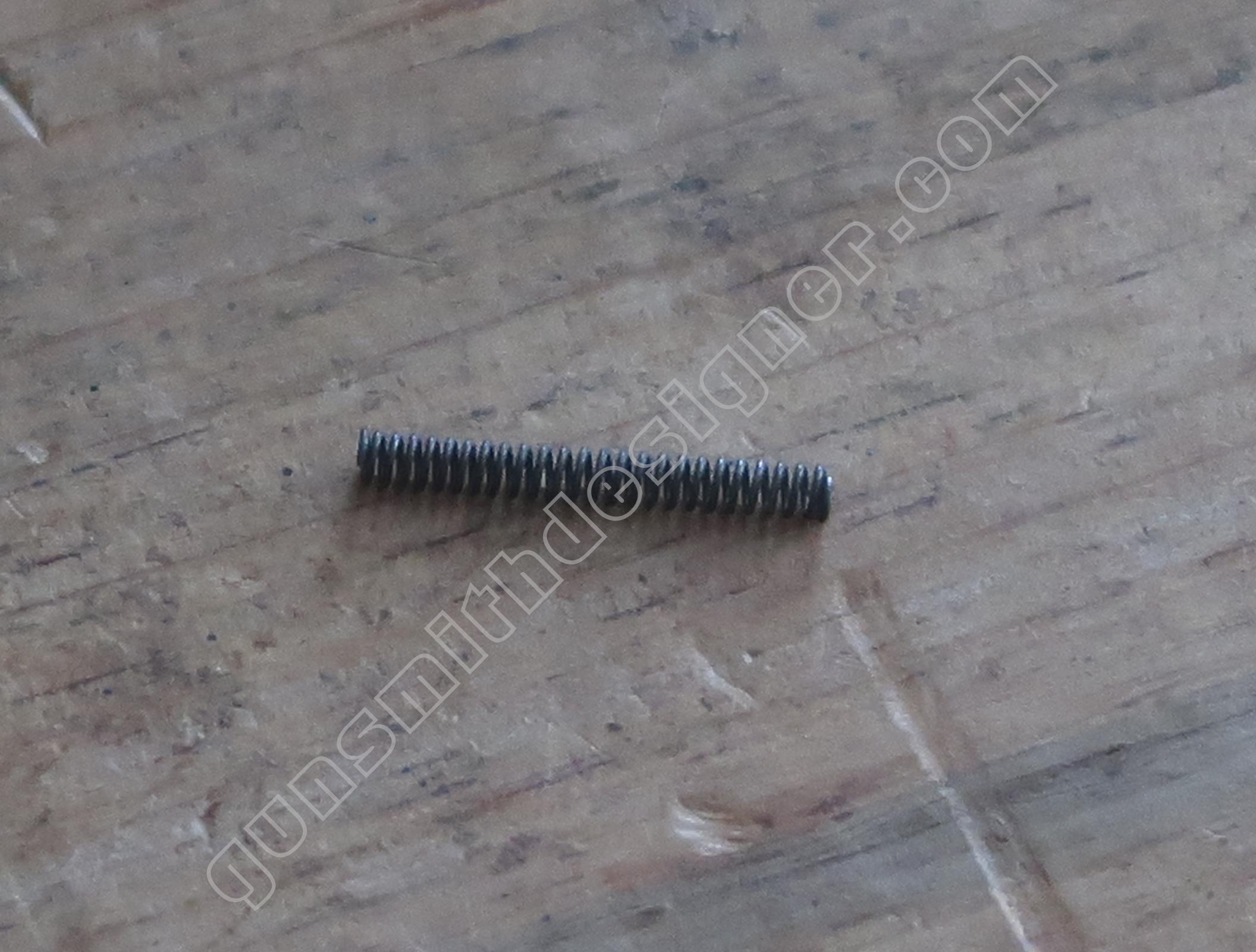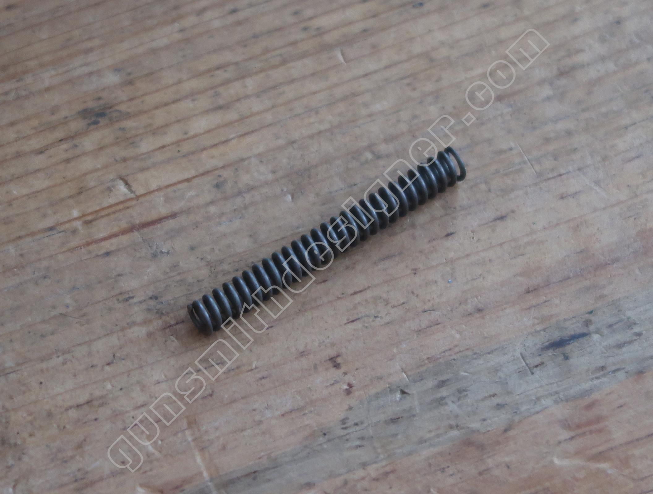 Le ressort de queue de détente est hélicoïdale, il ramène la queue de détente en avant après que le tireur ait relâché son effort. Les dimensions du ressort sont : longueur : 25,5 mm, diamètre externe : 5 mm, diamètre de fil : 0,6 mm. Le poussoir de ressort de queue de détente est un cylindre en acier. Il me semble qu’il s’agit d’acier inoxydable. La butée arrière du ressort de queue de détente est un petit cylindre.
