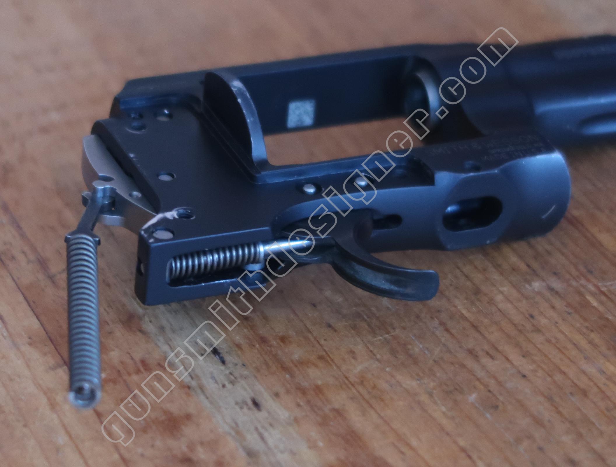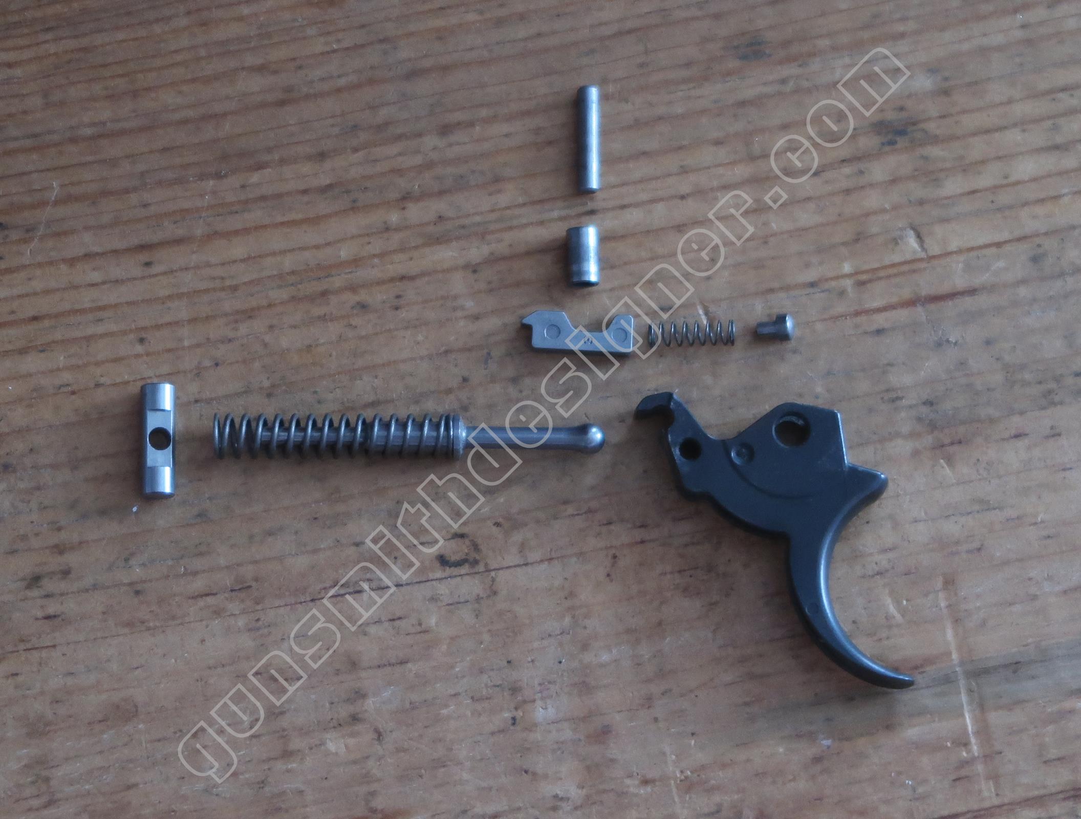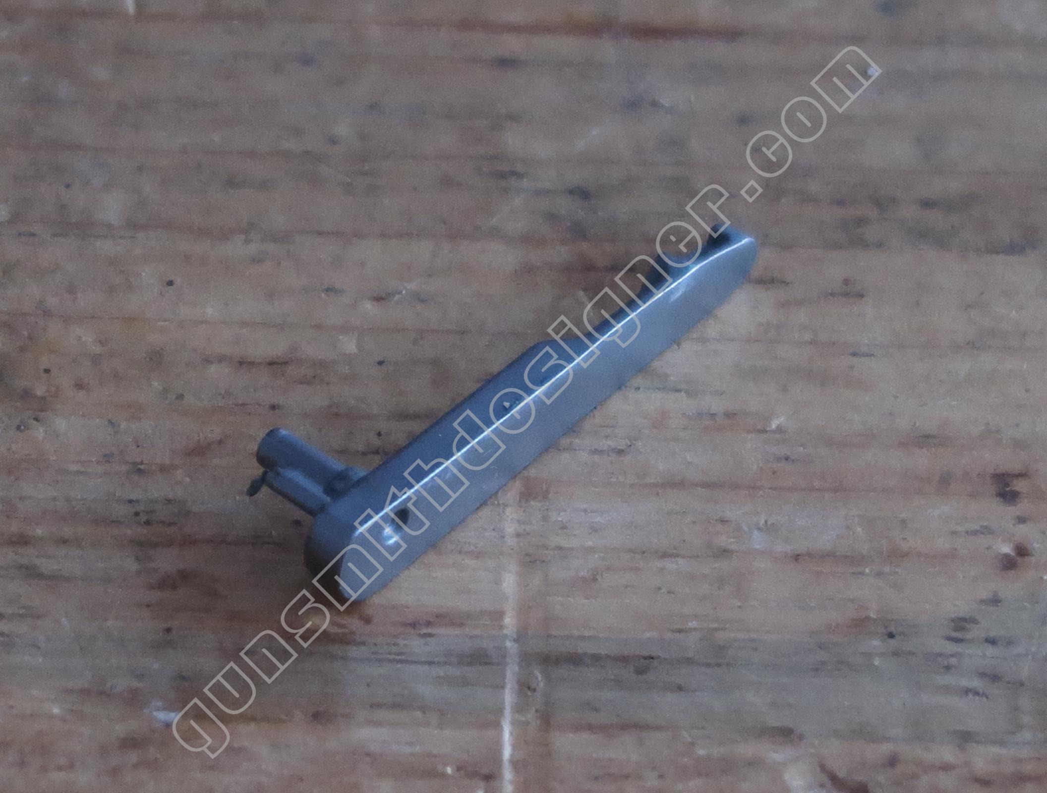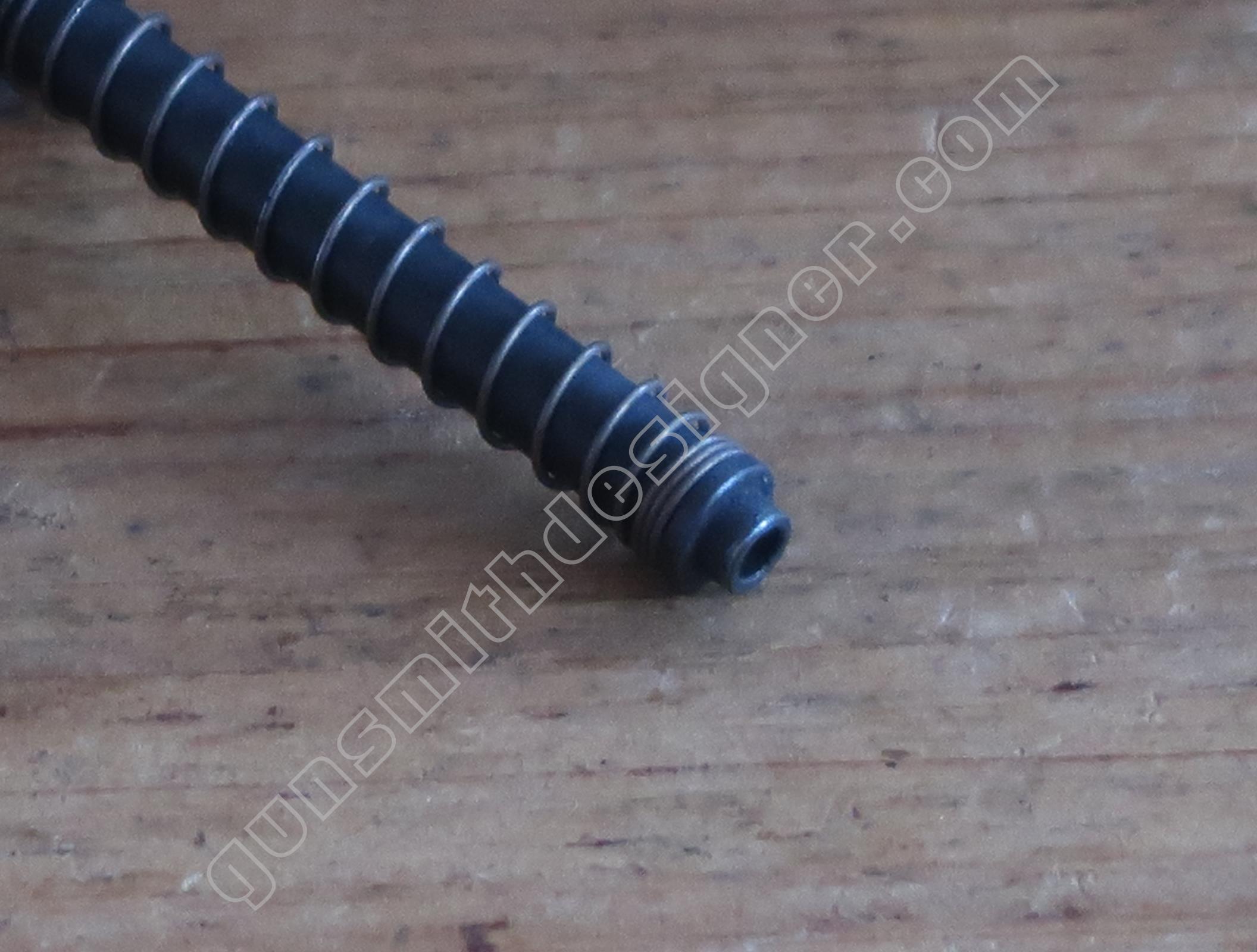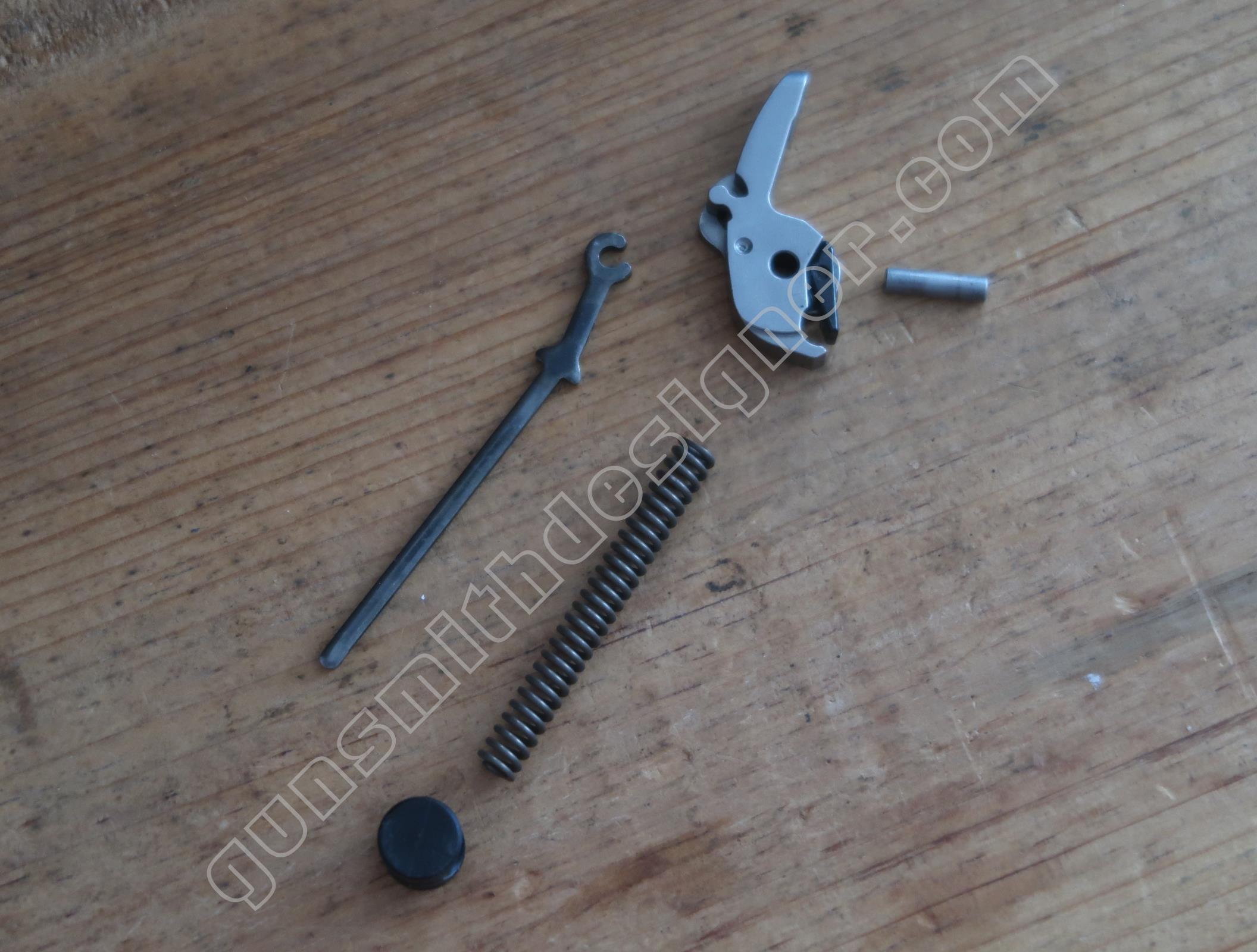 Le ressort de queue de détente est hélicoïdale, il ramène la queue de détente en avant après que le tireur ait relâché son effort. Les dimensions du ressort sont : longueur : 25,5 mm, diamètre externe : 5 mm, diamètre de fil : 0,6 mm. Le poussoir de ressort de queue de détente est un cylindre en acier. Il me semble qu’il s’agit d’acier inoxydable. La butée arrière du ressort de queue de détente est un petit cylindre.