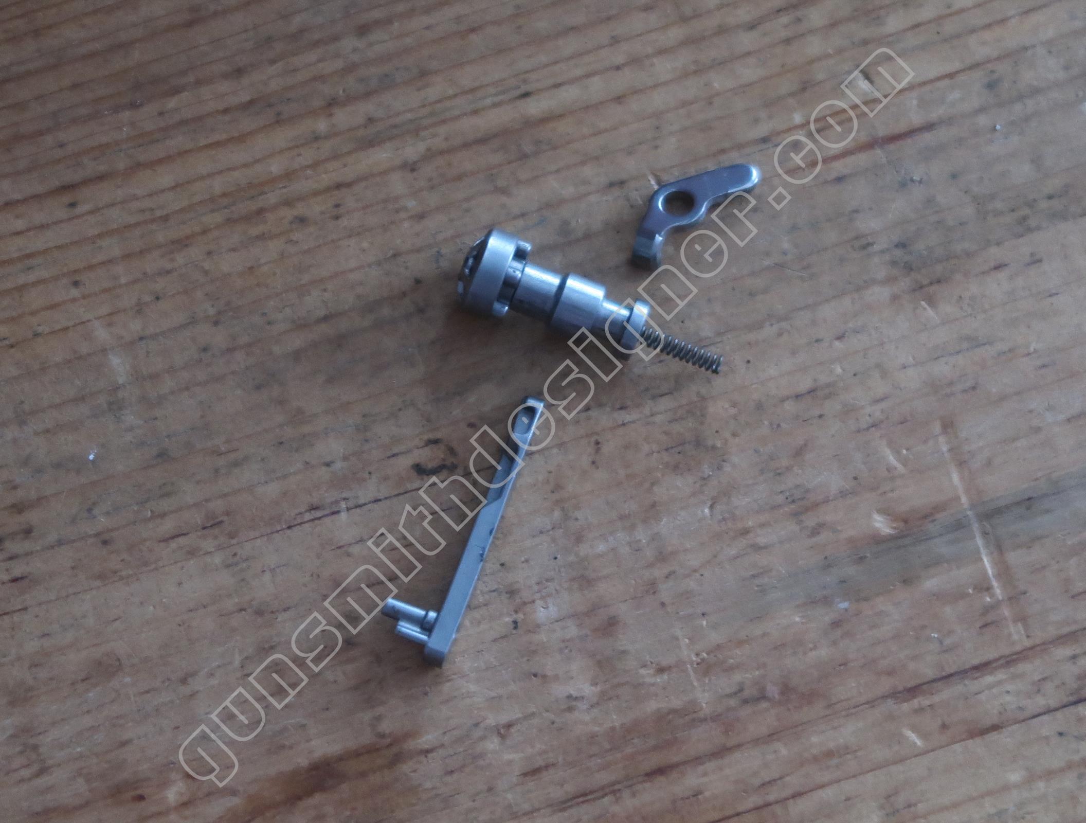 Le verrou de barillet en rotation est une pièce de micro-fusion en acier. La largeur du verrou est : 2,55 mm. Il est mu par un ressort de faible volume : longueur : 5,5 mm, diamètre externe : 1,7 mm, diamètre de fil : moins de 0,2 mm. L’axe du verrou ne peut s’extraire que du coté droit de la carcasse à l’aide d’une pince. L’axe est identique à celui de la queue de détente, ils sont interchangeables.