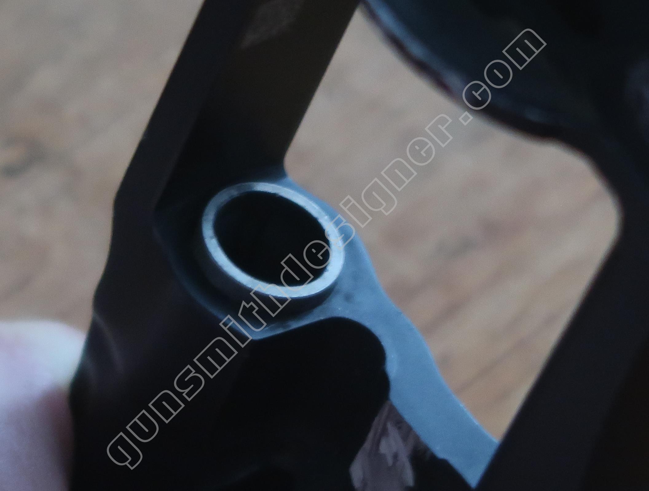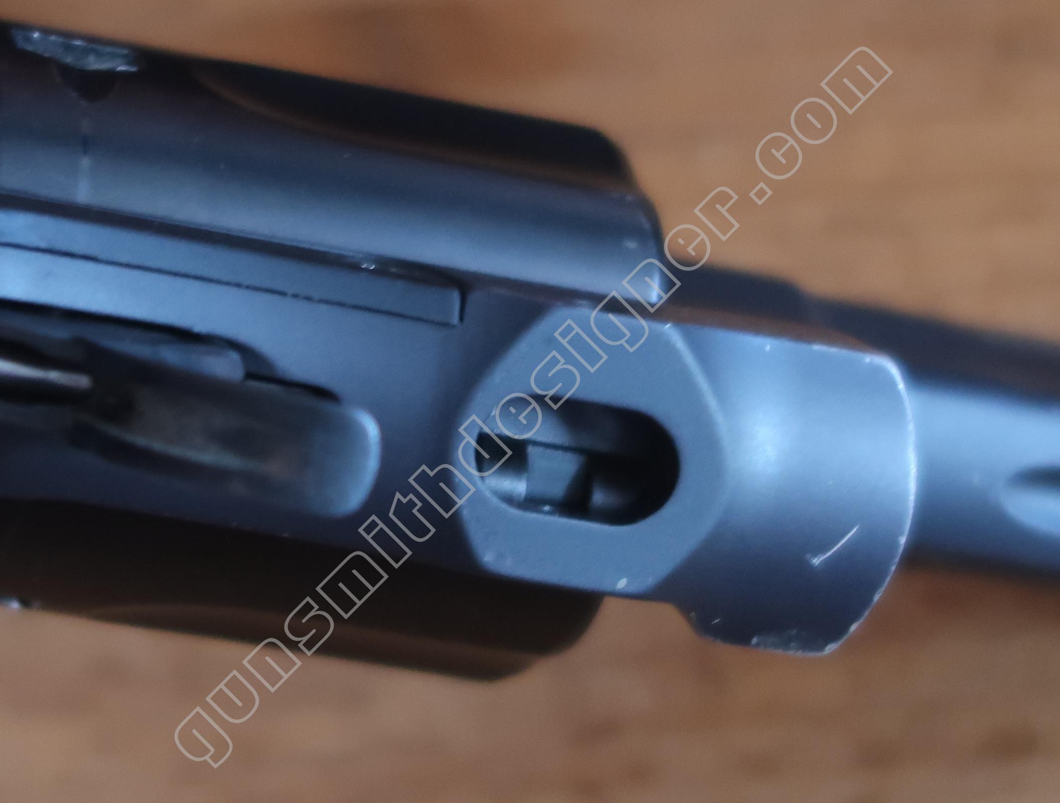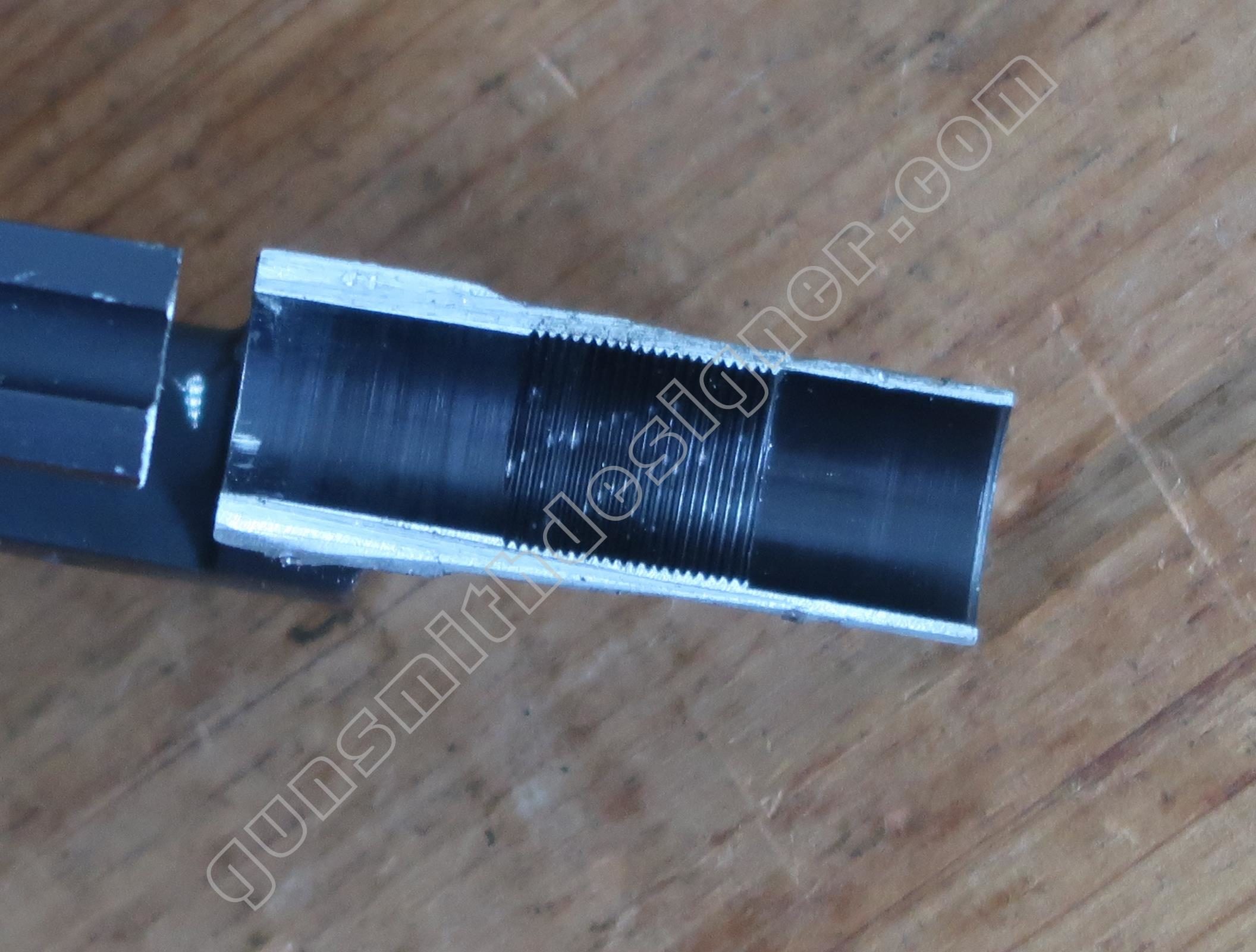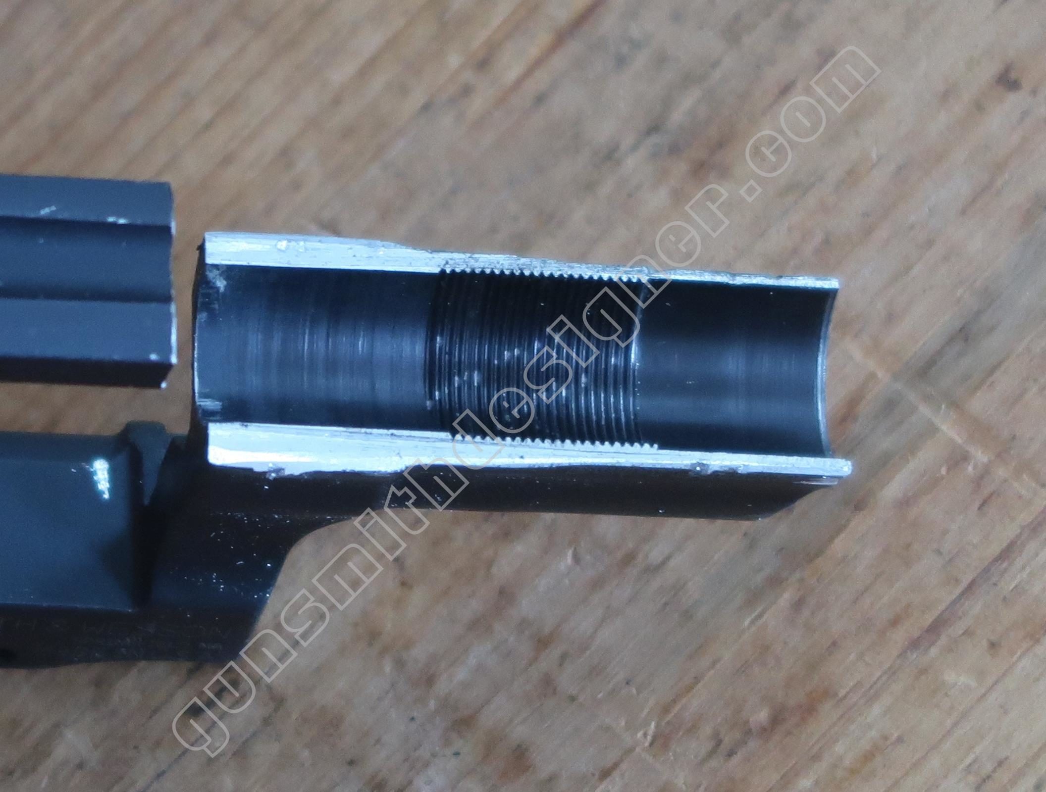 Le canon en acier est entouré par le métal de la carcasse soit de l’aluminium. Ce montage est inhabituel. La question que devrait se poser automatiquement le lecteur est : comment est monté le canon dans son logement ? Est il vissé ? Si c’est le cas, comment est ce possible puisqu’il n’y a pas de carré d’entrainement ? Est il monté à la presse ? Est il collé dans son logement ? Est il goupillé ? Autre moyen pas classique ? Passer la carcasse aux rayons X permettrait d’obtenir des informations sur la question sans employer de moyens destructifs…mais je n’ai pas accès à ce genre d’outil.