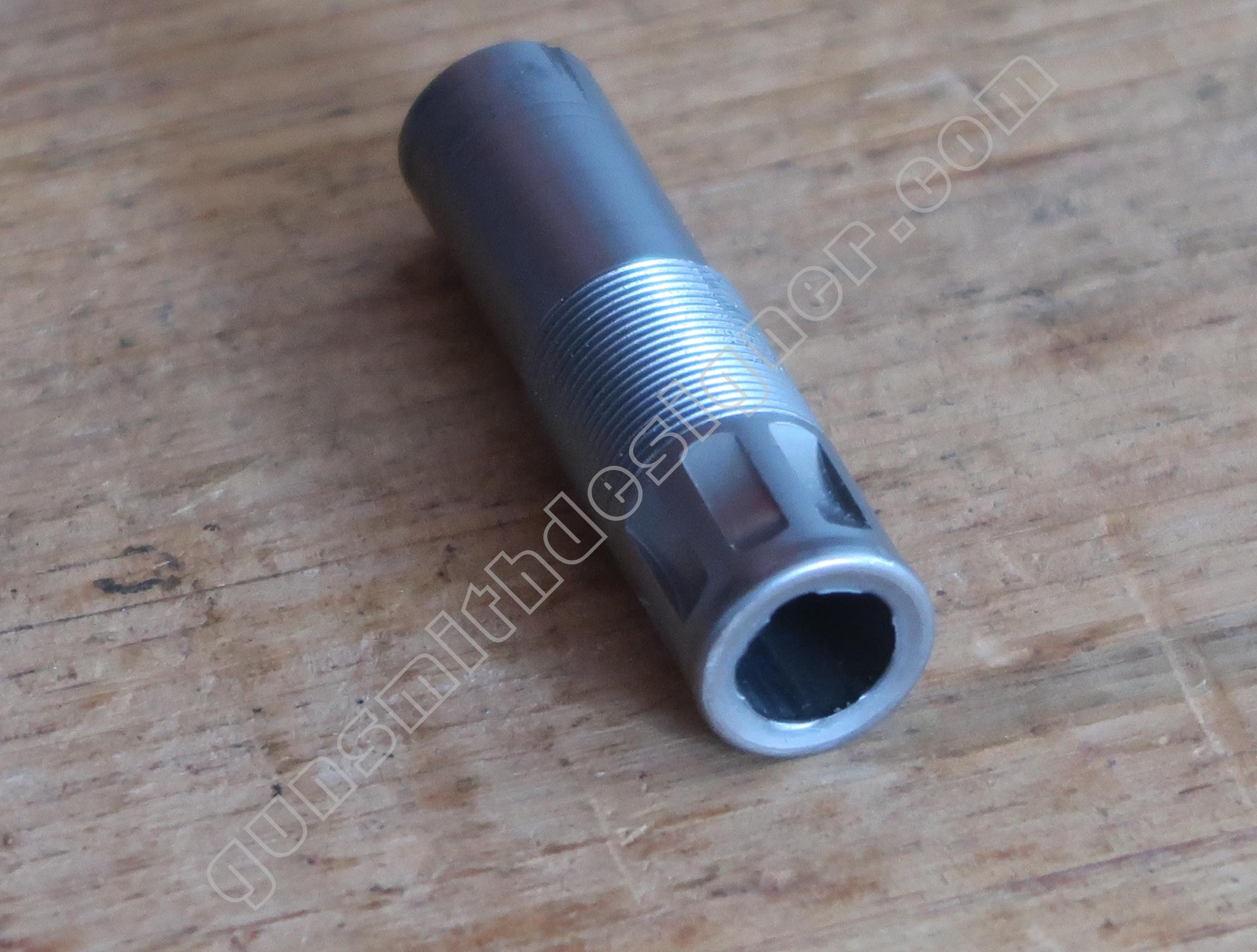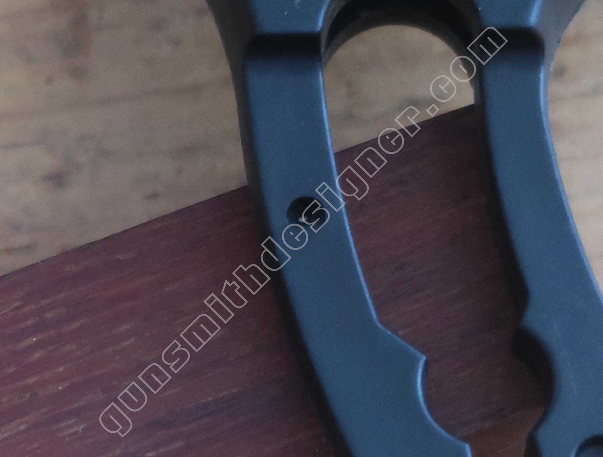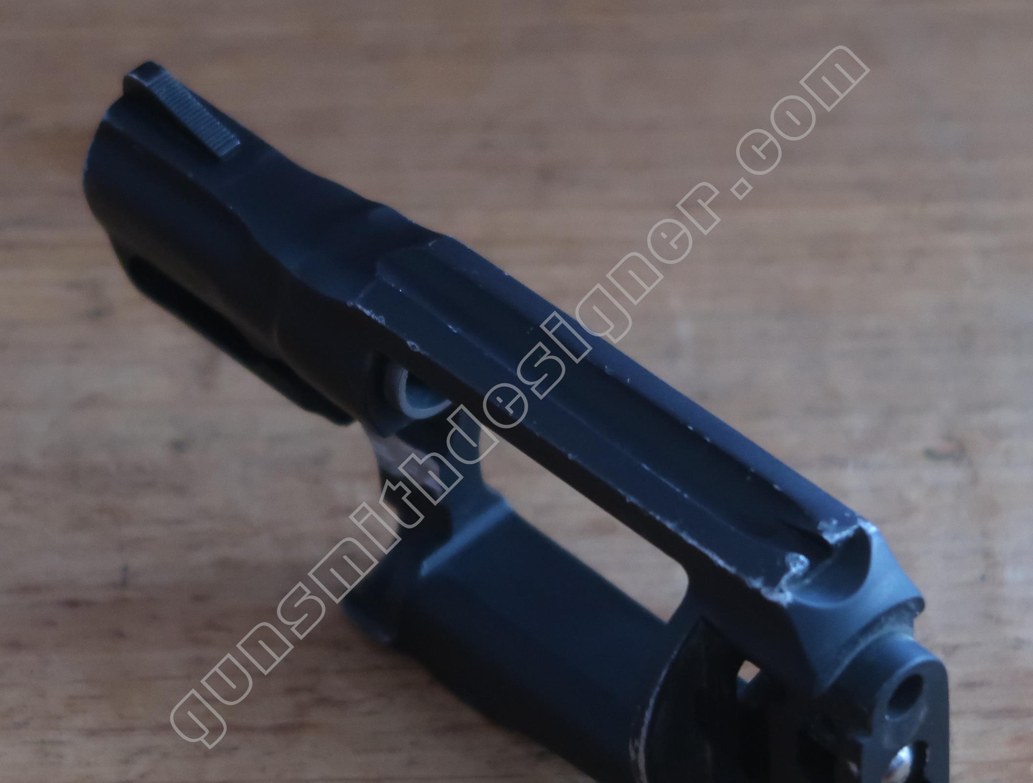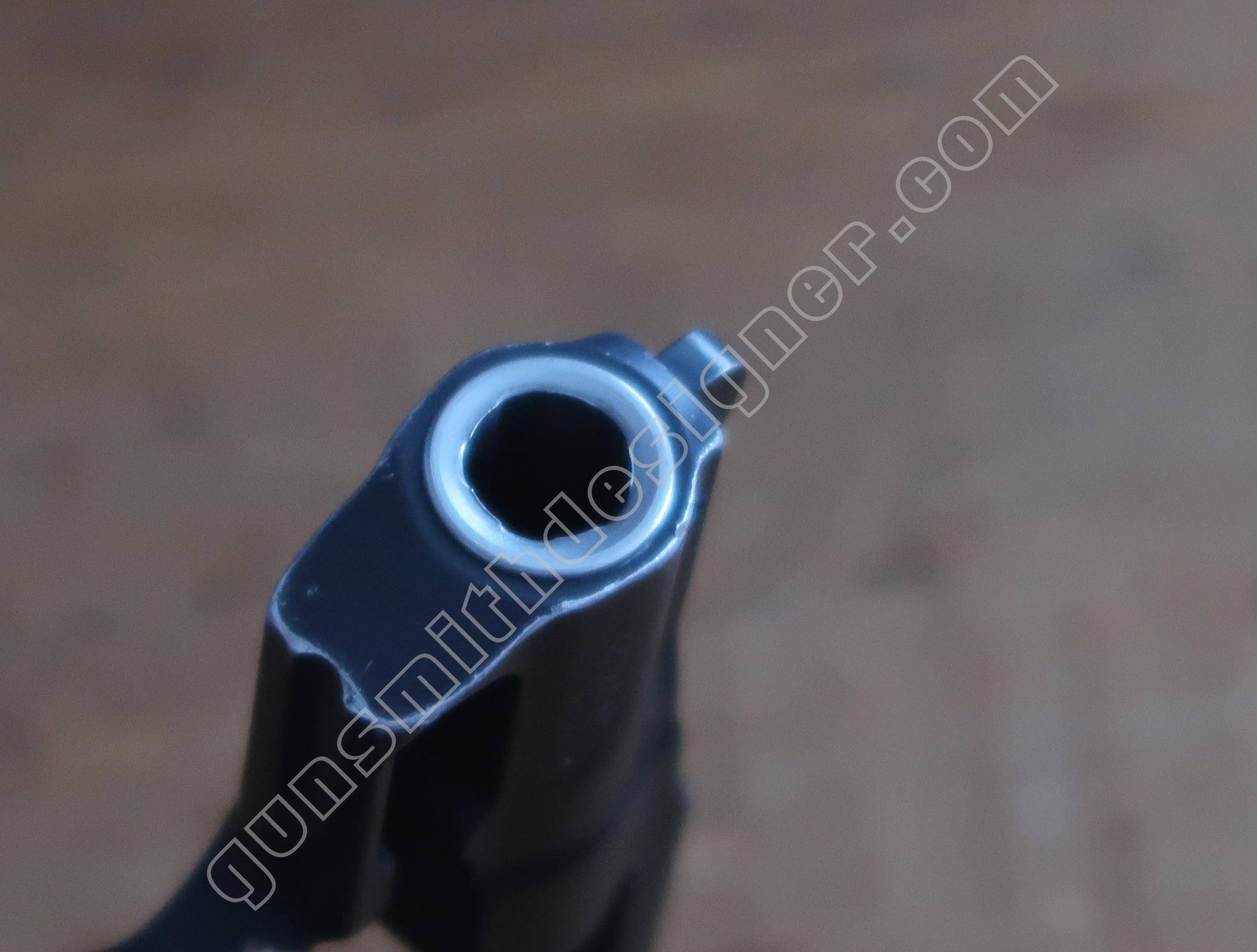 Le canon en acier est entouré par le métal de la carcasse soit de l’aluminium. Ce montage est inhabituel. La question que devrait se poser automatiquement le lecteur est : comment est monté le canon dans son logement ? Est il vissé ? Si c’est le cas, comment est ce possible puisqu’il n’y a pas de carré d’entrainement ? Est il monté à la presse ? Est il collé dans son logement ? Est il goupillé ? Autre moyen pas classique ? Passer la carcasse aux rayons X permettrait d’obtenir des informations sur la question sans employer de moyens destructifs…mais je n’ai pas accès à ce genre d’outil.