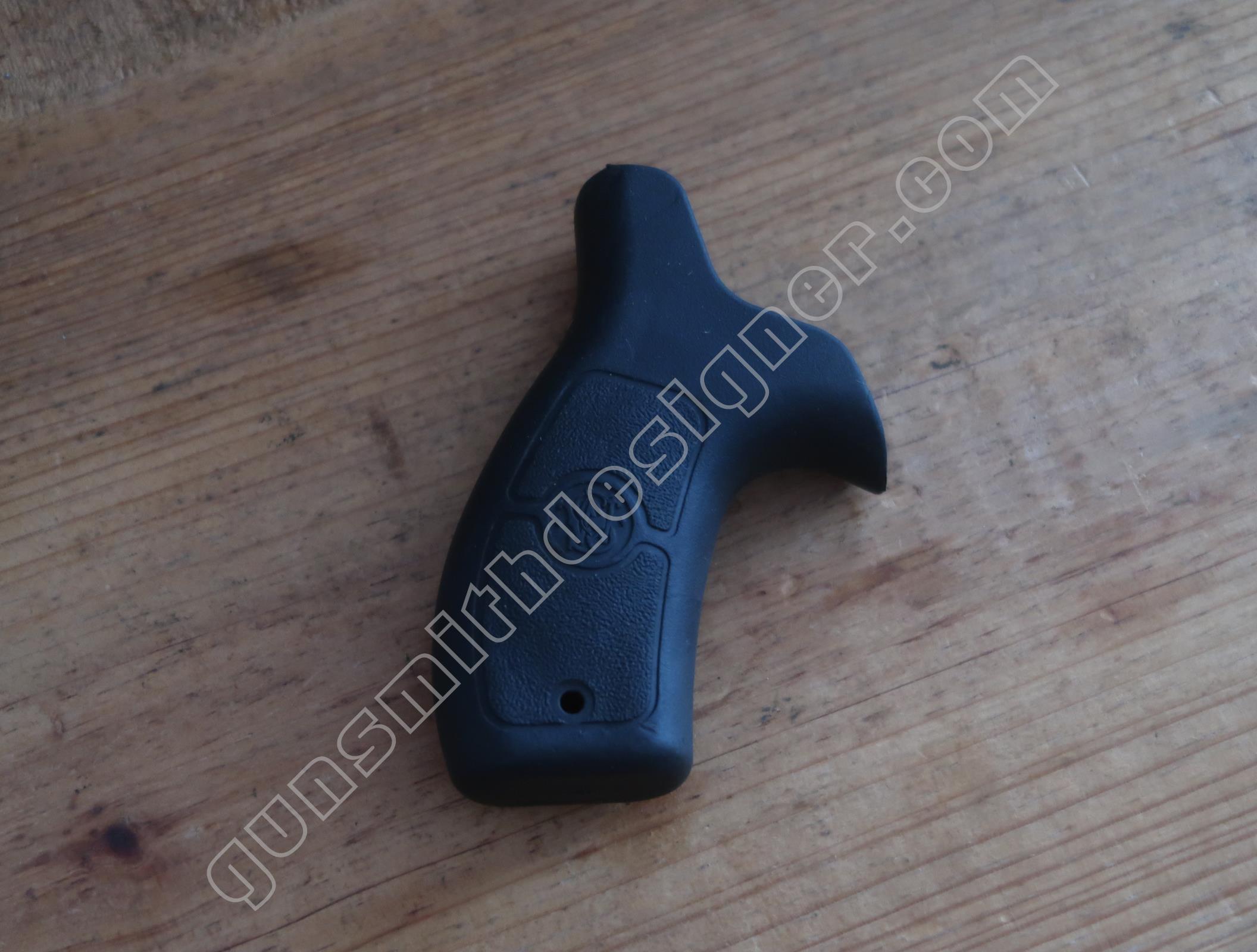 Une poignée caoutchouc enlace l’ossature de la poignée pistolet. Elle tient par une goupille mécanindus. La poignée n’amène pas de commentaire particulier si ce n’est qu’elle tombe bien dans la main et que le caoutchouc assure un bon maintien, une bonne adhérence.