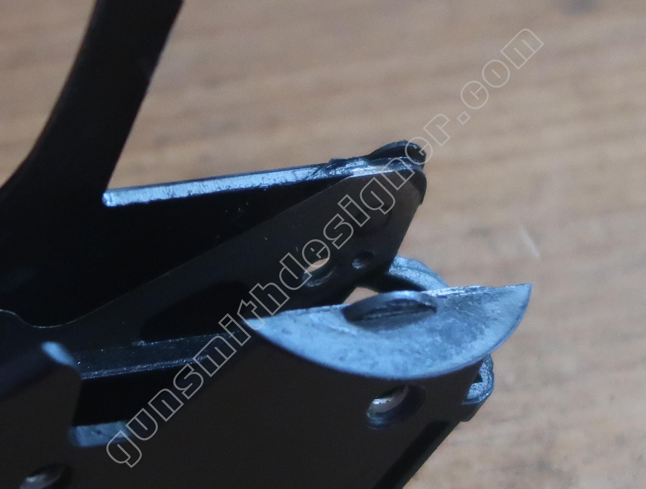 La double action est assurée par une petite pièce montée sur le chien (pièce de couleur noire sur les photos). Bien que cette arme additionne plusieurs avancées techniques, la double action, elle, n’a pas été révolutionnée, elle est proche d’un modèle ancien, peut être n’y a t’il plus d’évolution à faire.