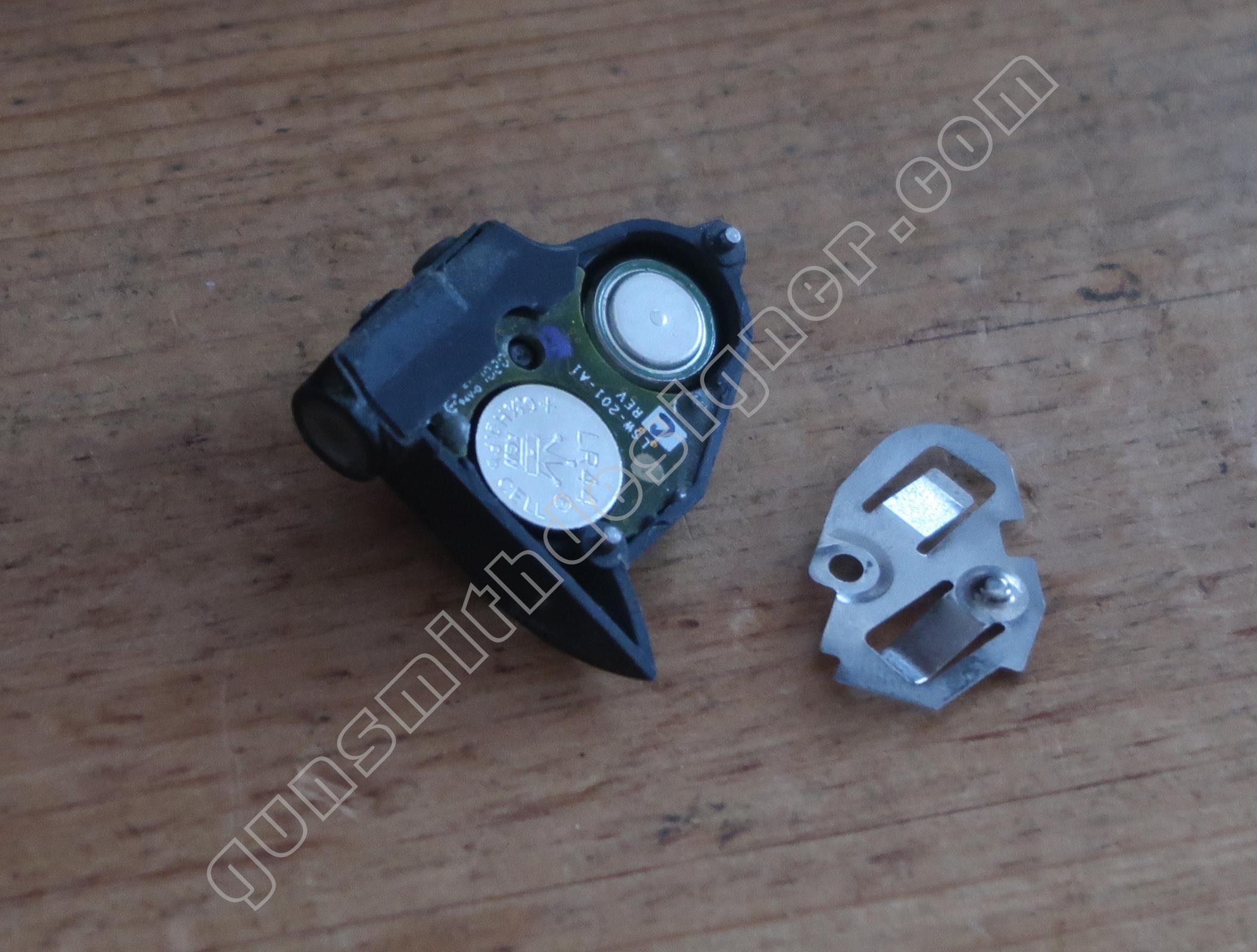 L’arme est fournie d’origine avec un laser. Il est monté sur le coté droit de la carcasse. Il est maintenu en place par une vis. C’est elle qu’il faut déserrer pour accéder aux deux piles qui alimentent l’appareil.
