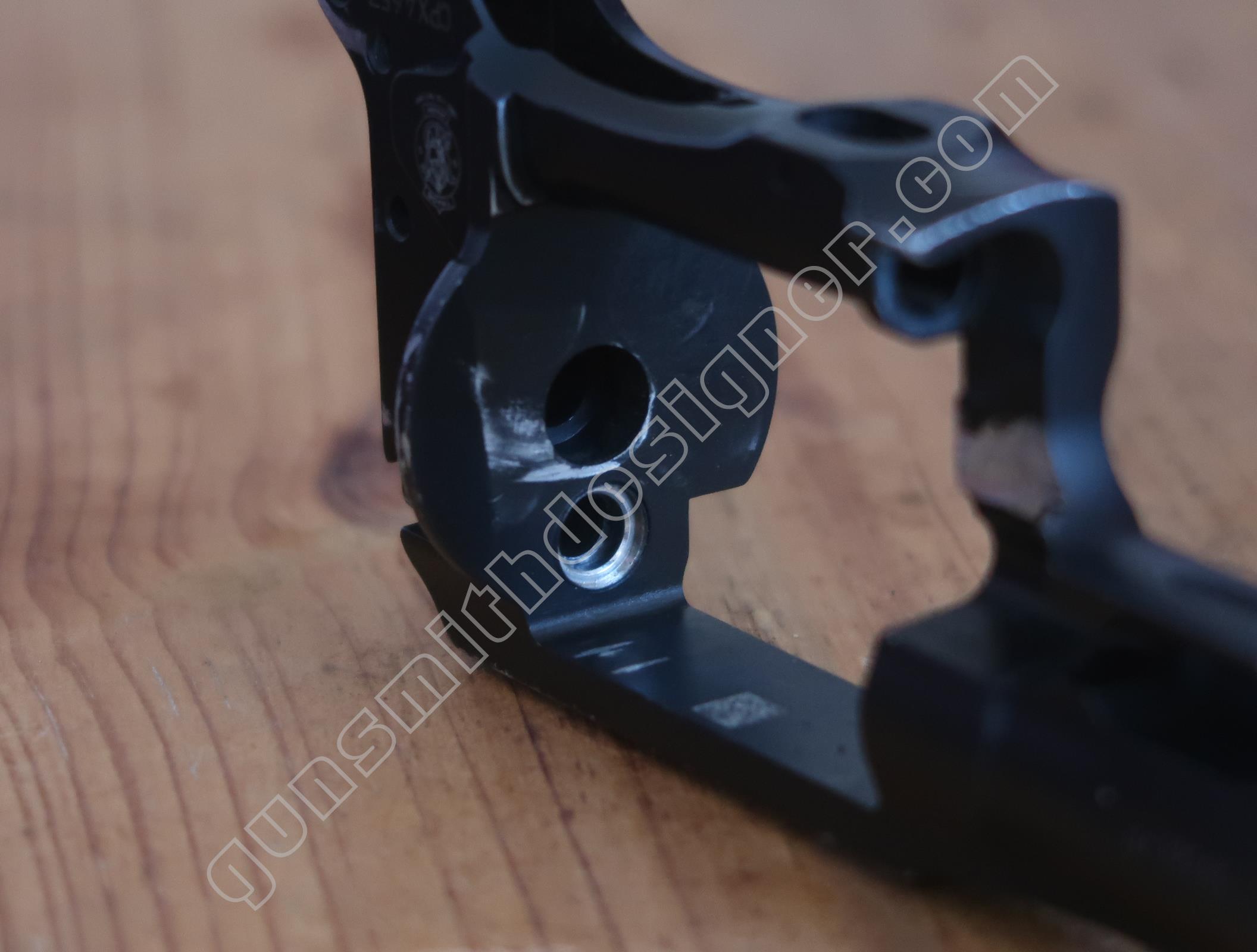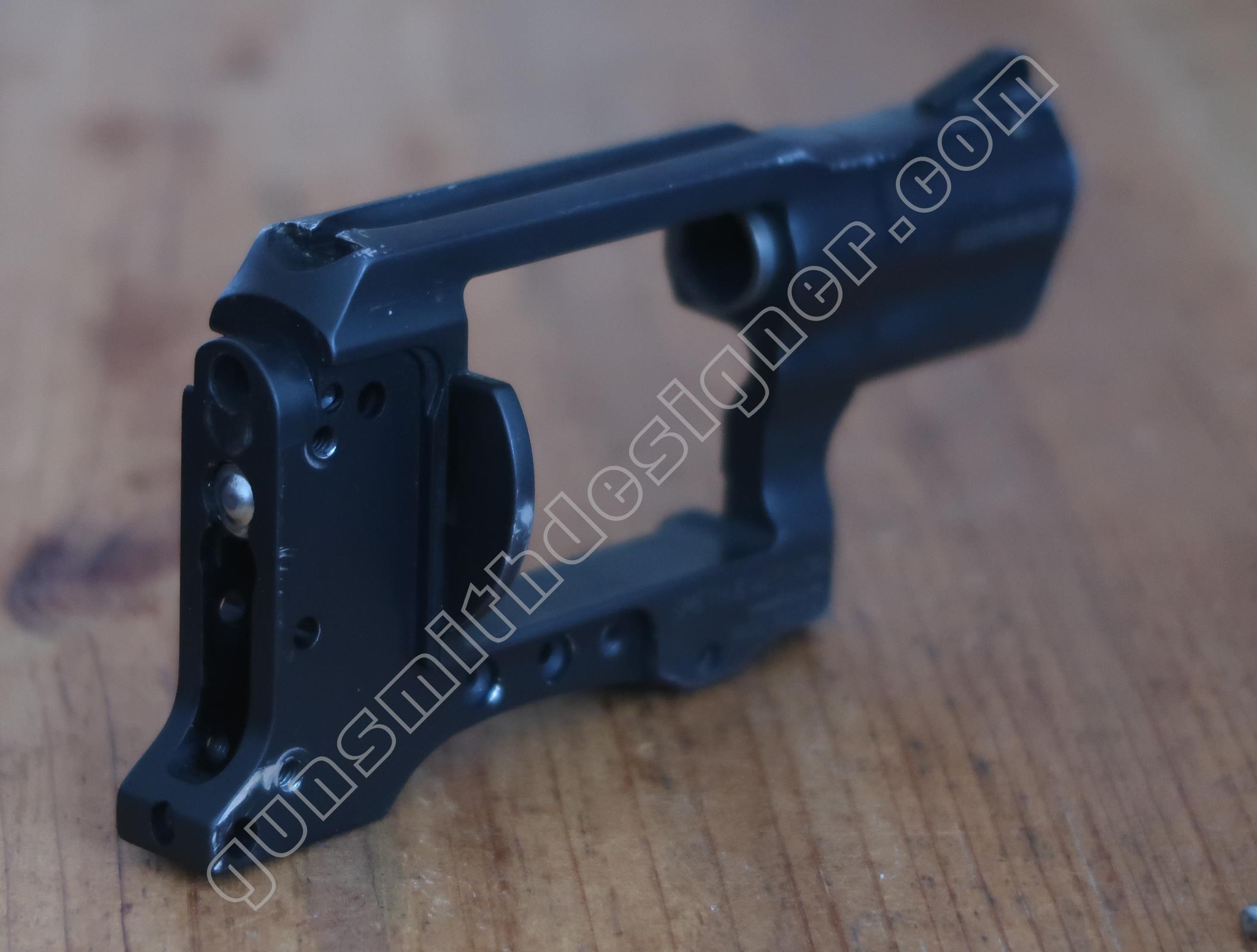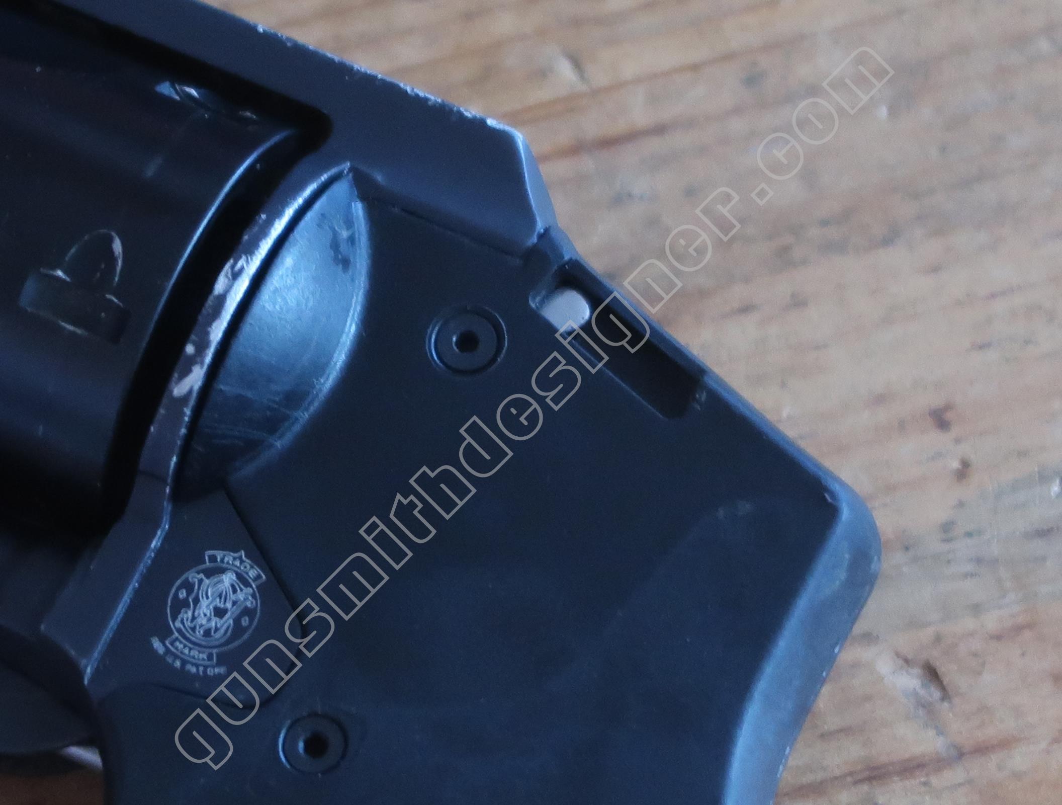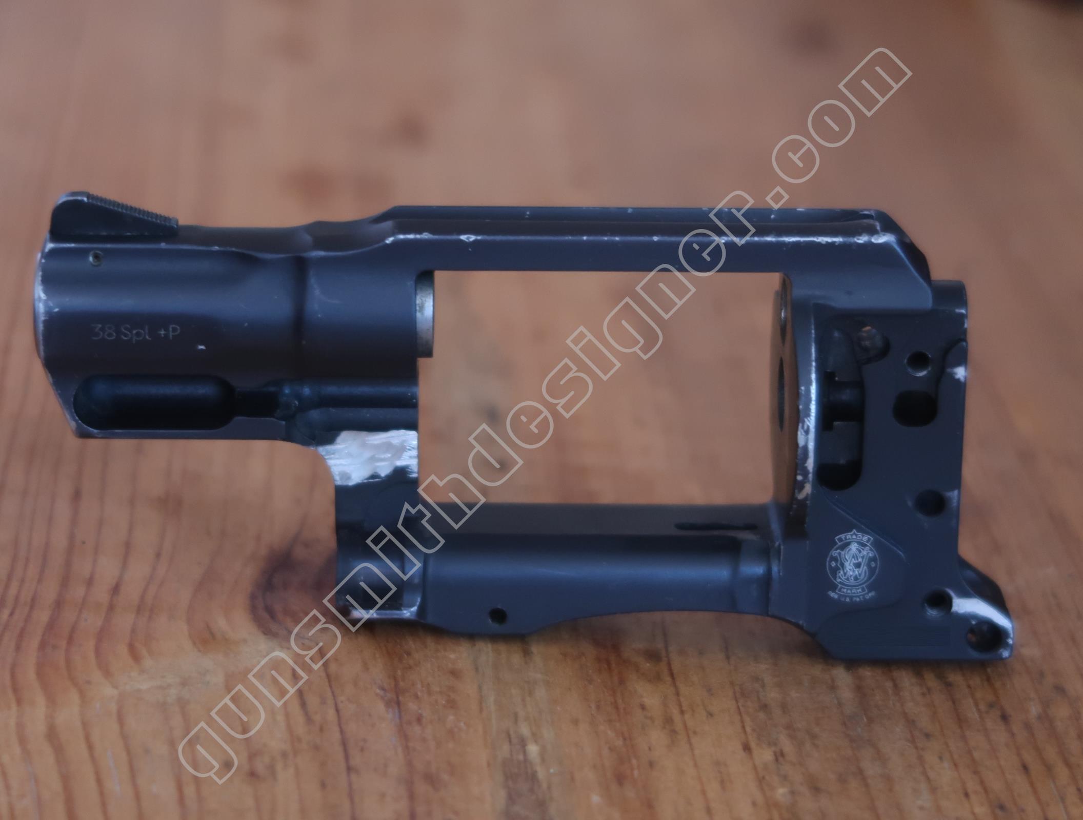 Comme on peut le voir, la carcasse de cette arme ne reprend pas les formes “habituelles” des revolvers Smith et Wesson. La carcasse a bénéficié de ce que je nomme une simplification par la division. C’est à dire qu’une seule pièce cède la place à plusieurs éléments qui une fois combinés forment une carcasse.