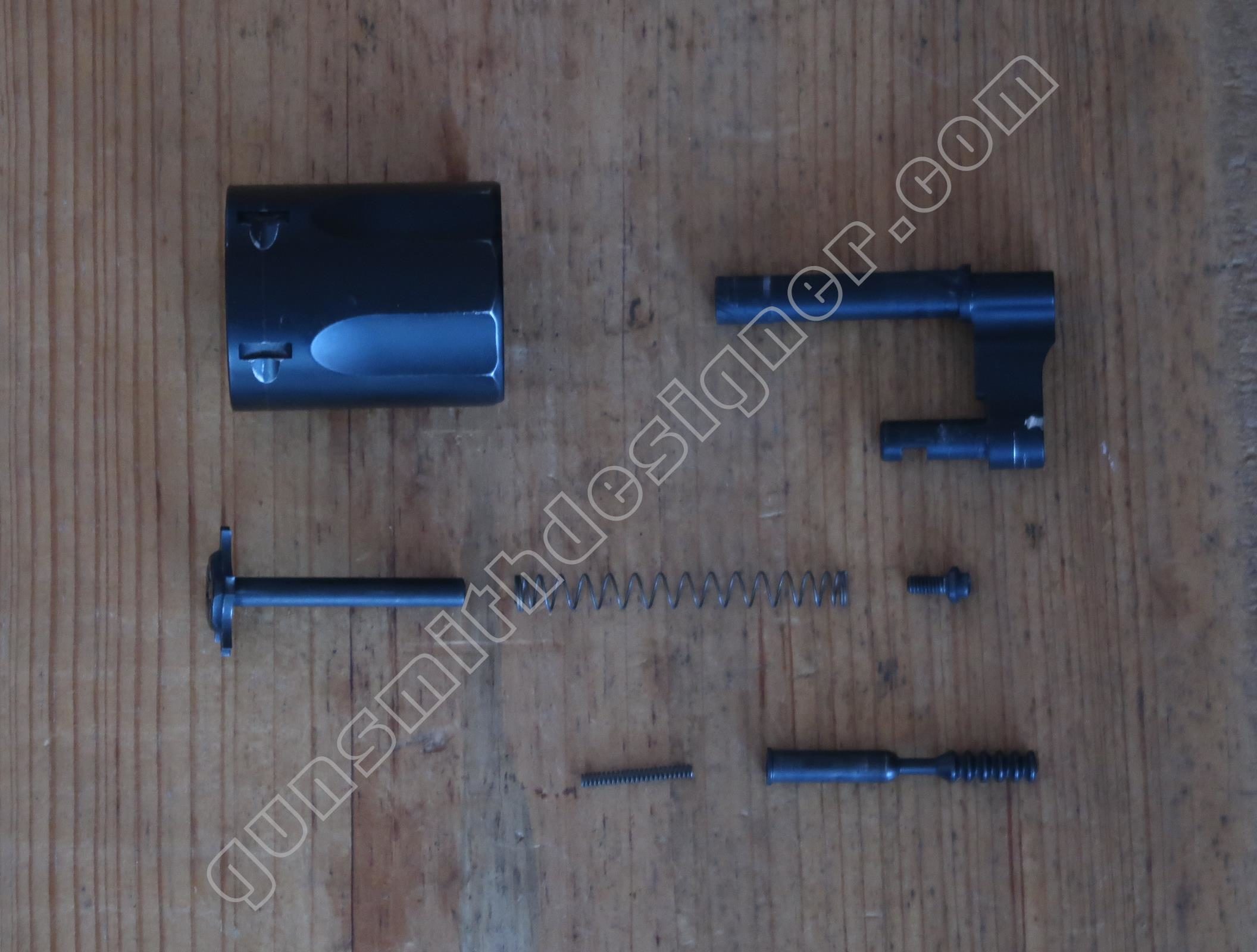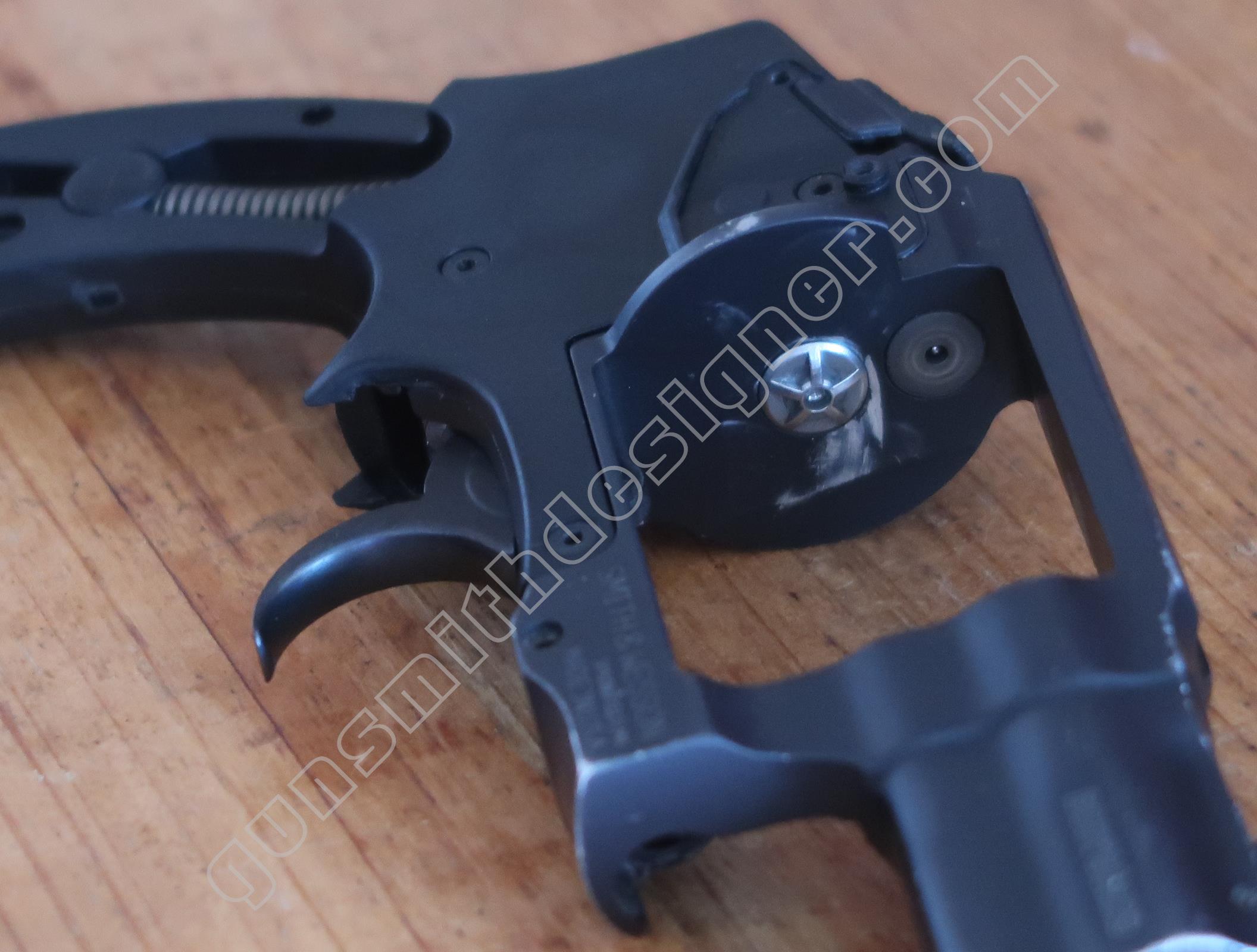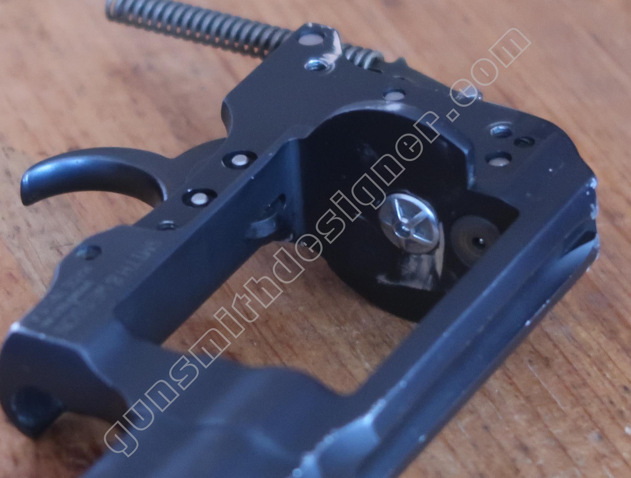 La sécurité de percuteur et son ressort ne sont pas communs non plus. Cette pièce se loge dans la carcasse, il immobilise le percuteur en entrant dans l’encoche de ce dernier. C’est l’élévateur de barillet/la came de rotation du barillet qui, en arrivant à sa position haute, efface la sécurité de percuteur. Il faut pour cela que le tireur appuie sur la queue de détente.