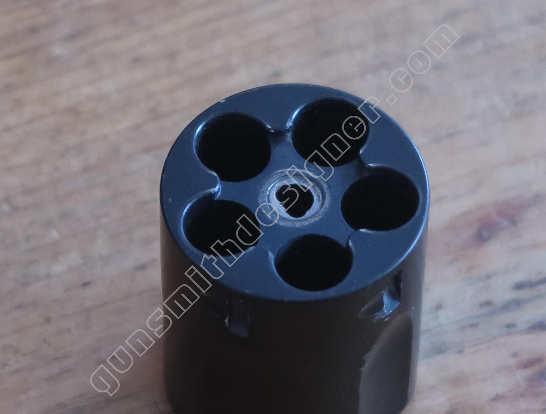 Le pivot de barrillet est en aluminium. Comme toujours sur un revolver cette pièce est complexe. L’axe de rotation du barillet est un tube de diamètre : 7,5 mm. L’axe de pivot sur la carcasse a un diamètre de 6,2 mm.