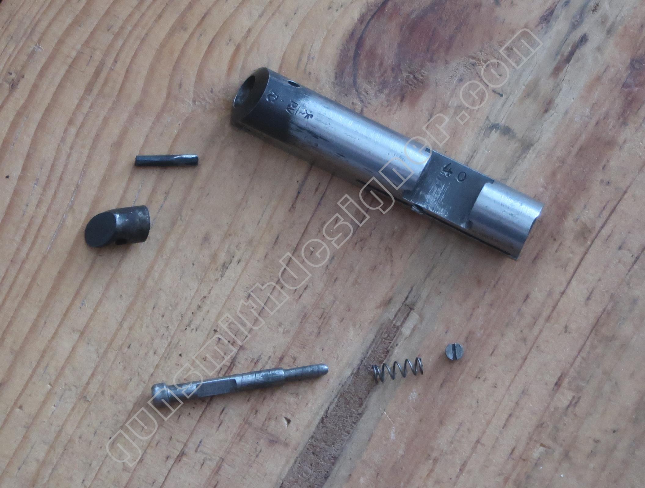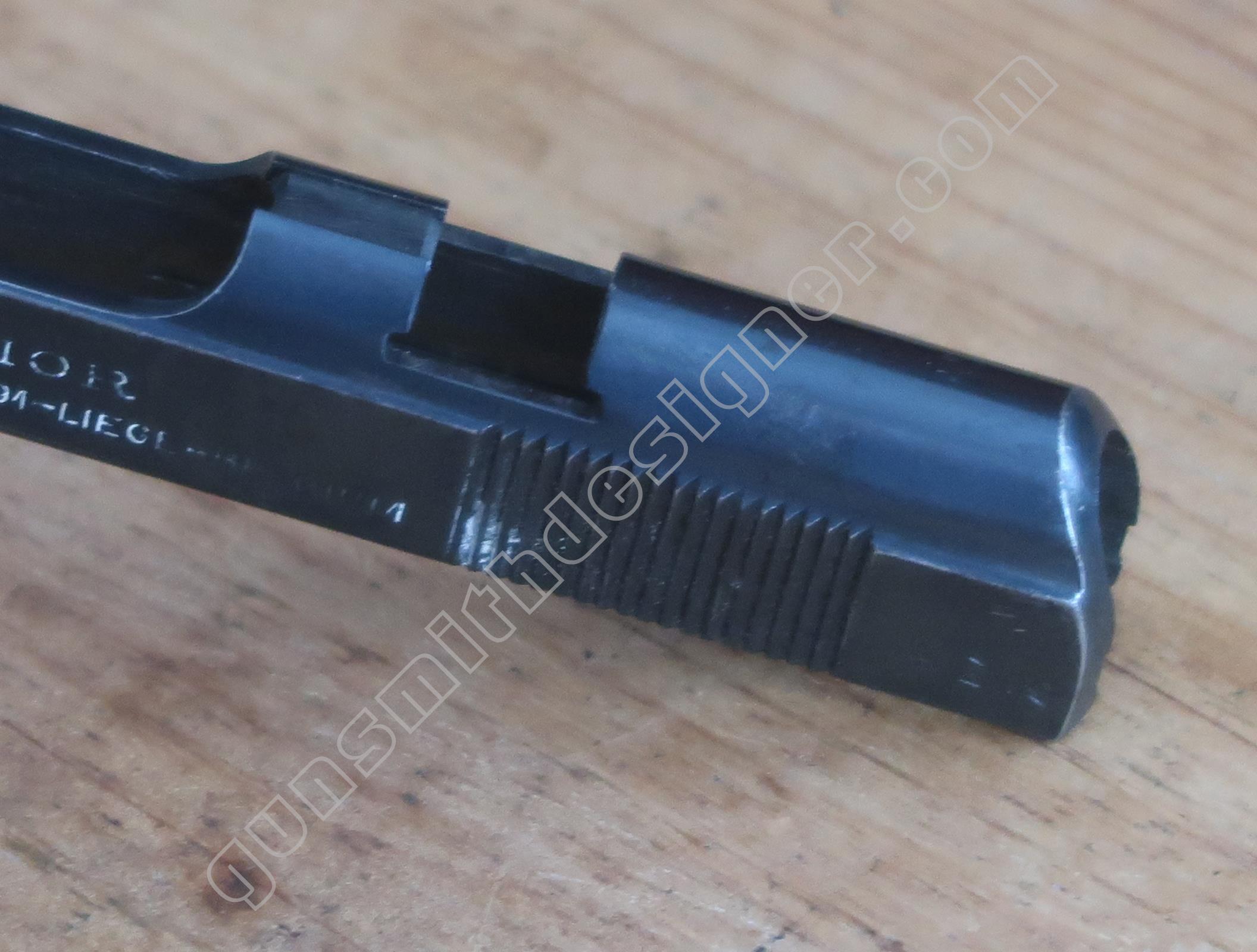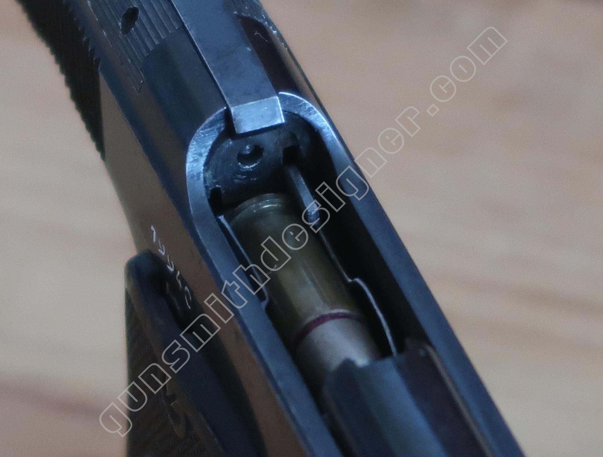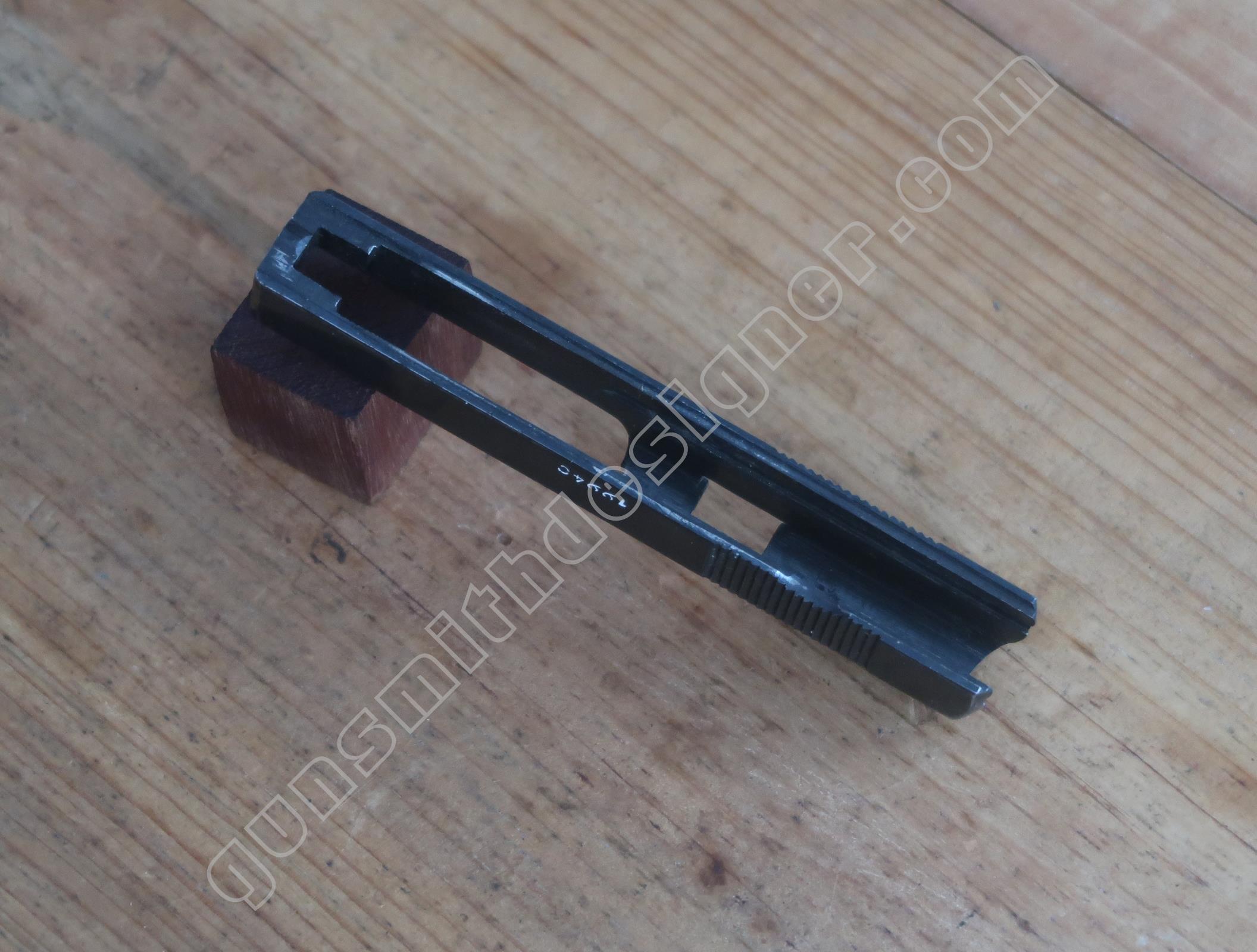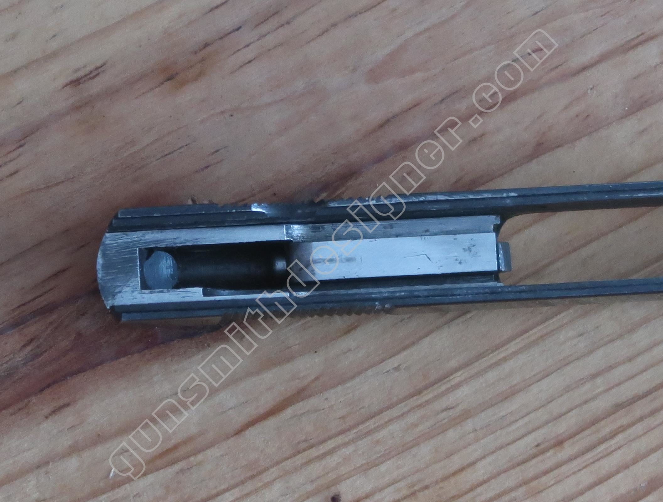 En démontant ce pistolet, je n’ai pas trouvé d’extracteur. Je pense qu’il devait y en avoir un car une encoche semble destinée à cet effet. Cette dernière correspond à une autre encoche à l’entrée de chambre. Peut être a t’il été perdu lors d’un précédent démontage. La largeur du logement d’extracteur (si toutefois il y en a un) : 1,65 mm.