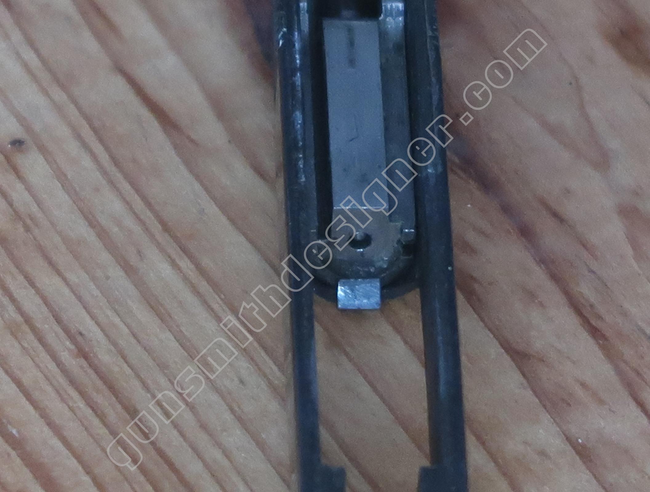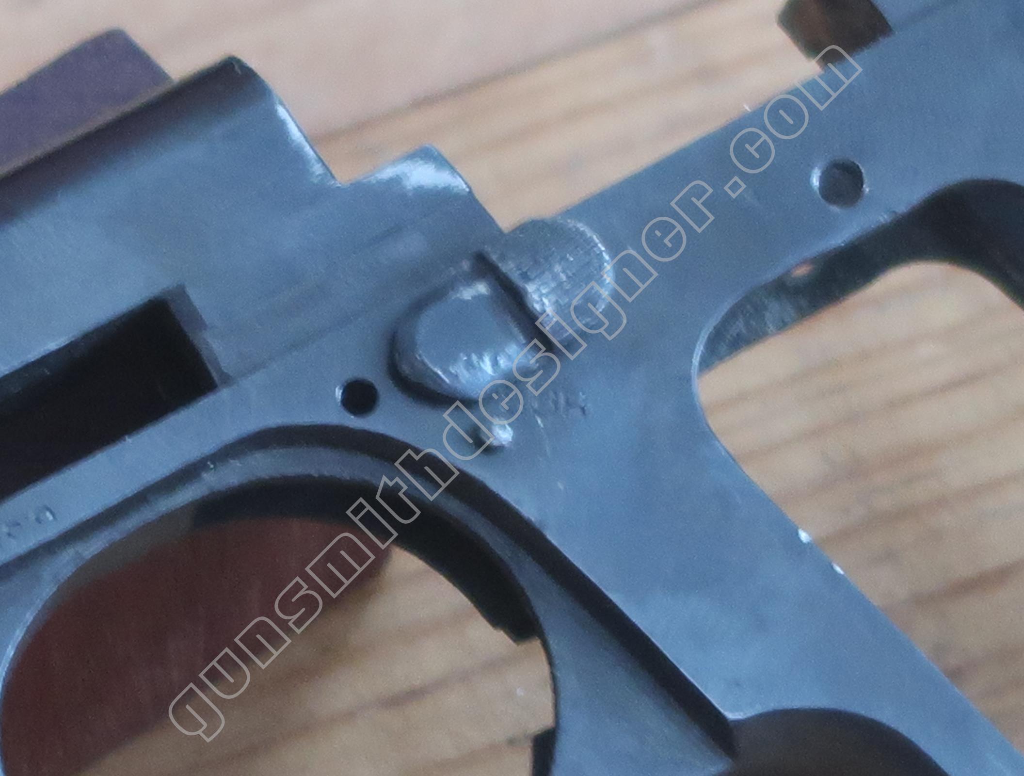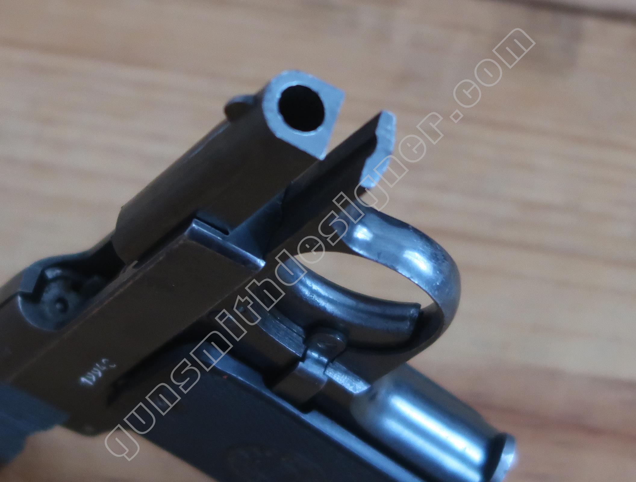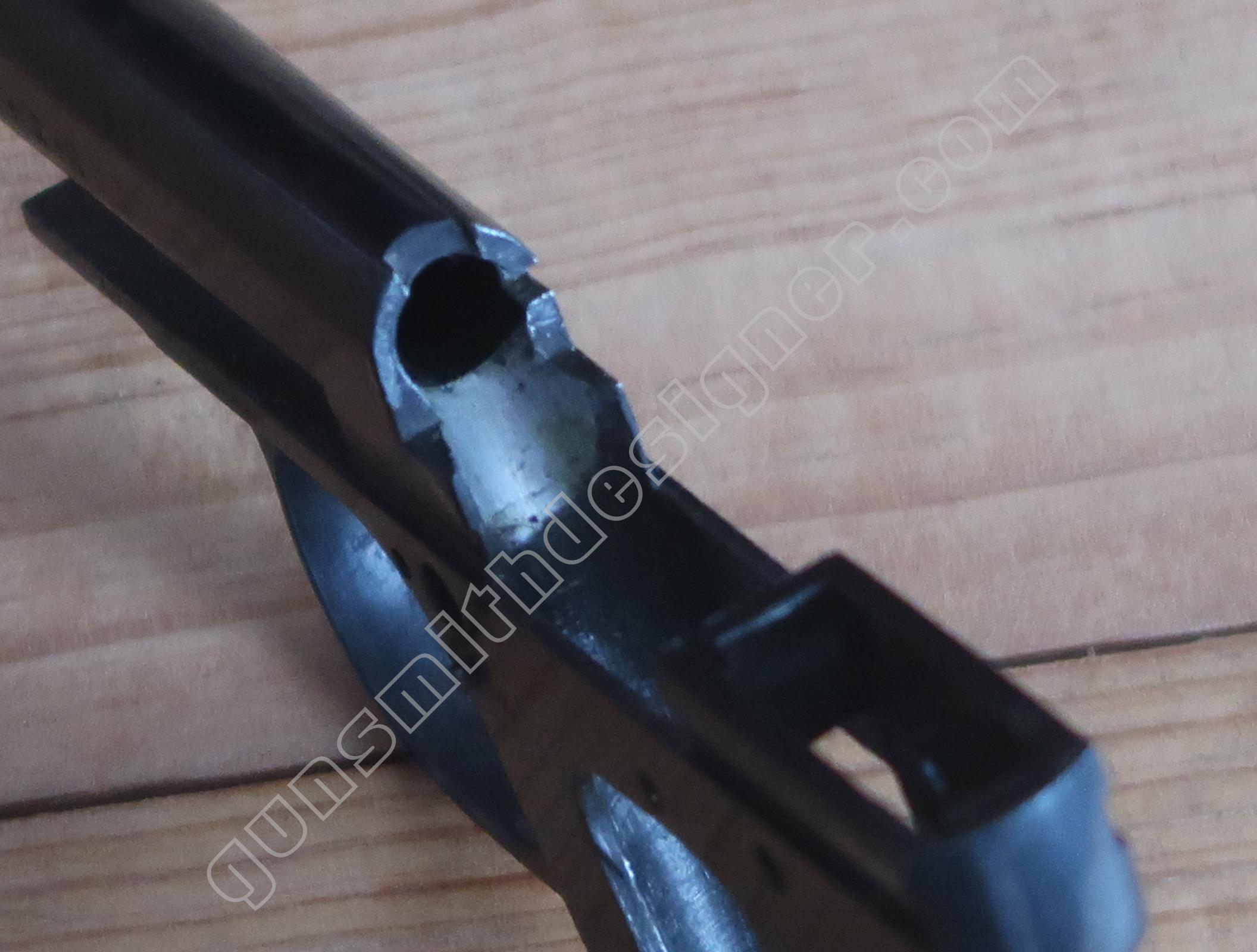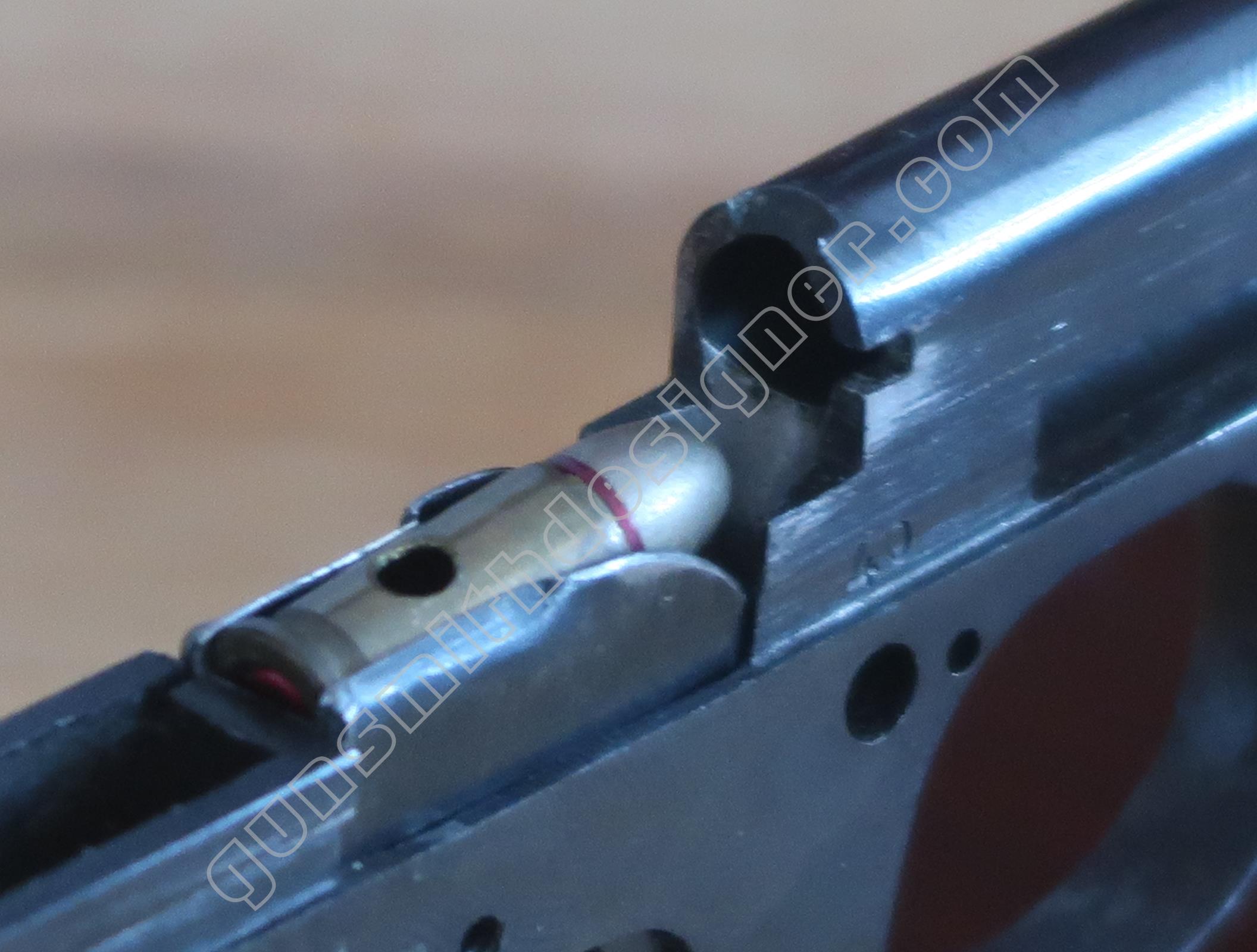 En démontant ce pistolet, je n’ai pas trouvé d’extracteur. Je pense qu’il devait y en avoir un car une encoche semble destinée à cet effet. Cette dernière correspond à une autre encoche à l’entrée de chambre. Peut être a t’il été perdu lors d’un précédent démontage. La largeur du logement d’extracteur (si toutefois il y en a un) : 1,65 mm.