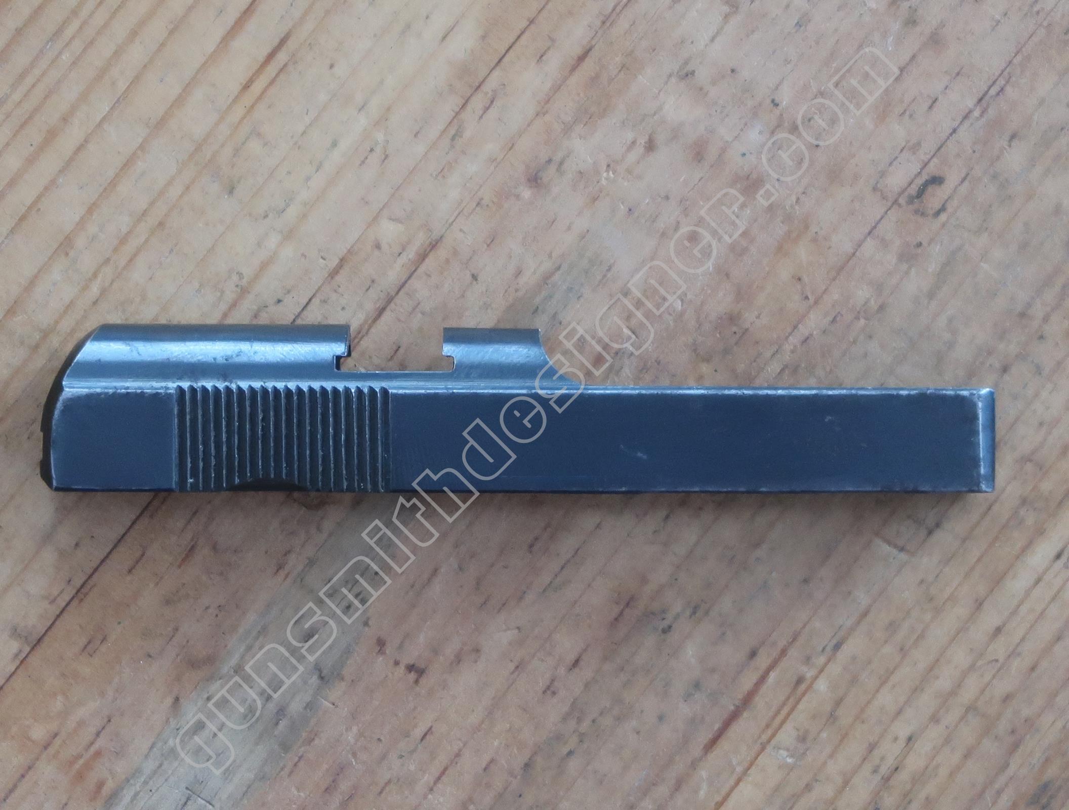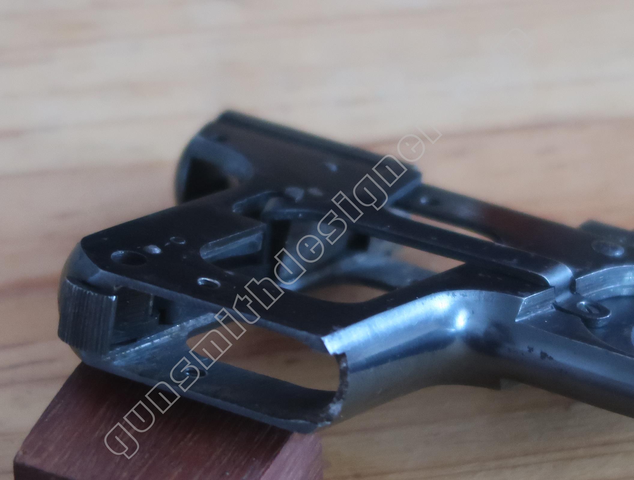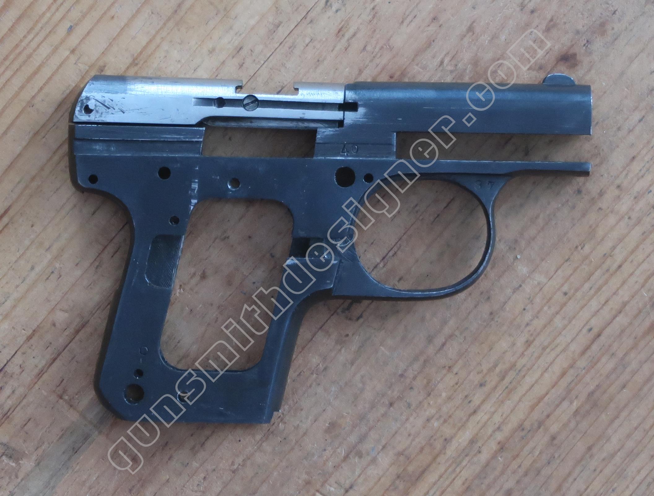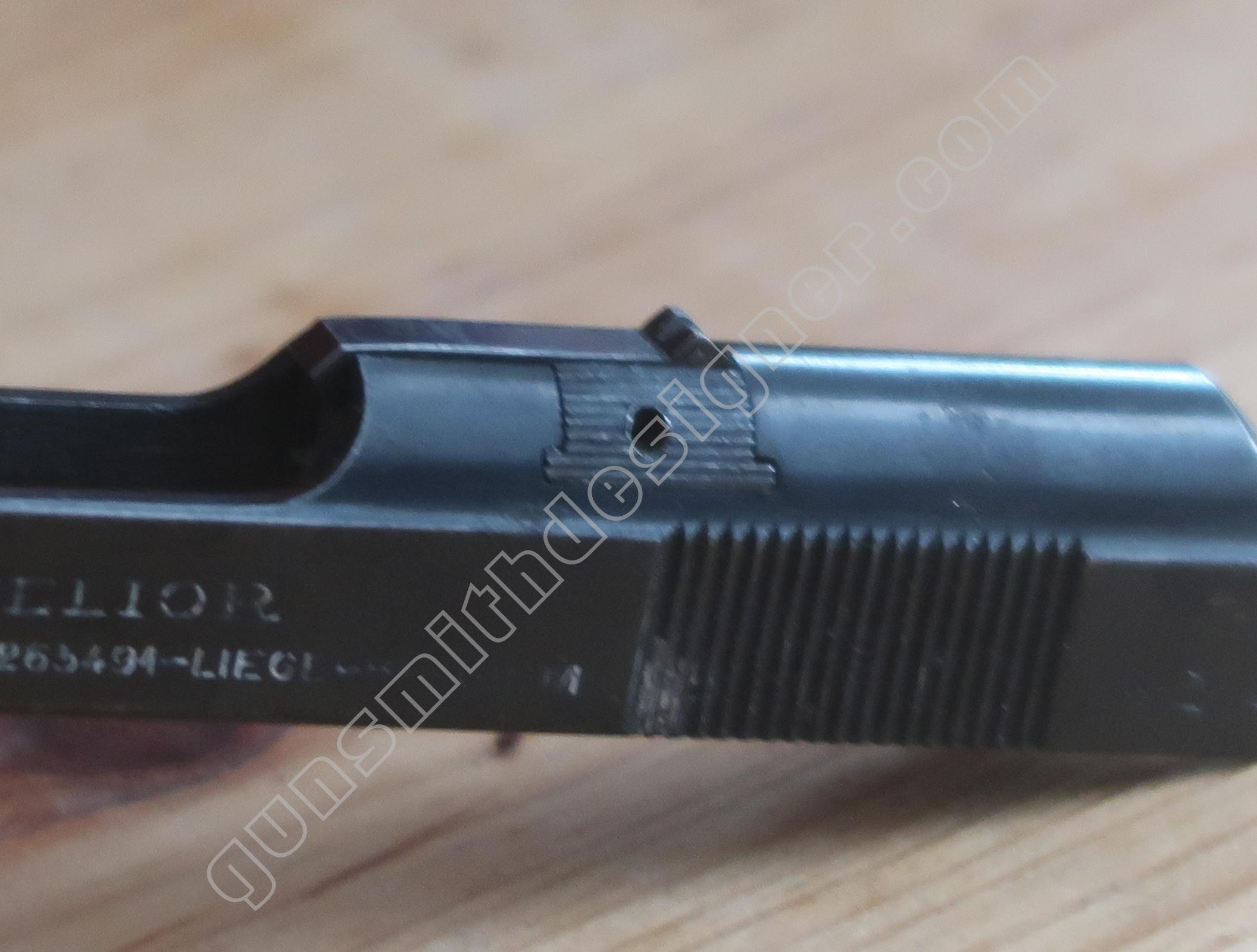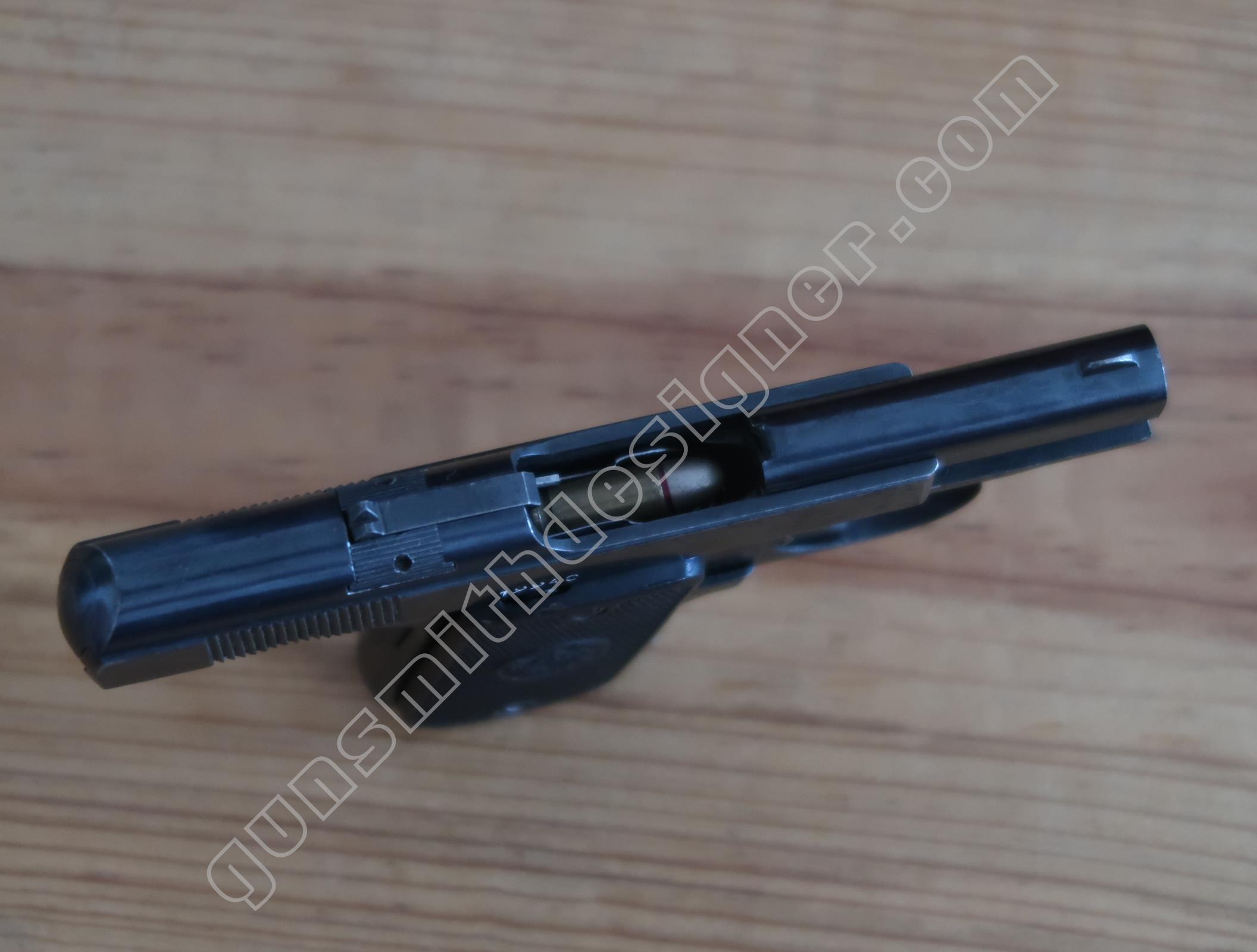 En démontant ce pistolet, je n’ai pas trouvé d’extracteur. Je pense qu’il devait y en avoir un car une encoche semble destinée à cet effet. Cette dernière correspond à une autre encoche à l’entrée de chambre. Peut être a t’il été perdu lors d’un précédent démontage. La largeur du logement d’extracteur (si toutefois il y en a un) : 1,65 mm.