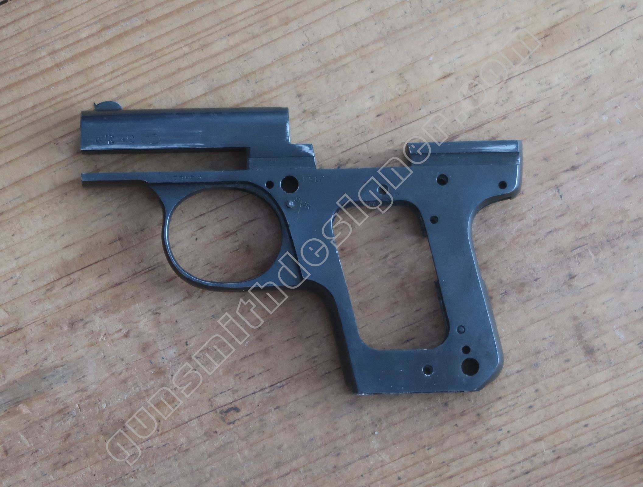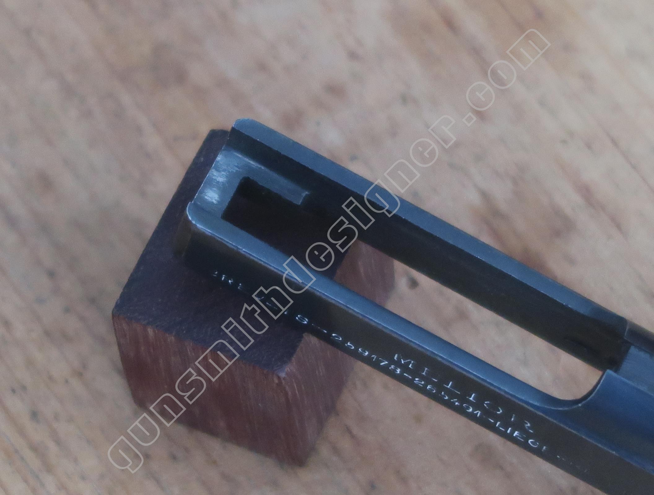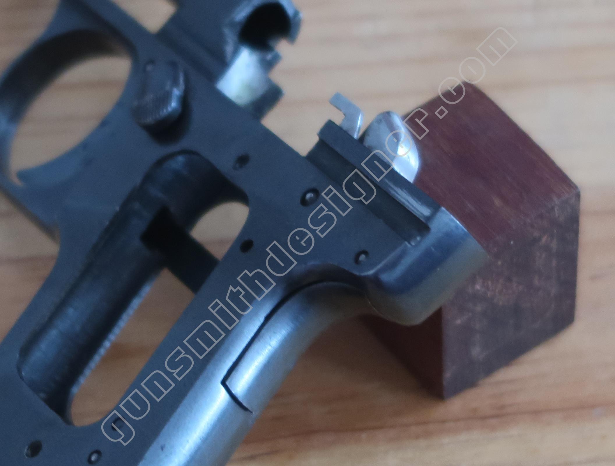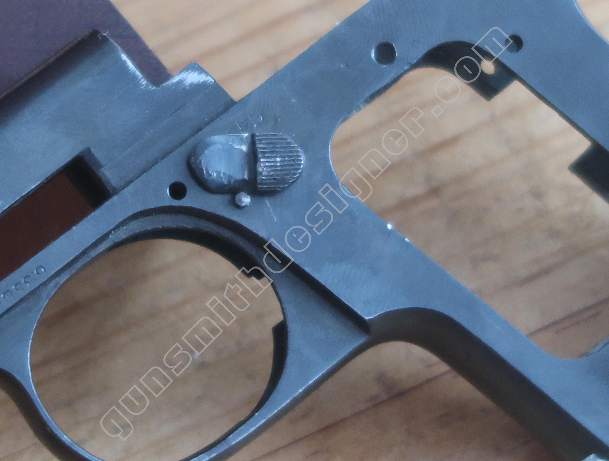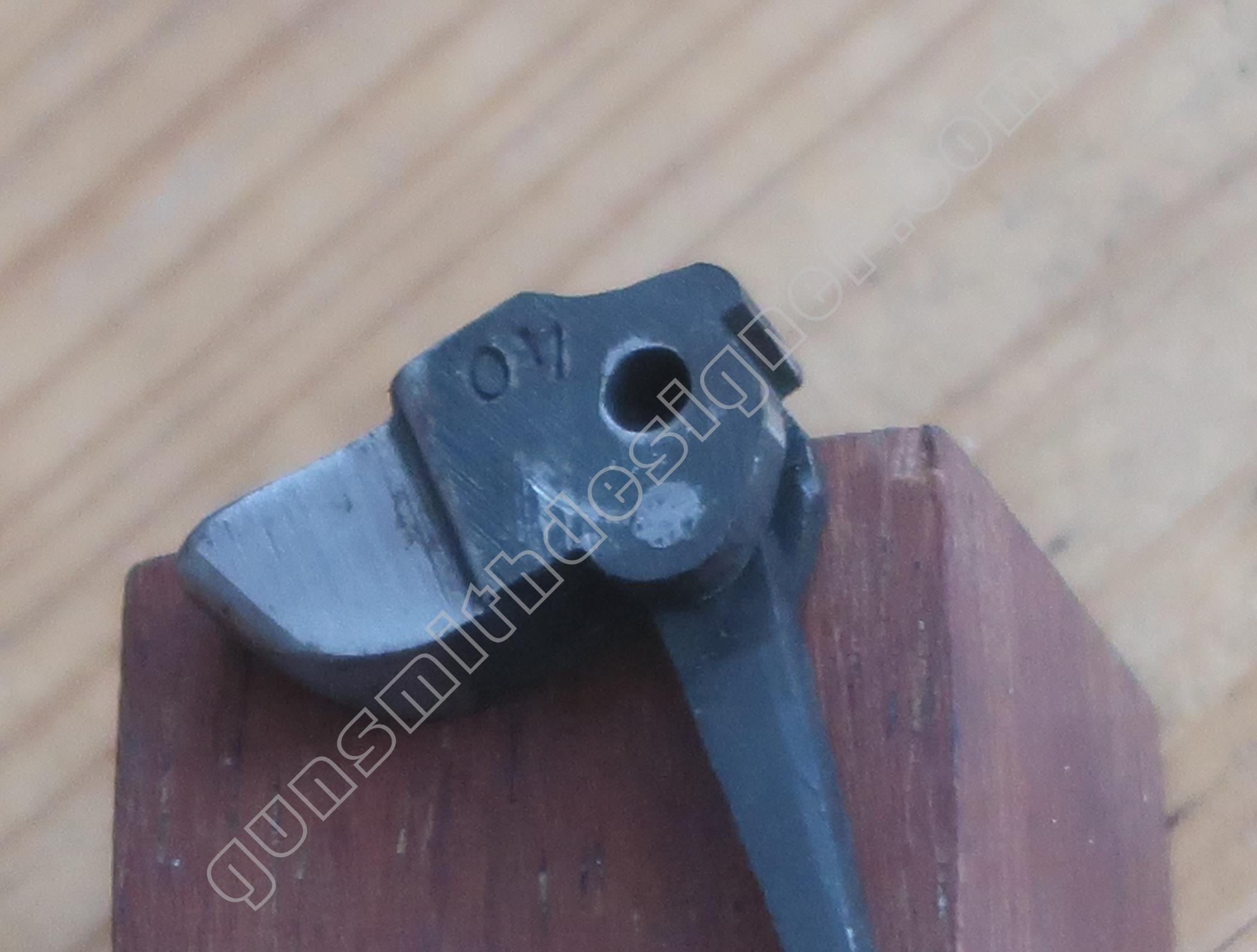En démontant ce pistolet, je n’ai pas trouvé d’extracteur. Je pense qu’il devait y en avoir un car une encoche semble destinée à cet effet. Cette dernière correspond à une autre encoche à l’entrée de chambre. Peut être a t’il été perdu lors d’un précédent démontage. La largeur du logement d’extracteur (si toutefois il y en a un) : 1,65 mm.