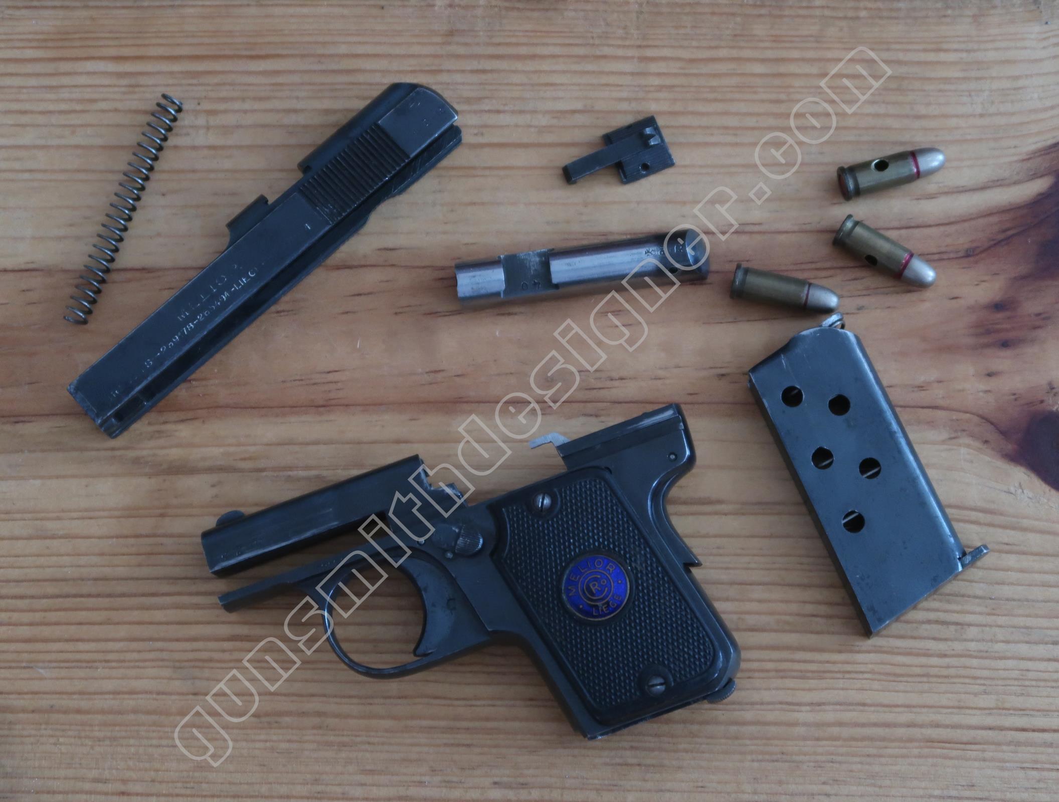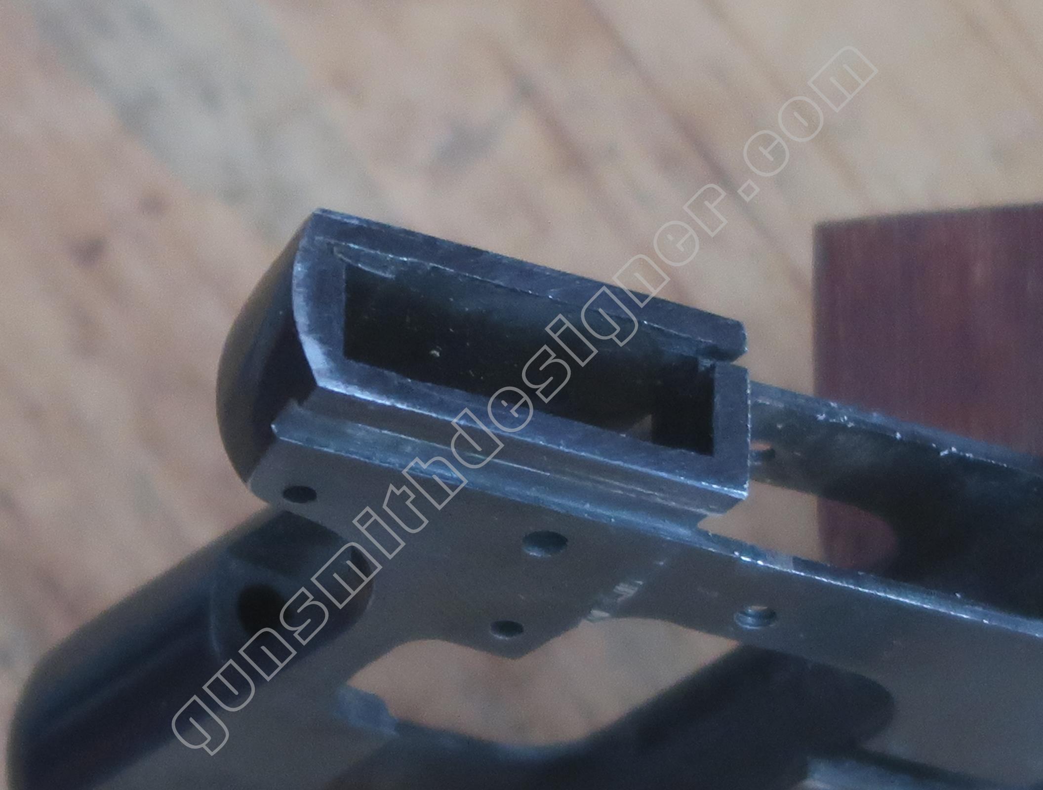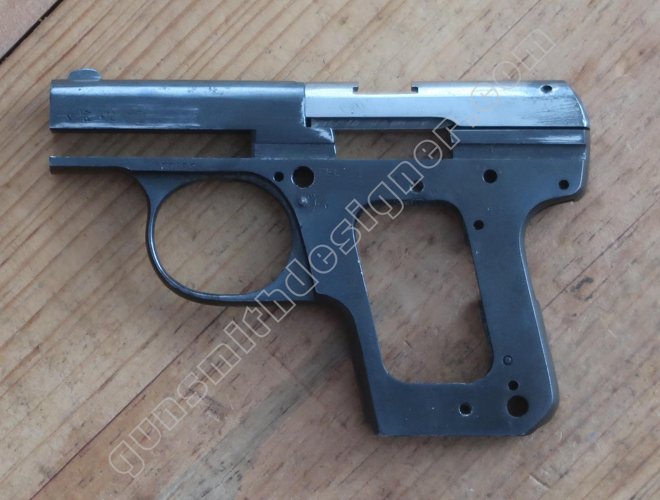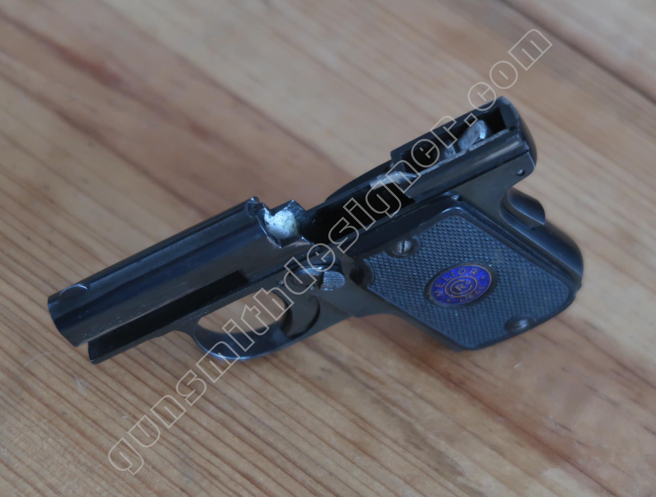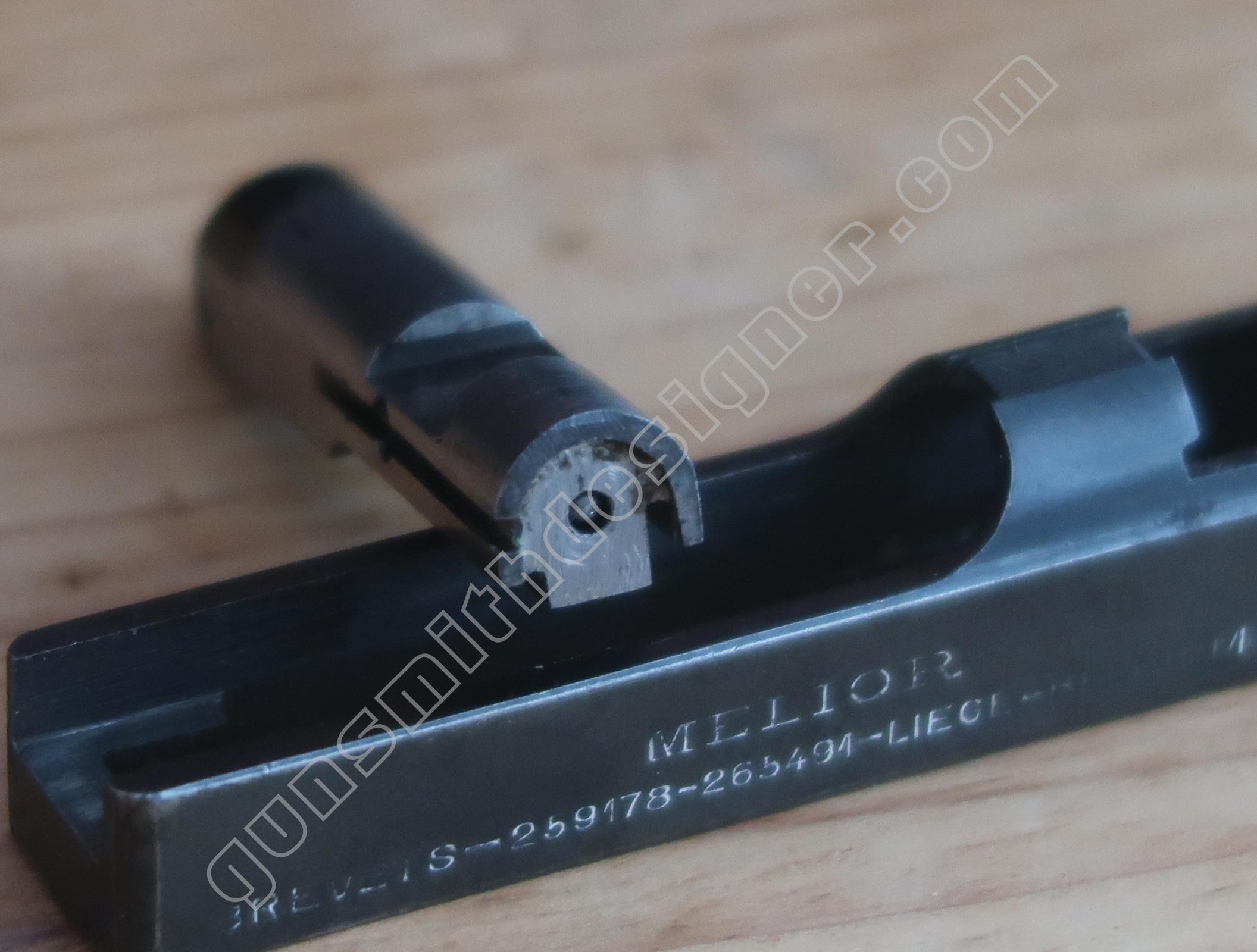 En démontant ce pistolet, je n’ai pas trouvé d’extracteur. Je pense qu’il devait y en avoir un car une encoche semble destinée à cet effet. Cette dernière correspond à une autre encoche à l’entrée de chambre. Peut être a t’il été perdu lors d’un précédent démontage. La largeur du logement d’extracteur (si toutefois il y en a un) : 1,65 mm.