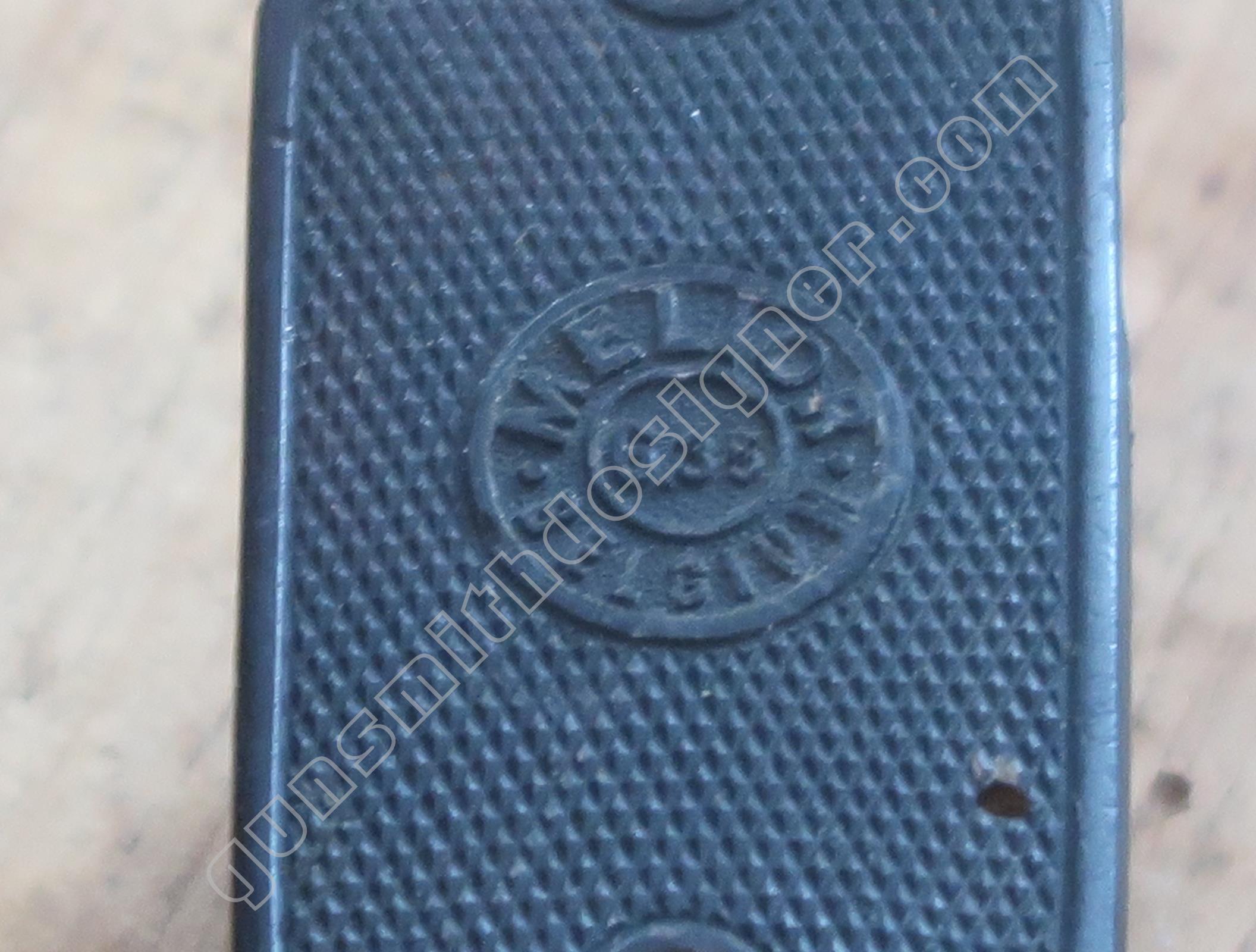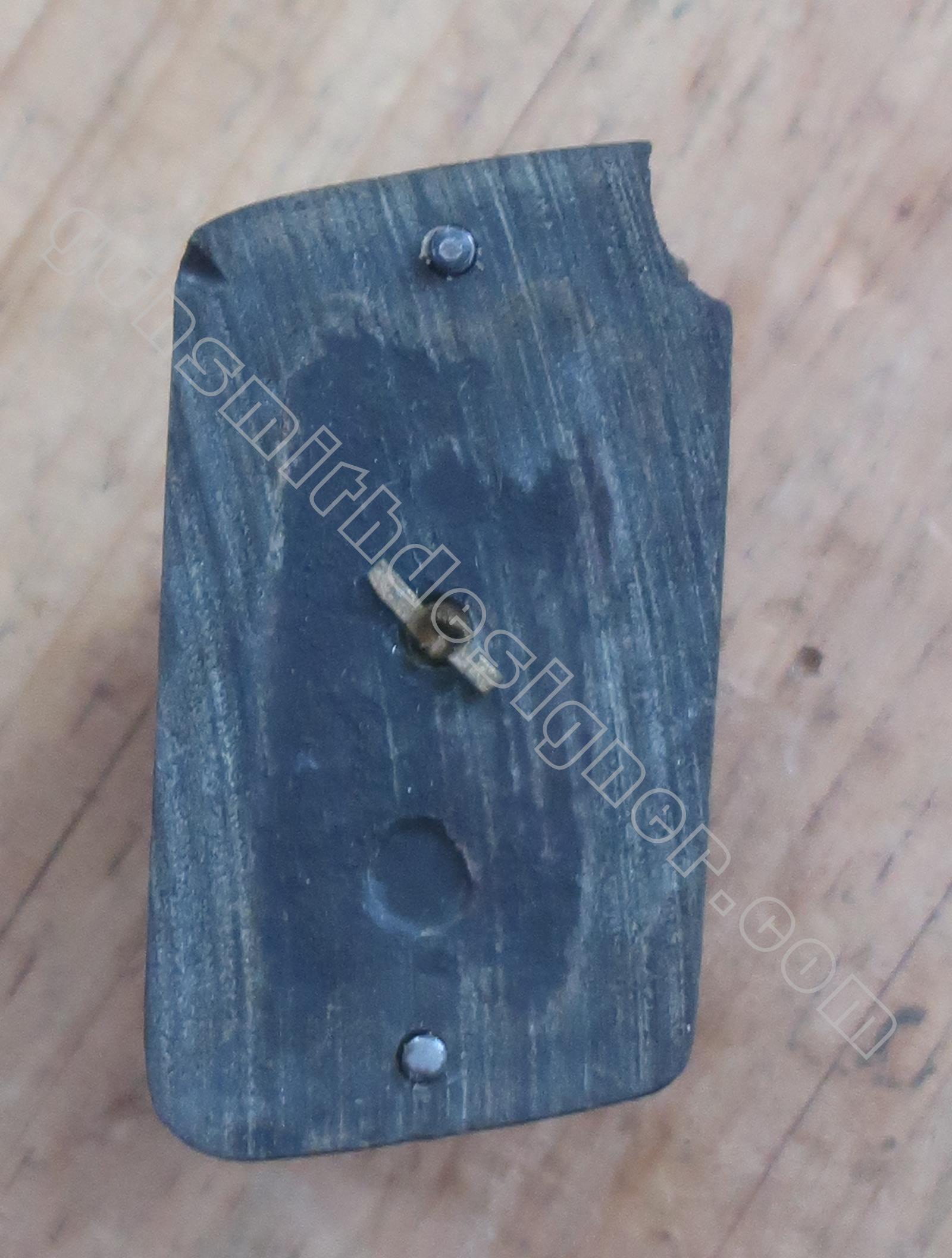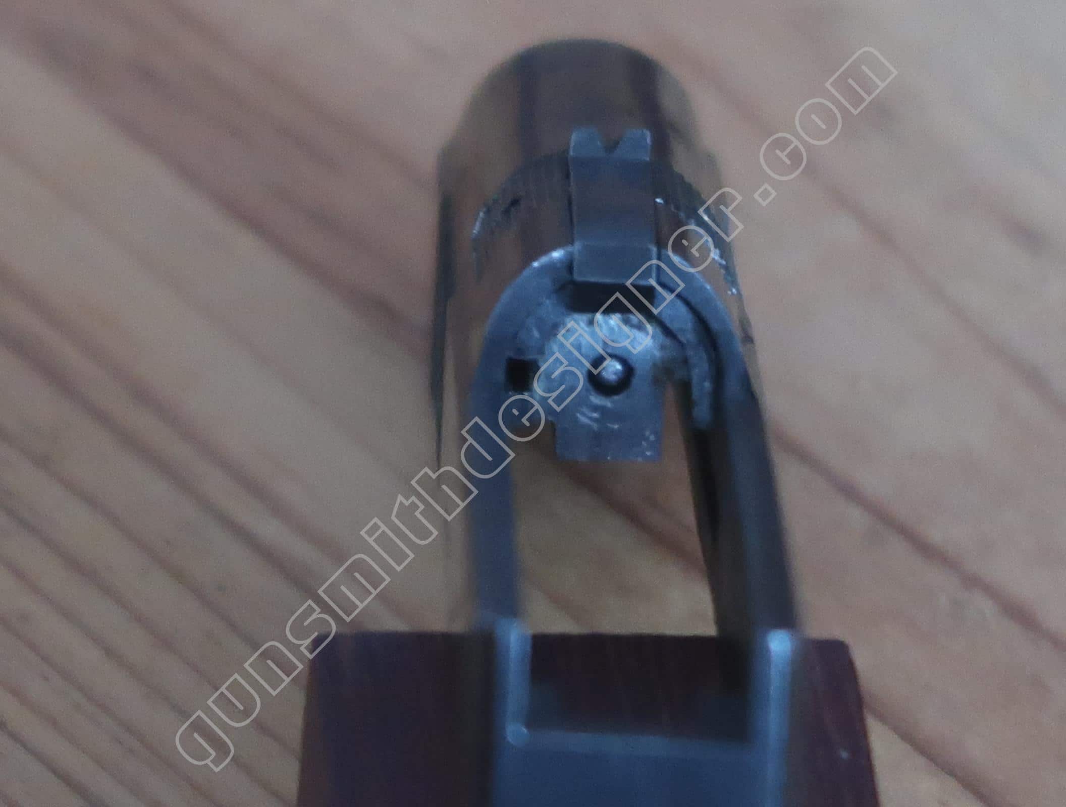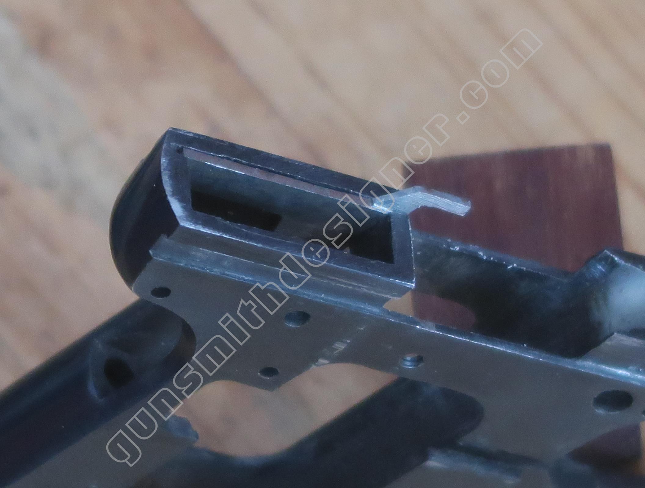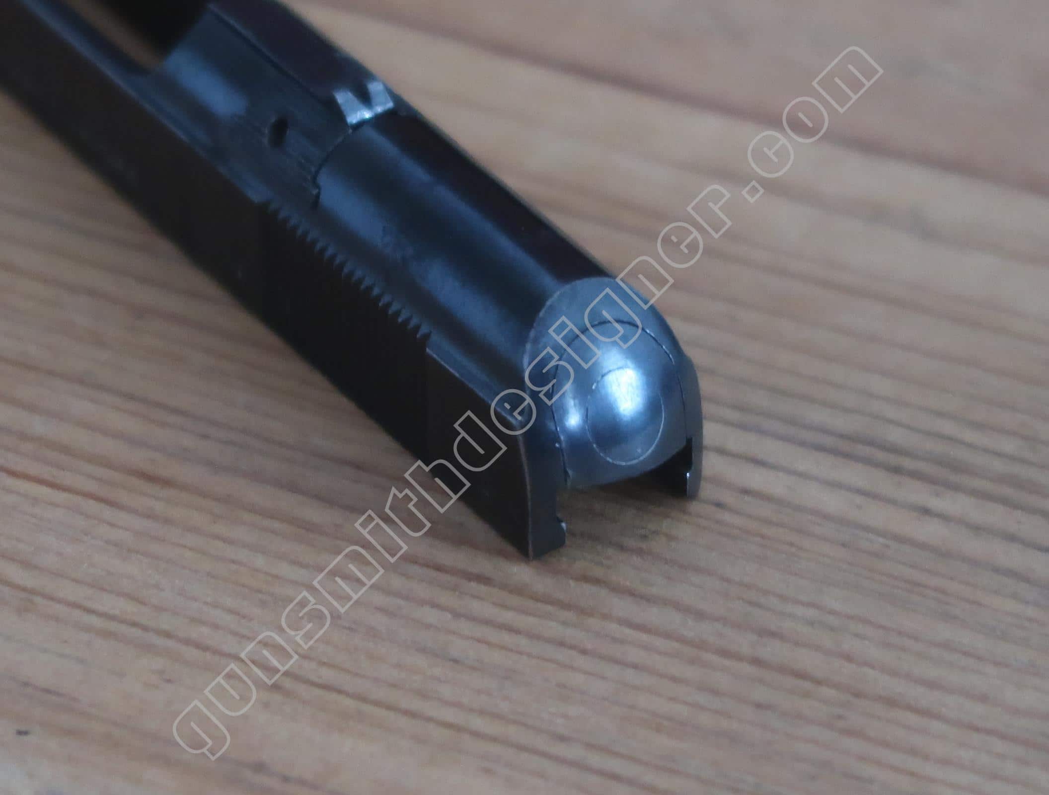 En démontant ce pistolet, je n’ai pas trouvé d’extracteur. Je pense qu’il devait y en avoir un car une encoche semble destinée à cet effet. Cette dernière correspond à une autre encoche à l’entrée de chambre. Peut être a t’il été perdu lors d’un précédent démontage. La largeur du logement d’extracteur (si toutefois il y en a un) : 1,65 mm.