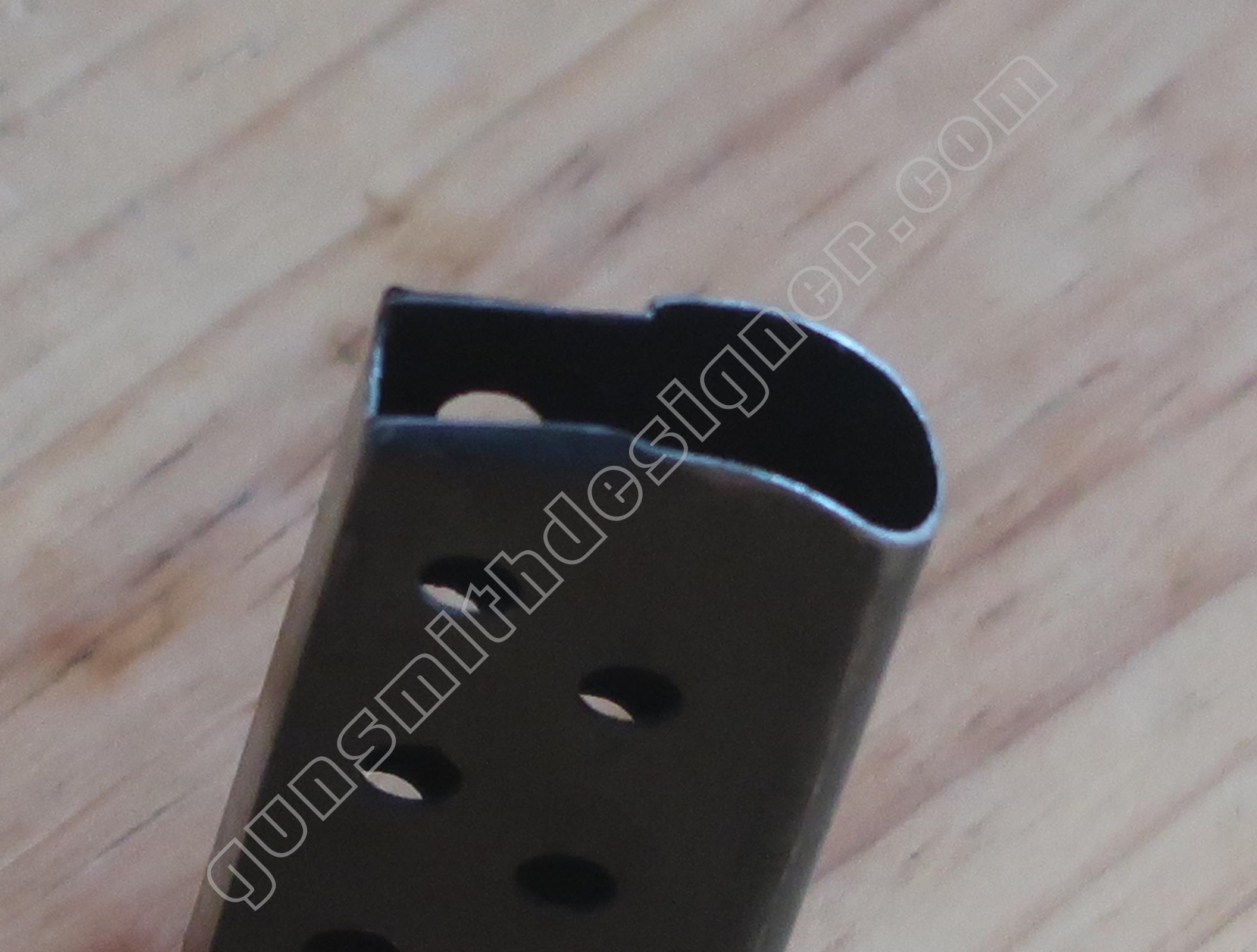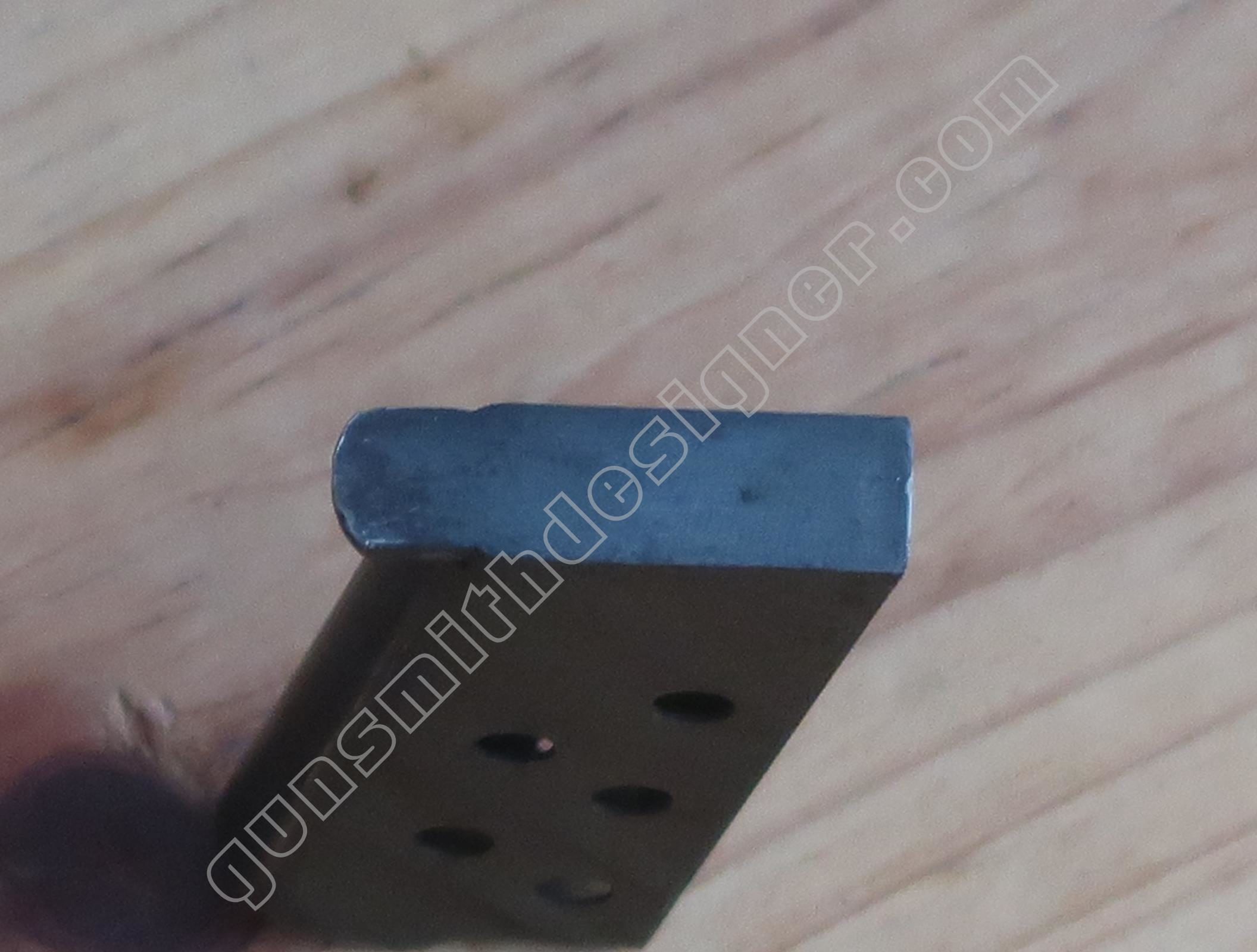 L’éjecteur est taillé dans une fine tôle d’acier de 1,1 mm d’épaisseur. Il dépasse de 3,4 mm au dessus de la carcasse.