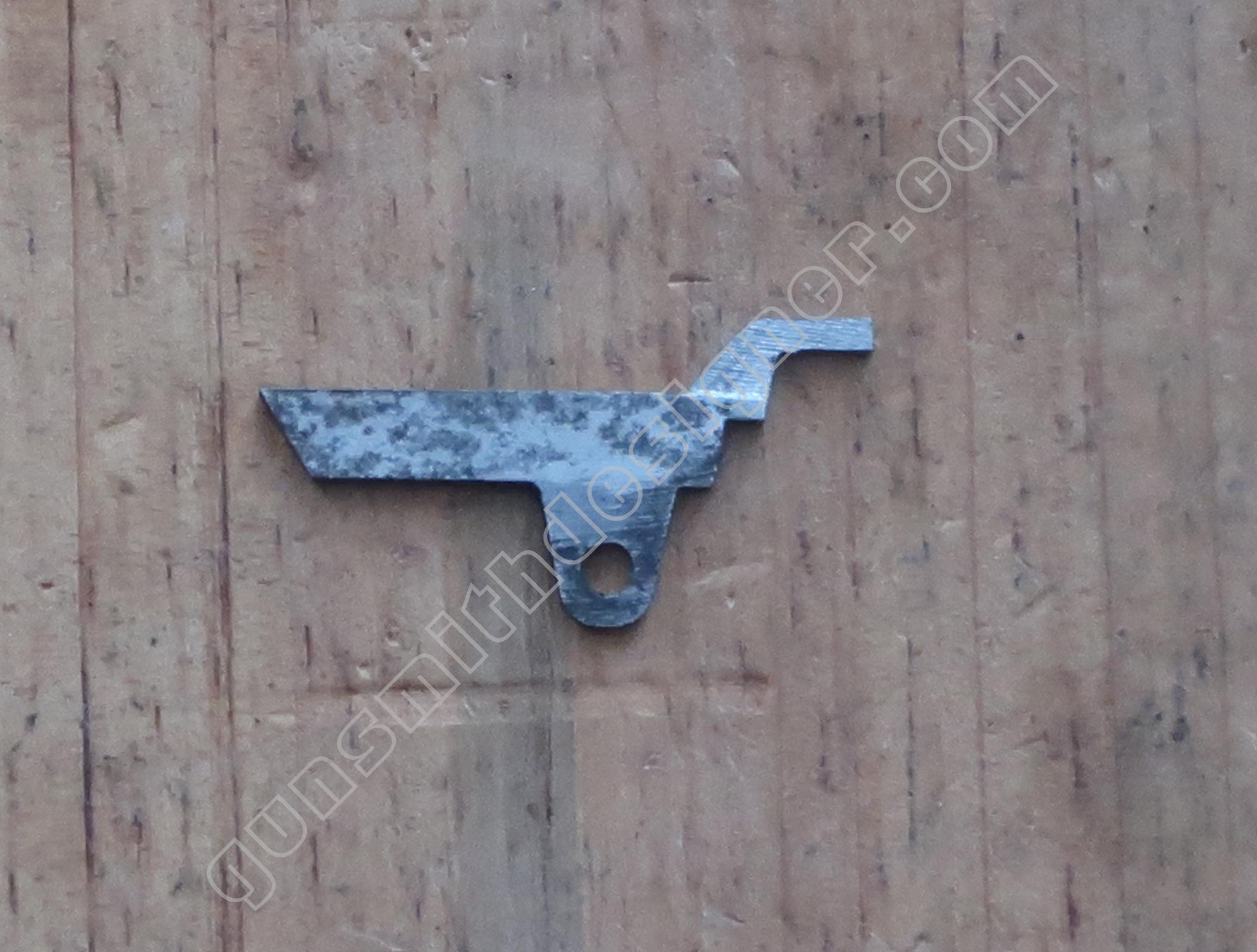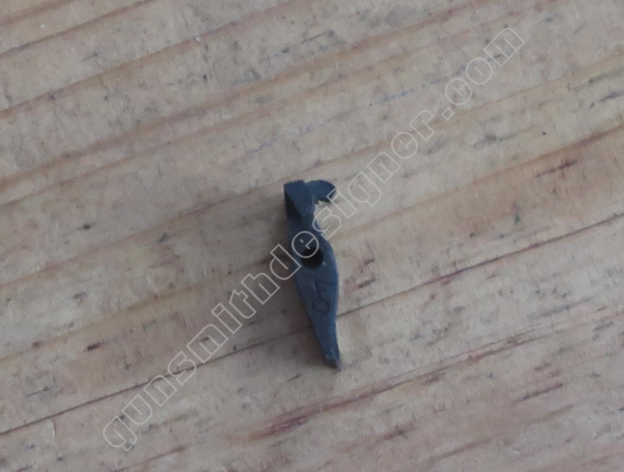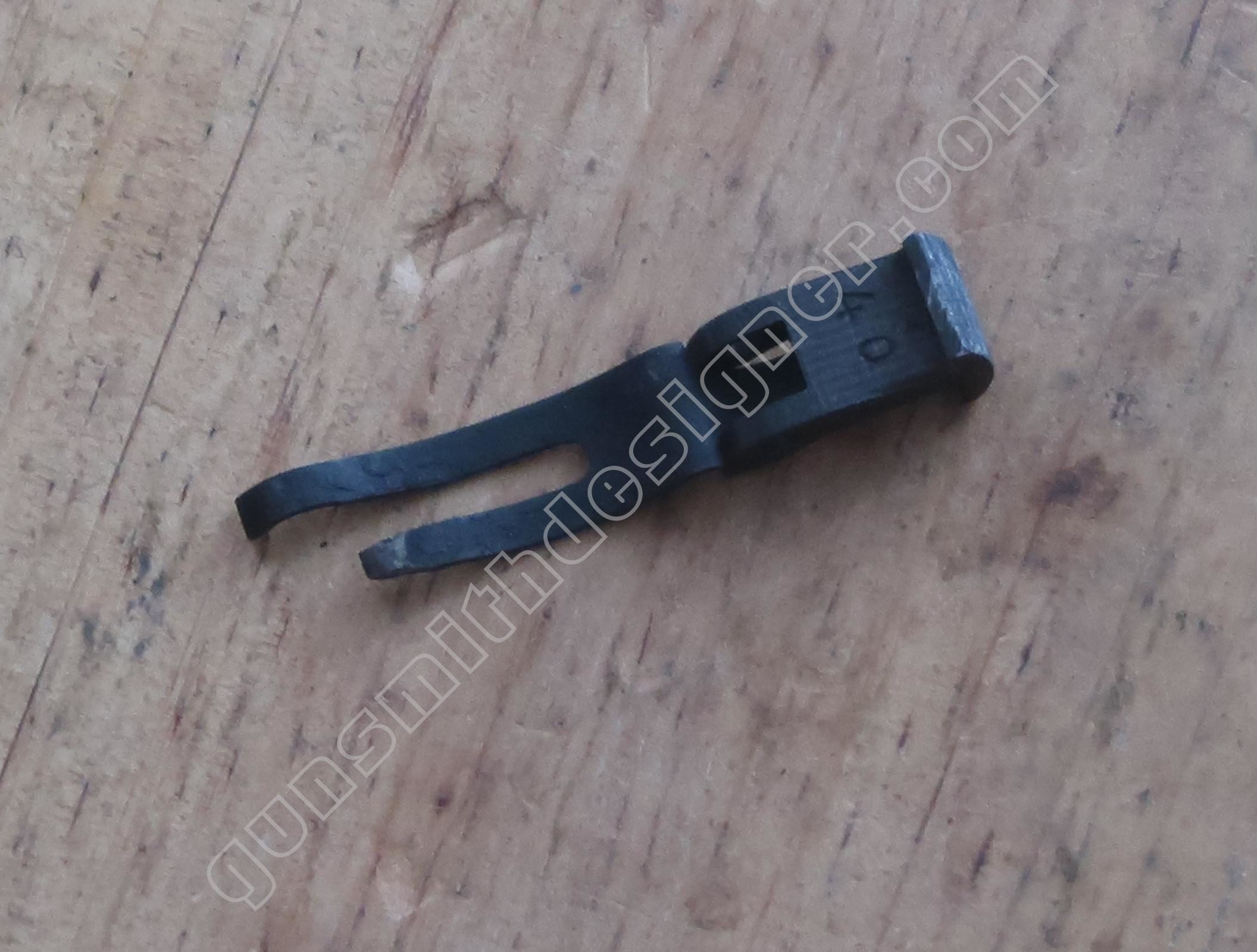 La barrette/séparateur est une tôle de 1,2 mm matricée. Selon la position de la culasse, elle fait ou pas la liaison entre la queue de détente et la gâchette. La barrette/séparateur est attelée sur la queue de détente par une petite vis sans tête. Il est utile d’ôter la vis pour extraire la barrette/séparateur.