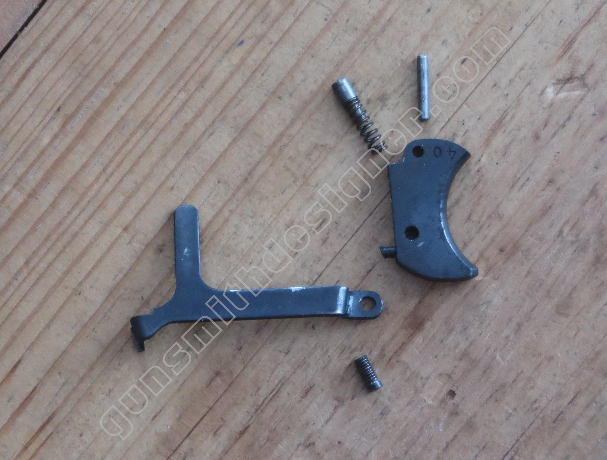 Le ressort à lame agit sur trois pièces : la gâchette, la barrette/séparateur, l’arrêtoir de chargeur.