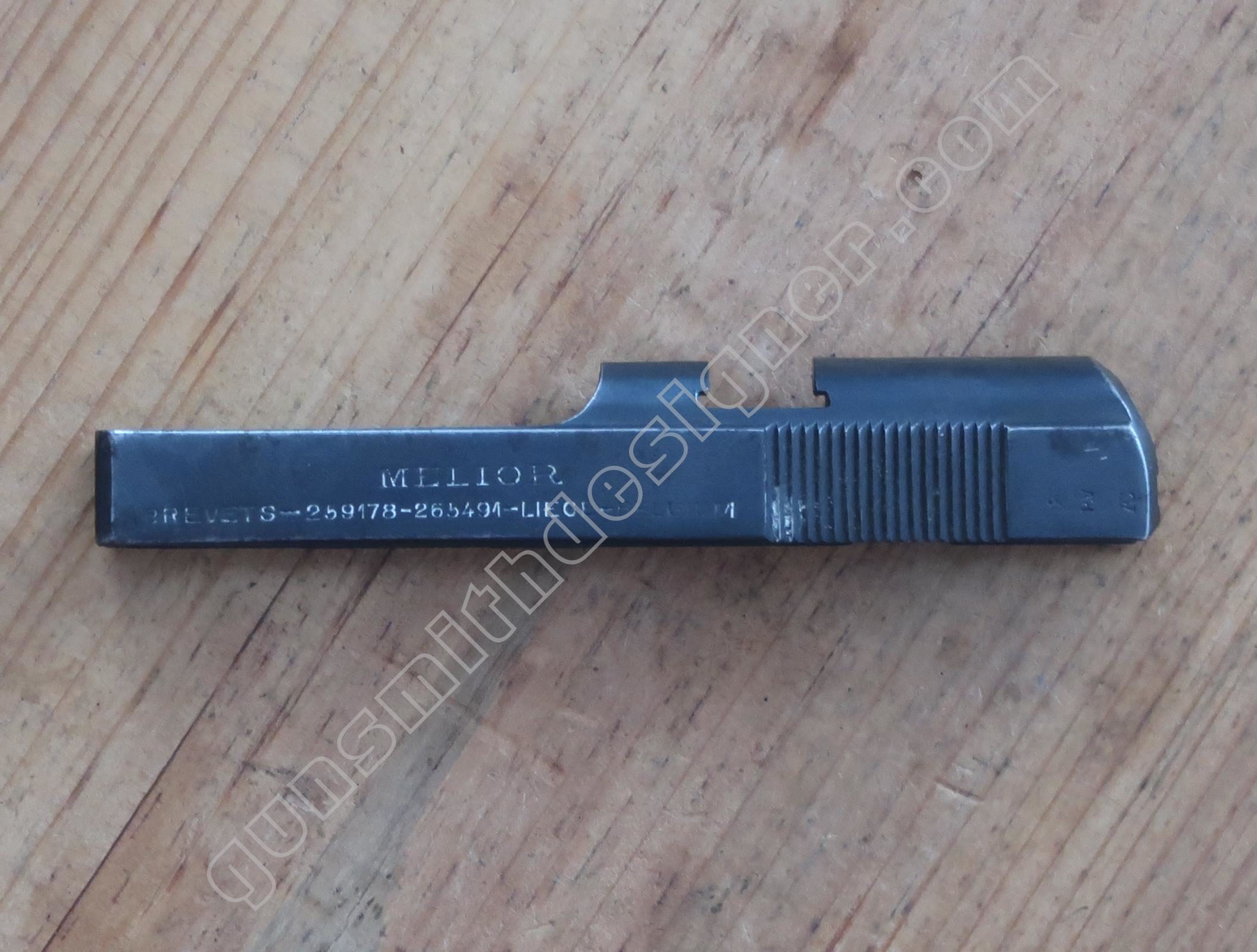 Dans l’immense majorité des cas, la culasse des pistolets automatiques est en une seule partie. Sur le pistolet Mélior, la culasse comprend deux pièces principales et une clavette d’assemblage. C’est un autre cas de simplification par la division dont nous parlons souvent sur le site.