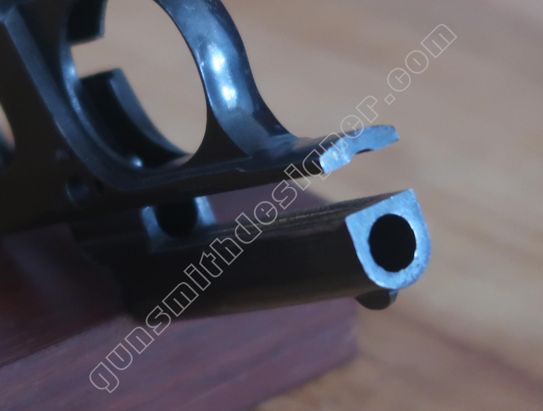Le canon fait parti de la carcasse. Il mesure : 48 mm. Le culot de la munition dépasse de 1,14 mm de l’arrière de la chambre. Le canon porte le guidon, il est usiné dessus.