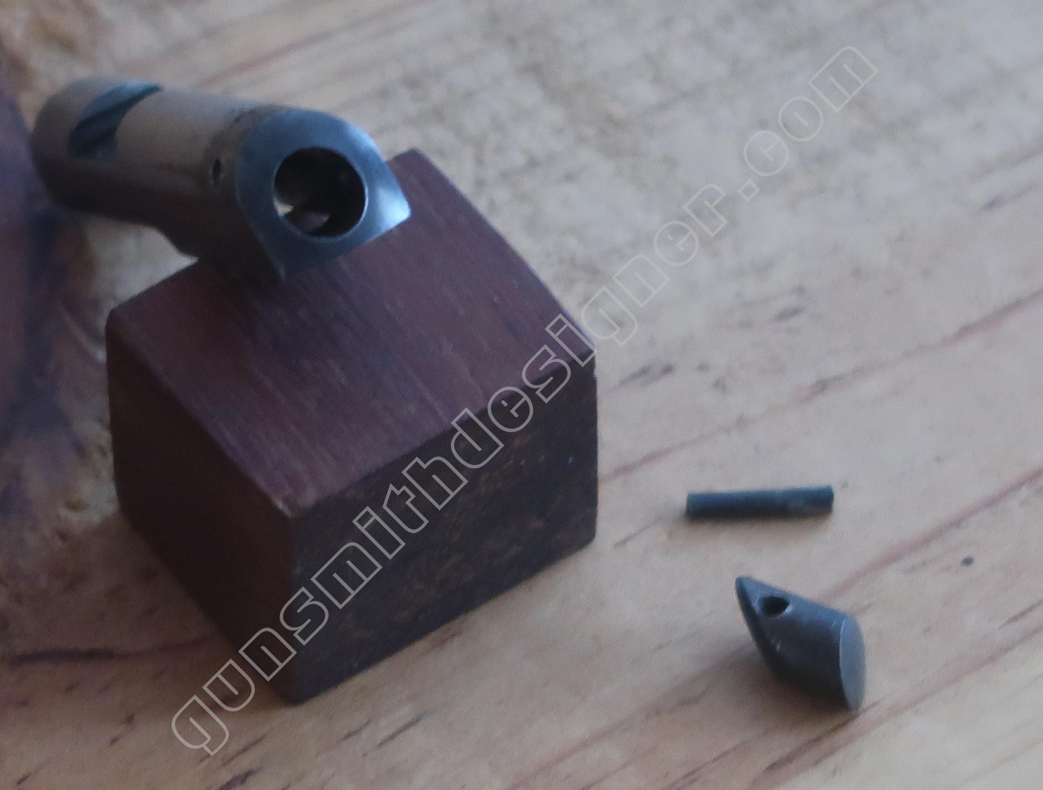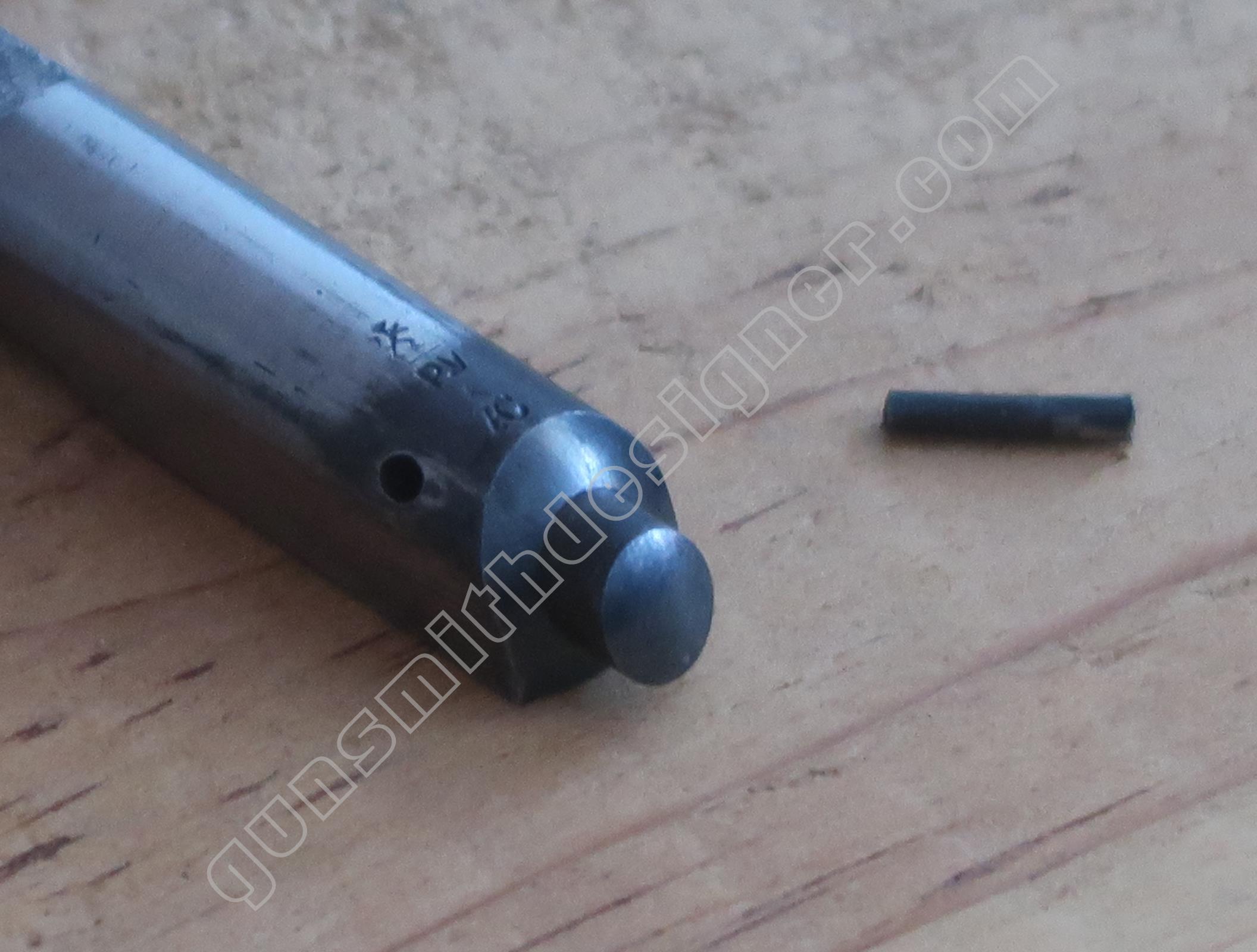 Le bouchon arrière occulte le trou qu’il a été nécessaire de percer pour obtenir le logement du percuteur. Si l’on souhaite démonter le percuteur de la cuvette de tir, il faudra au préalable extraire le bouchon arrière. Le diamètre du bouchon arrière : 6 mm. Il est tenu par une goupille de 1,9 mm de diamètre.