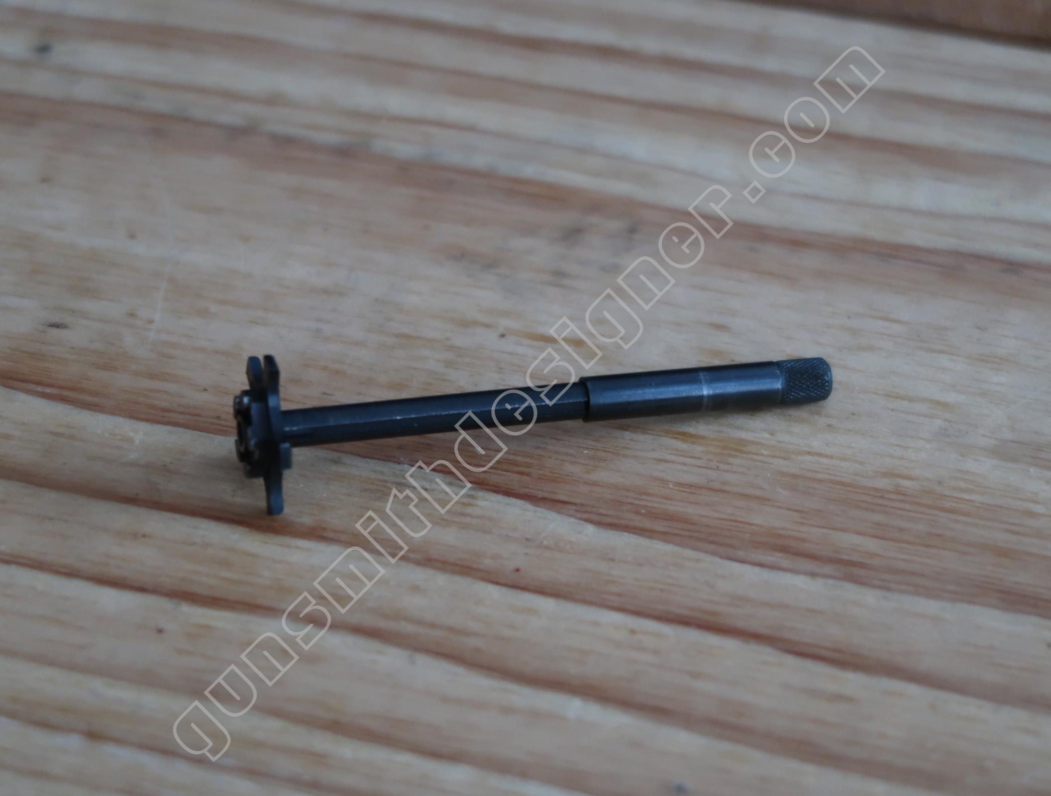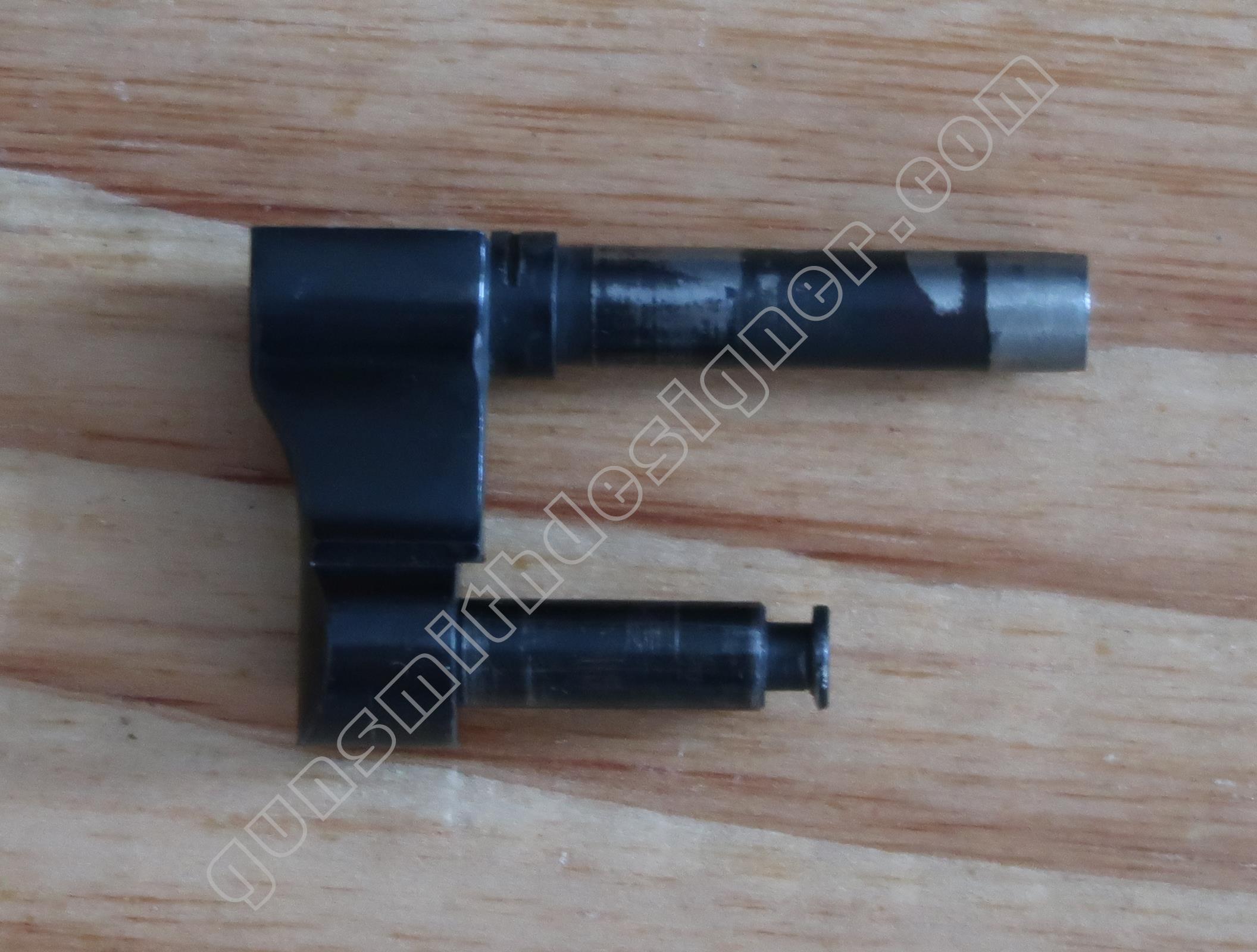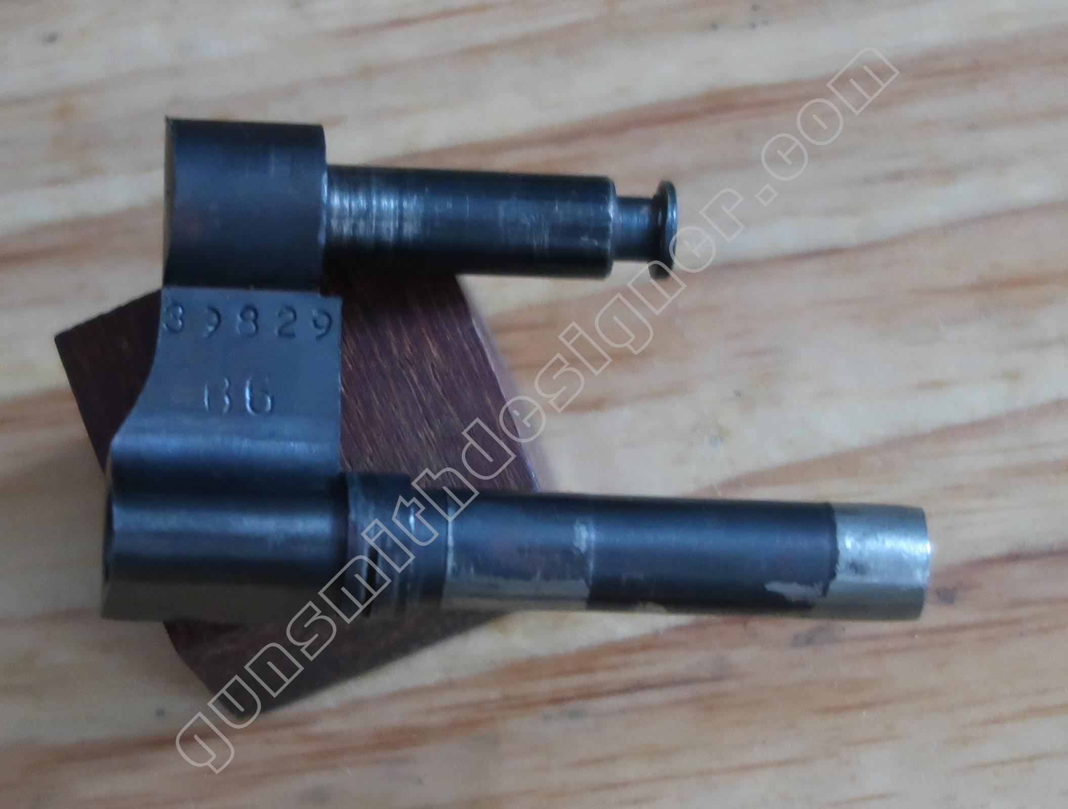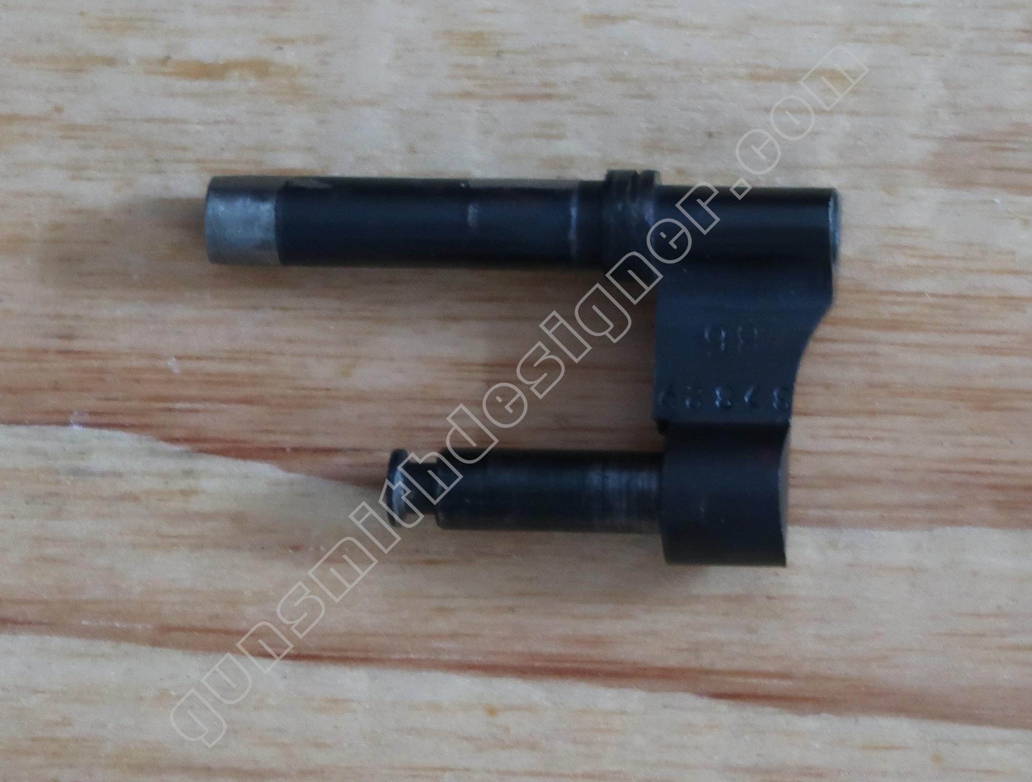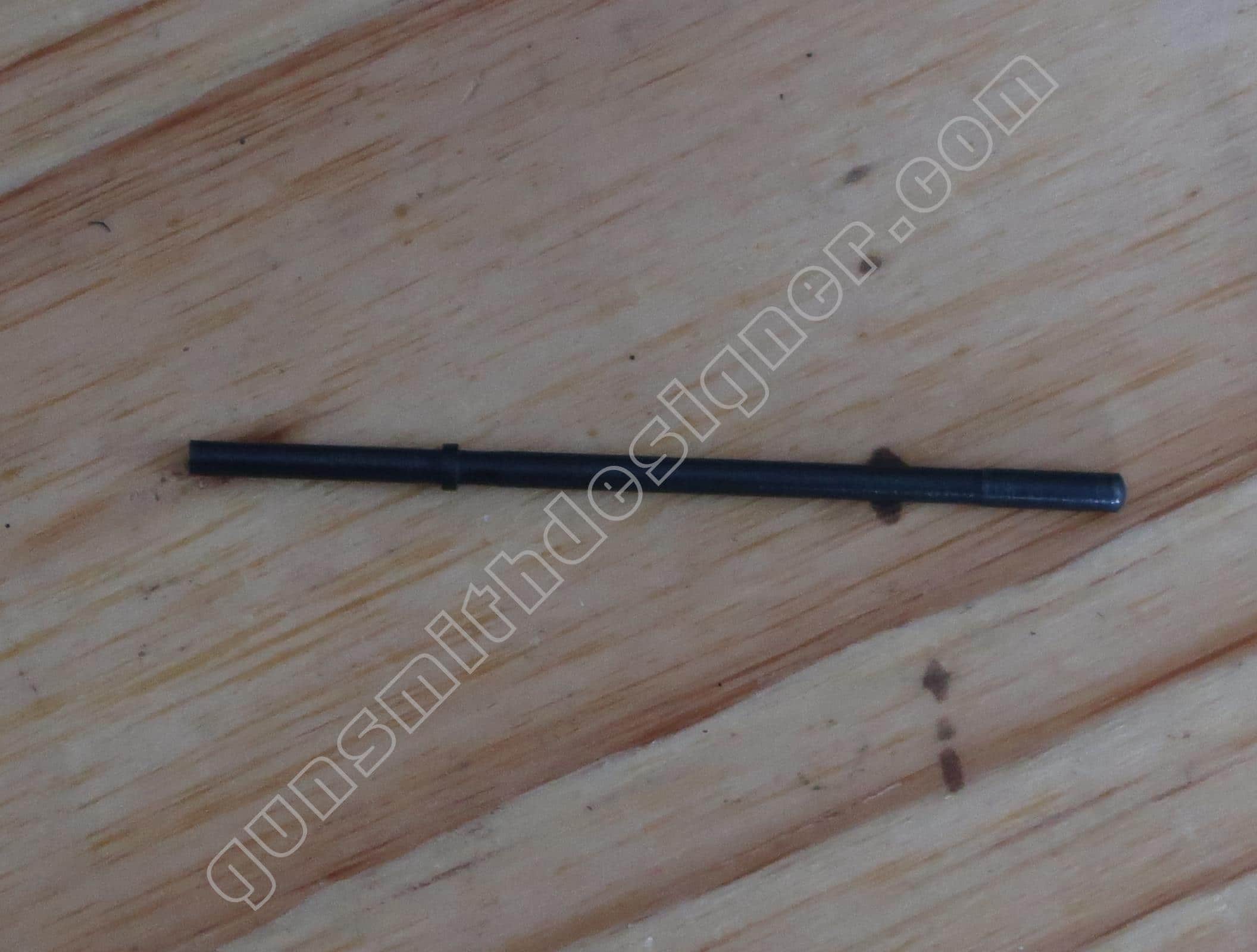 Le verrou de barillet au basculage est en acier. Il s’agit d’une tige étagée. Le diamètre de l’avant (le verrou sur la carcasse) est : 3,2 mm. La longueur de la pièce est : 74 mm. Son diamètre max : 3,8 mm.